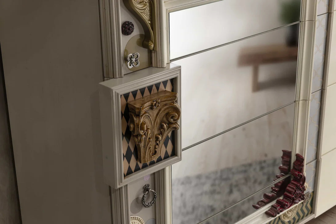 Art. 33172 Length: 130 cm Depth: 50 cm Height: 100 cm This chest of drawers is a true tribute to artisanal creativity. Composed of four drawers of varying sizes, its design blends classic and modern elements to create a unique piece. The left side features an integrated decorative mirror that not only visually expands the space but also adds an unexpected touch. The detailed surface and ornamental finishes highlight the masterful craftsmanship, while the mix of materials and textures invites you to admire every detail. Ideal for those seeking a piece that combines function and personal style, transforming any bedroom or living room into a sophisticated and unique space. Customizable in size and finish.