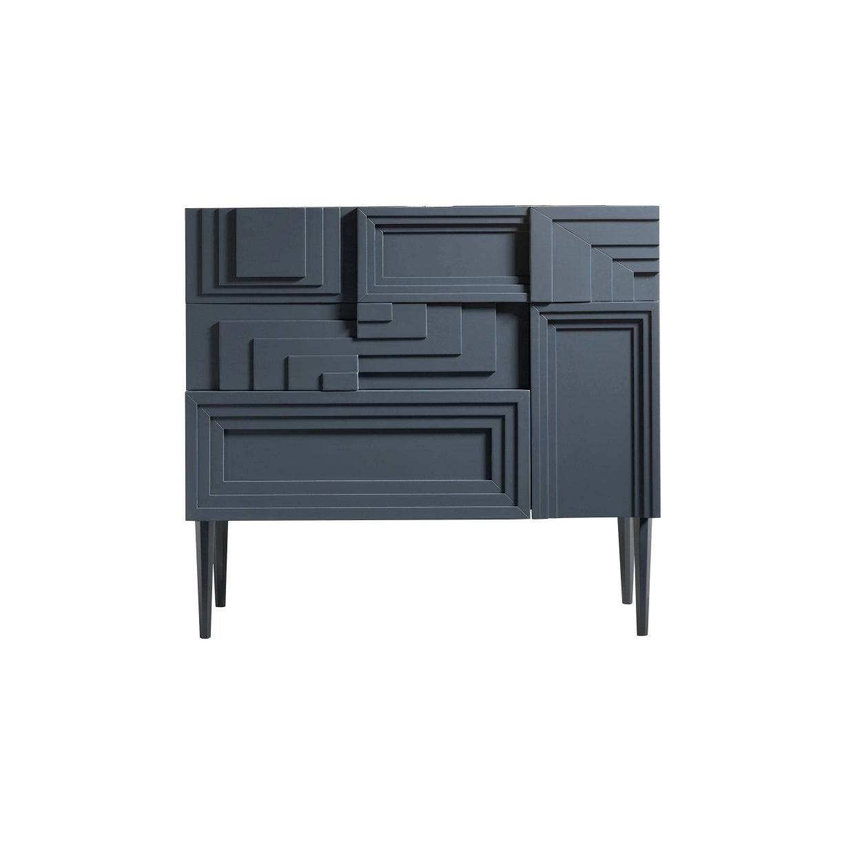 Art. DL01 Length: 110 cm Depth: 45.5 cm Height: 100 cm Endless pieces that recreate the natural harmony found in geometric precision. They bring a distinction and elegance capable of filling a space on their own. Geometric design is the key to making the Totem series the perfect complement to minimalist décor. The Totem series can be manufactured in natural walnut veneer or can be lacquered in any of the colors in our catalog to suit any existing range or style. Three drawers and a door are hidden beneath its geometric pattern.