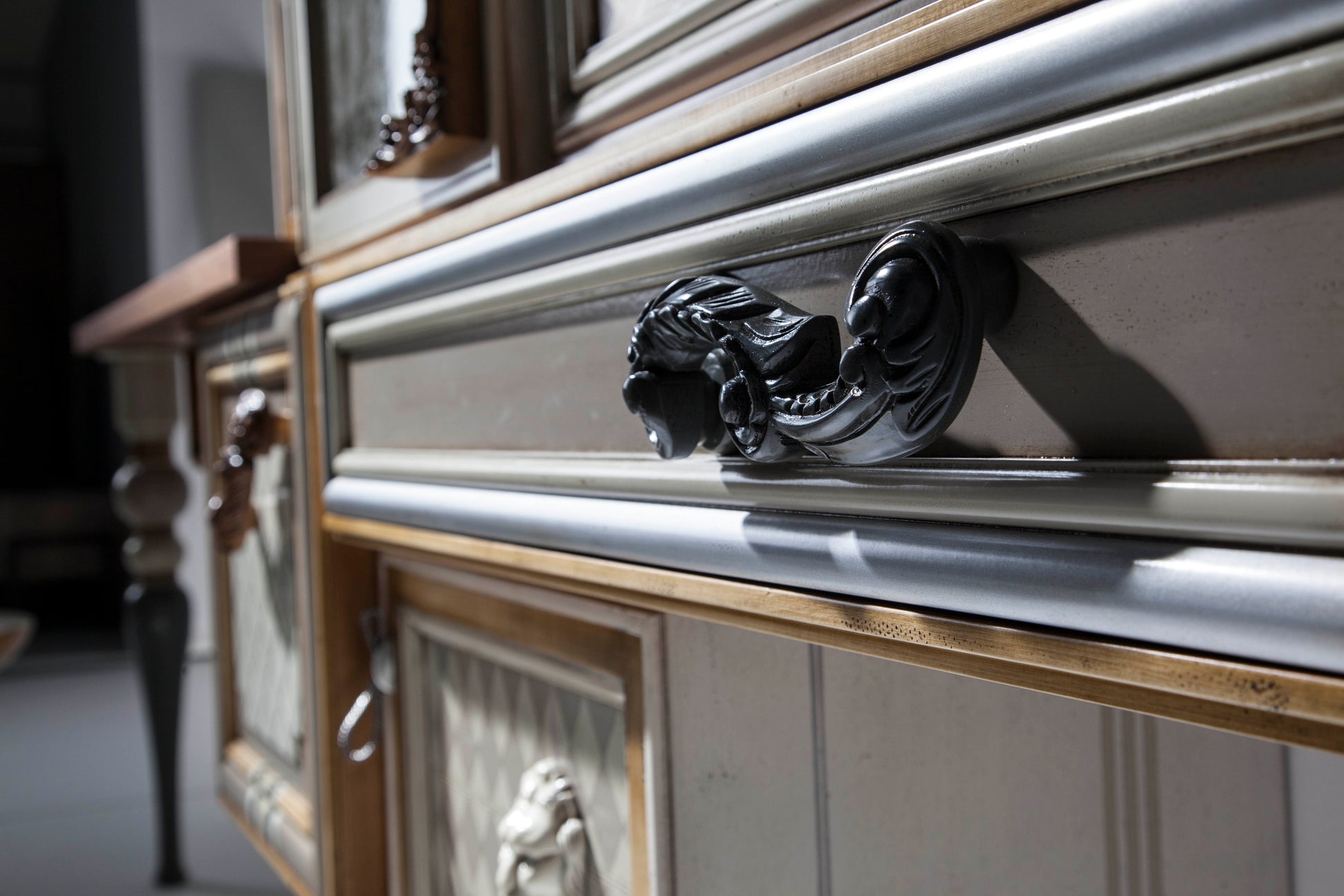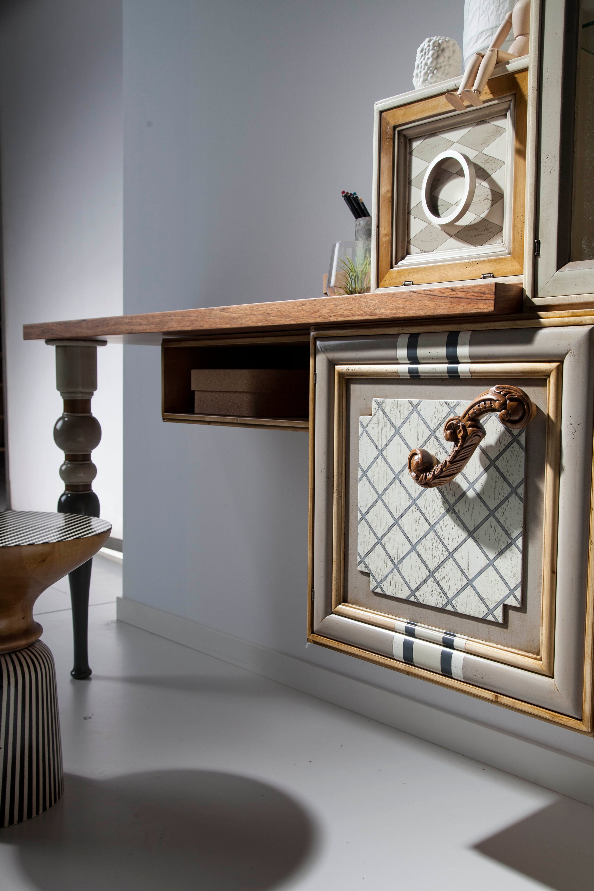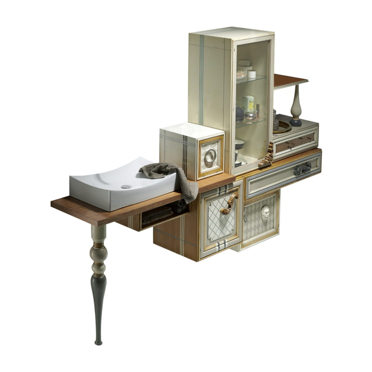 Art. One A Length: 250 cm Depth: 45 cm Height: 180 cm An invitation to the most delicate and exquisite design, also in the bathroom. A suspended unit with four doors and two drawers, with a countertop to accommodate the sink. And made to measure for your space, however small or large. Harmony for an already balanced whole, adorned on all four sides with precious little details that transform whimsy into a latent need for concrete expression.