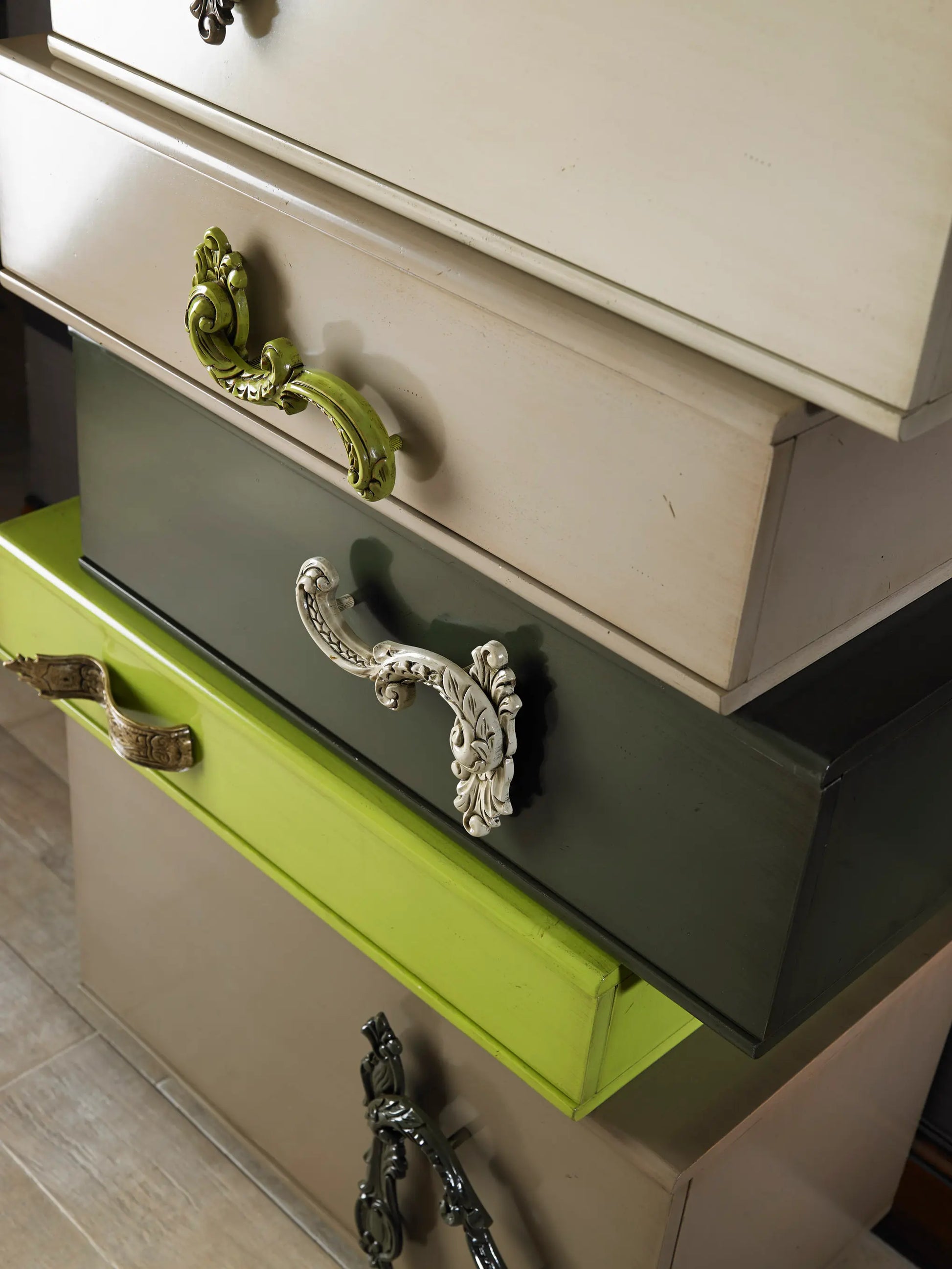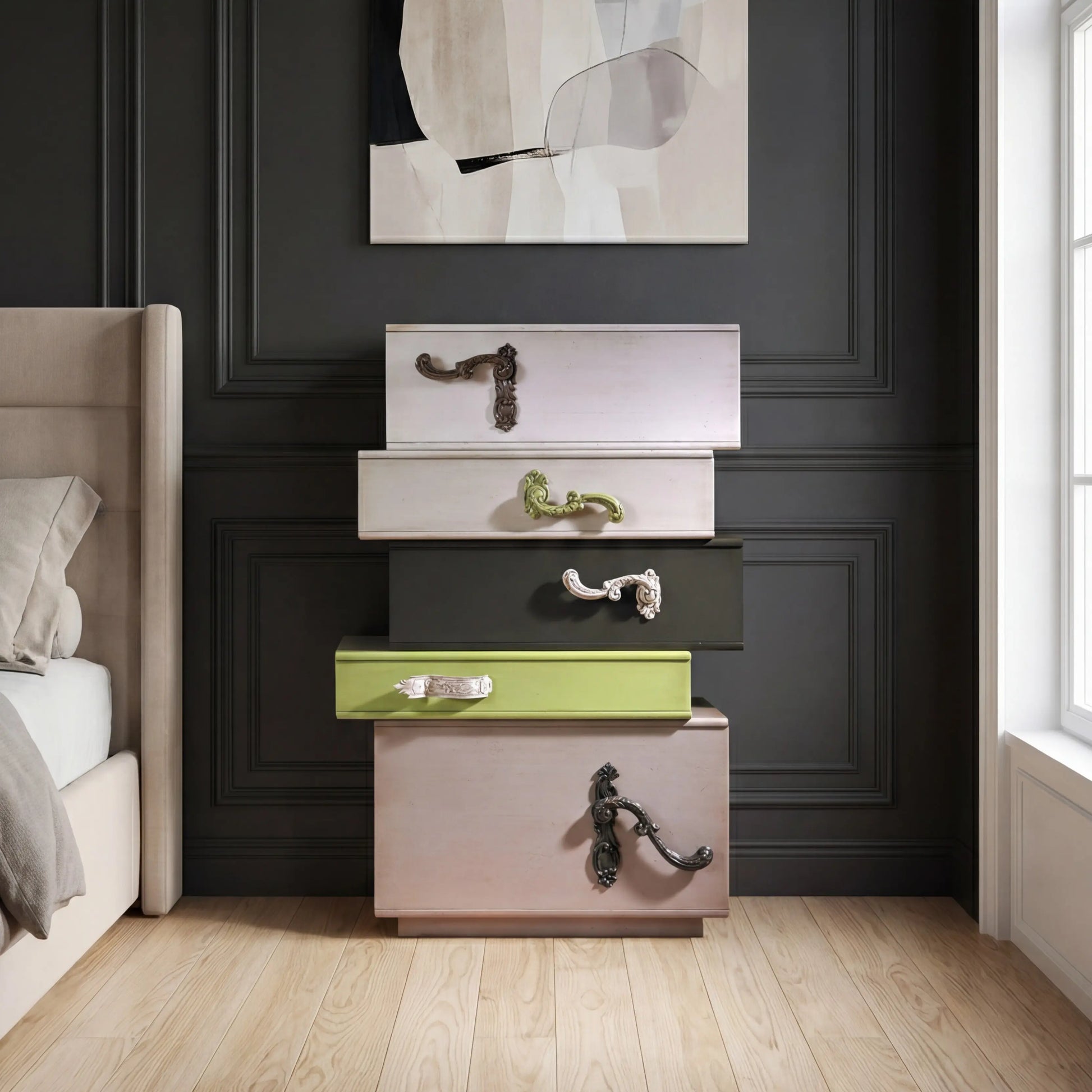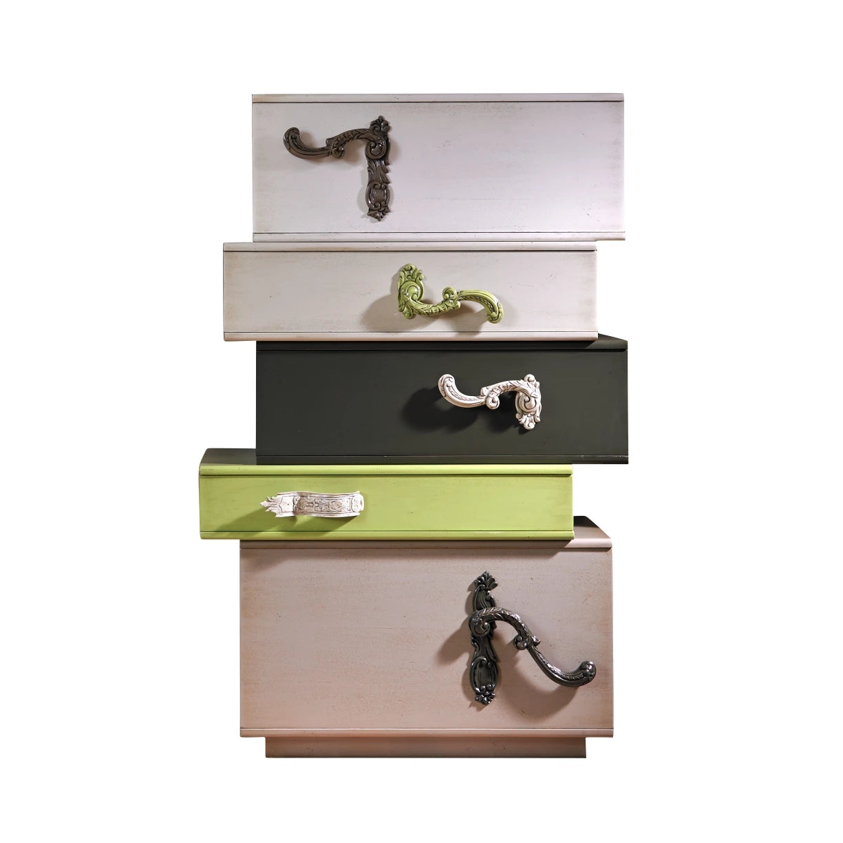 Art. 0101 Length: 87 cm Depth: 45 cm Height: 135 cm The disorder and arrangement of these five modules evoke the imperfect skeleton of a chalk hopscotch grid. That serious task of moving one's feet, of choosing which side to jump on, leaping from one world to another, maintaining balance without stepping on the lines and reaching for the sky. That ceaseless game we perpetuate over the years, unsuspecting and absorbed in ourselves. Five balanced drawers form this chest of drawers, which is fully customizable in size and finish.