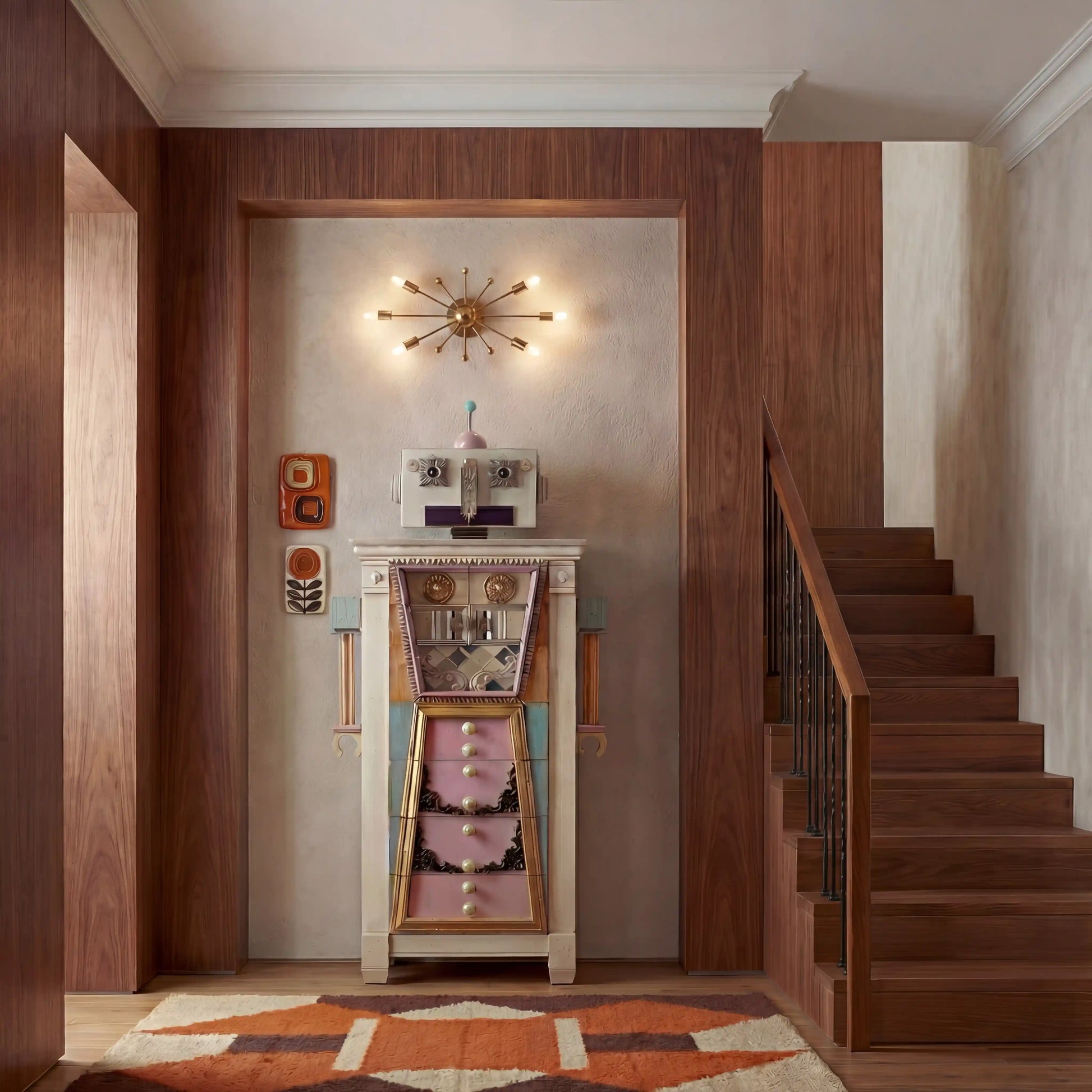 Art. 4162 Length: 84 cm Depth: 40 cm Height: 180 cm Introducing Ms. Robot, the matriarch of a unique family, born from the imagination of Lola Glamour. With these designs, we unify several concepts that have been on our minds for some time: the mechanization of society, the cybernetics of emotions, avant-garde progress, a certain nostalgia for the analog, and a stylistic decoding of retrofuturism. A companion to our Mr. Robot chest of drawers, sharing the same nine drawers and a door in its head. Customizable in size and finish.