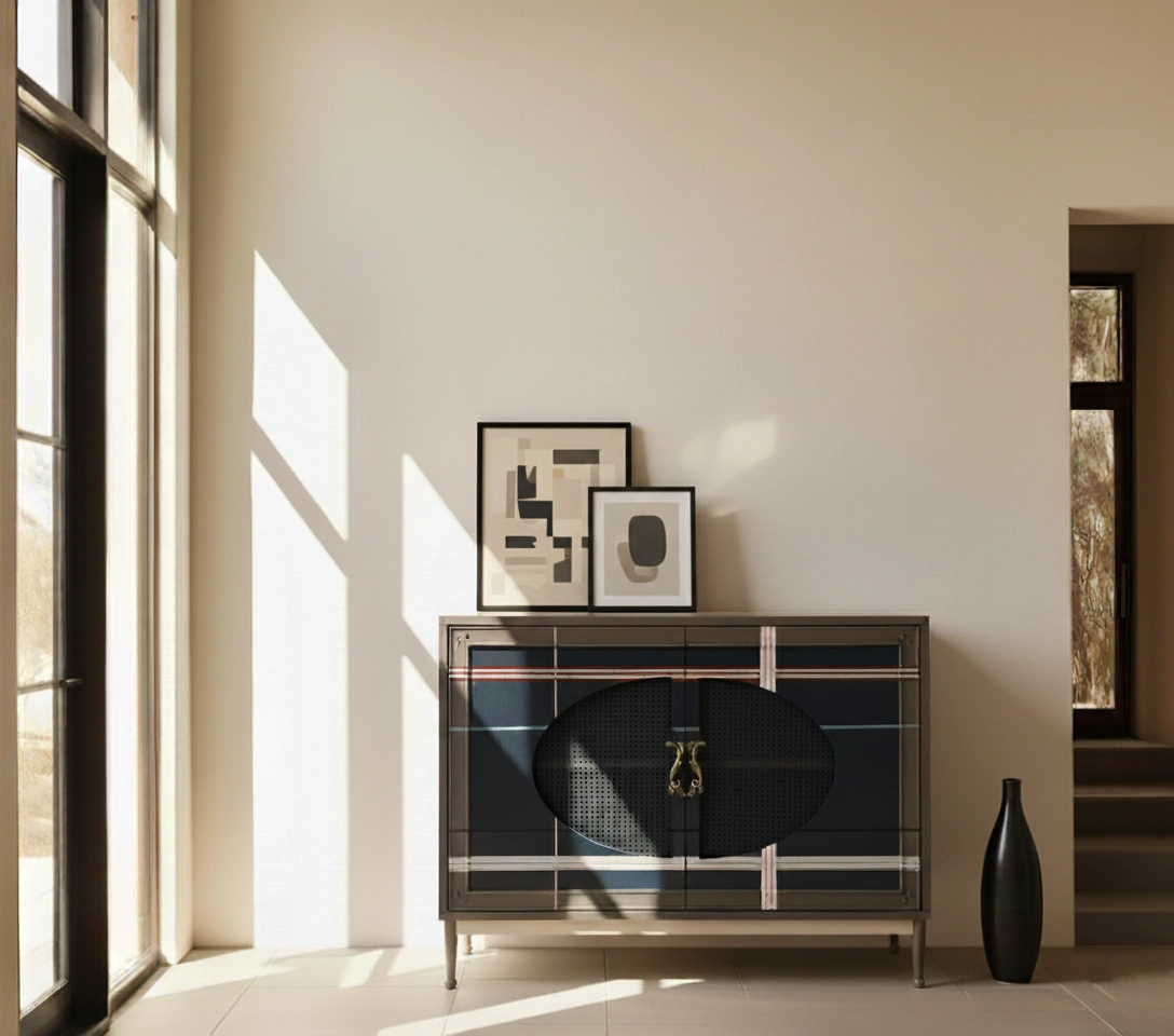 Solid wood chest of drawers, black lacquered doors and natural finish box. Decorative lines along the entire piece of furniture.