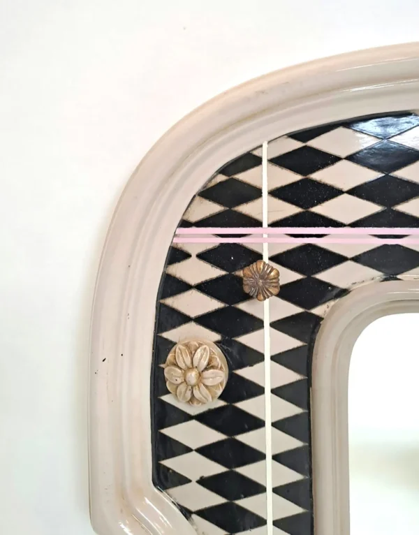 The Fábula Mirror It features a distinctive design that blends a diamond geometric pattern with a handcrafted frame of soft curves and decorative reliefs. Its aesthetic combines the graphic with the ornamental, creating a piece with its own personality within Lola Glamour’s creative universe.