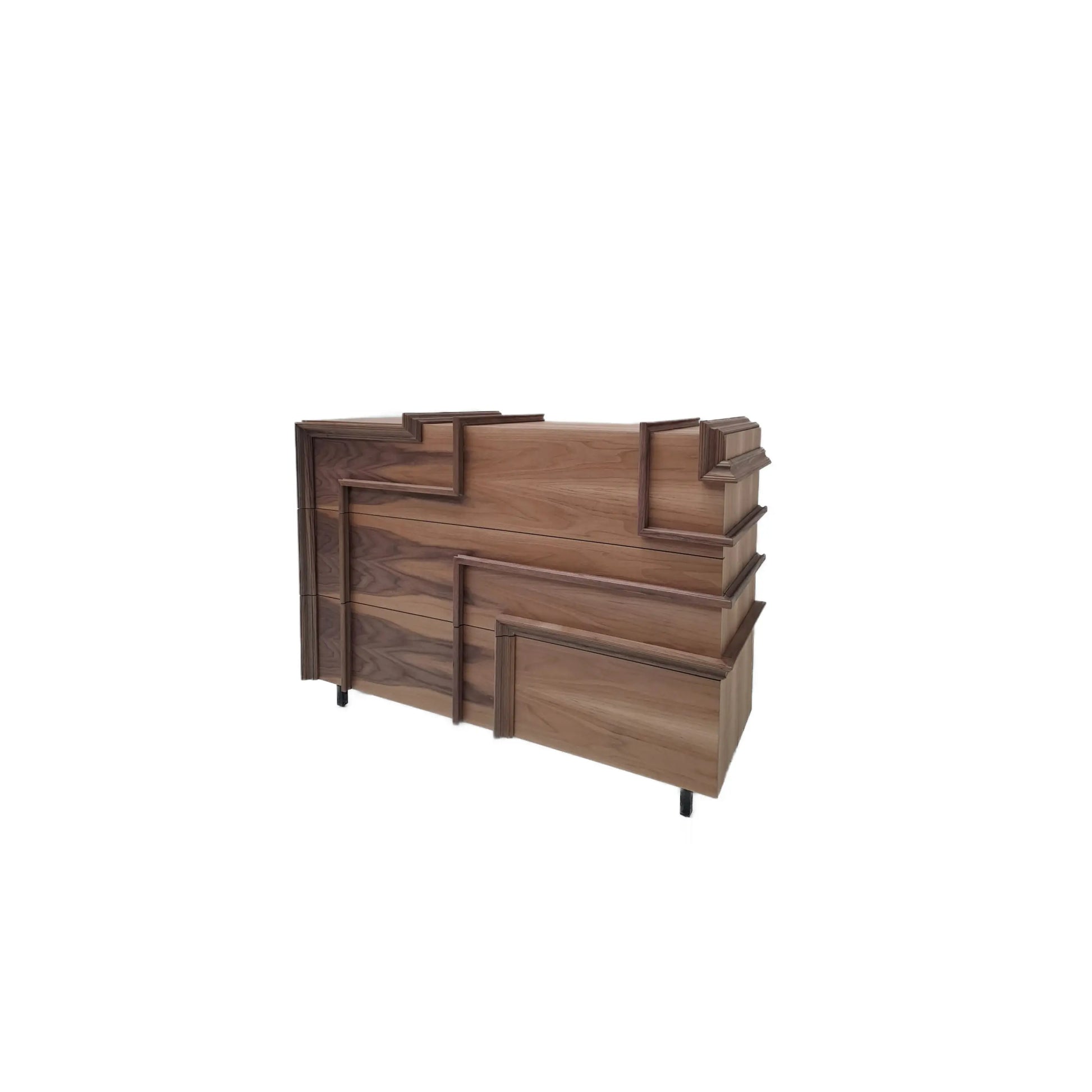 The piece's structure reflects Lola Glamour's meticulous craftsmanship, a process where every surface is carefully adjusted and every volume precisely defined. This design allows the piece to fit seamlessly into projects where the interior design demands furniture with a clear identity and artisanal craftsmanship. The robust walnut construction and the staggered composition of planes lend an architectural feel that works equally well in spacious rooms or in spaces that require a statement piece without overwhelming the room.