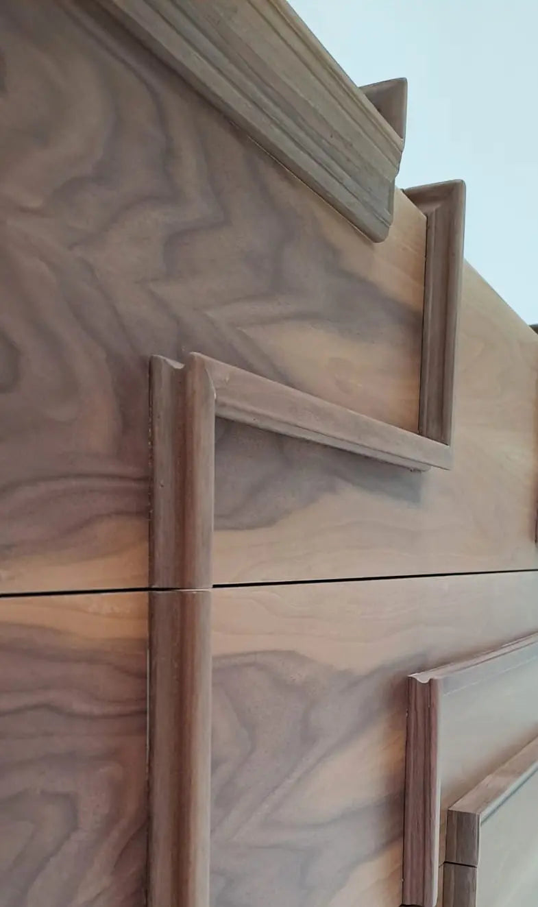The Patch handcrafted walnut chest of drawers exudes tranquility at first glance. Its reliefs unfold in small wooden steps that capture the light and create a serene rhythm, almost like a landscape built in layers. The walnut grain complements this movement with warm, consistent lines, making the Path handcrafted walnut chest of drawers feel intimate, honest, and full of intention.