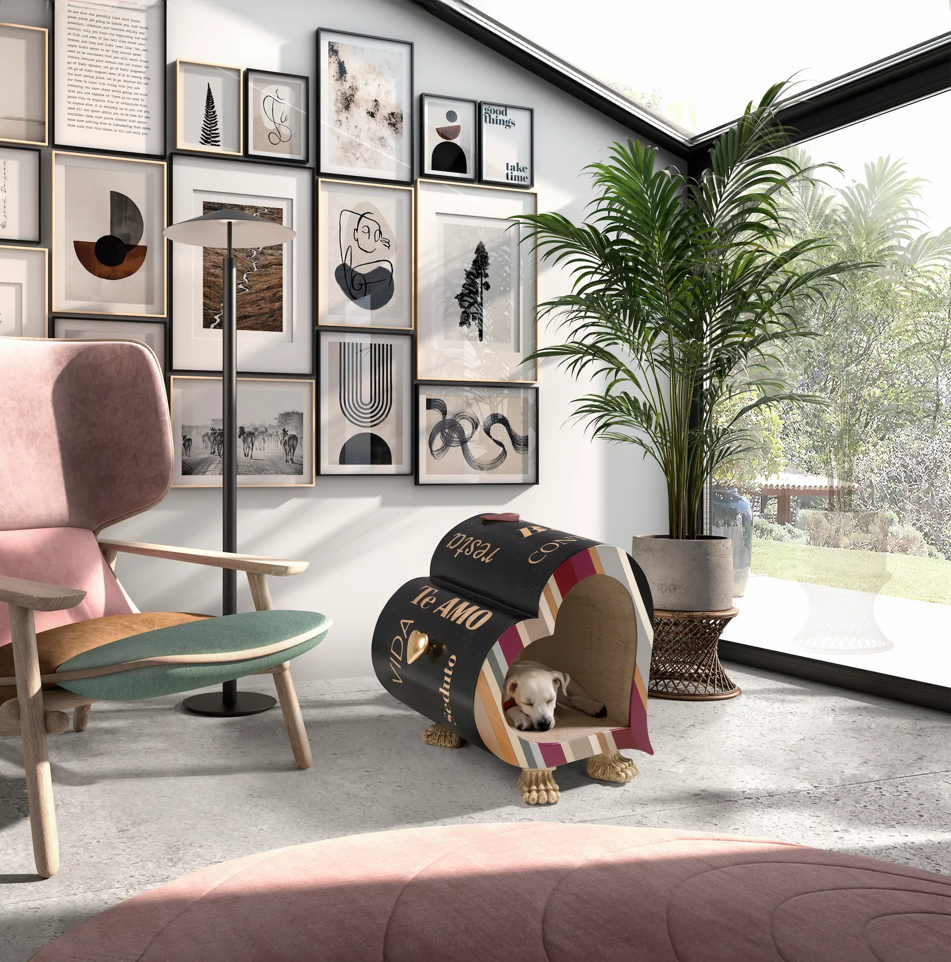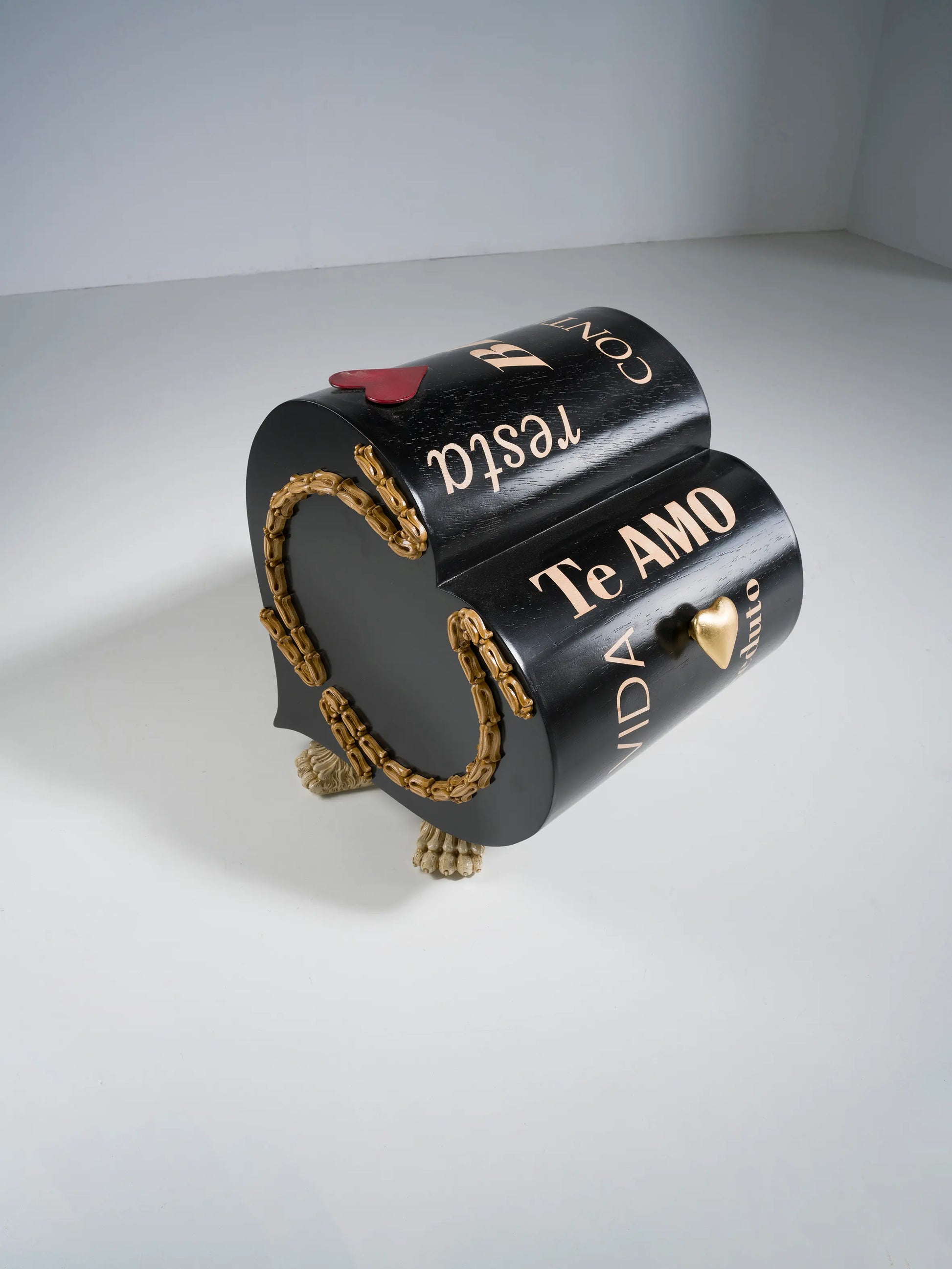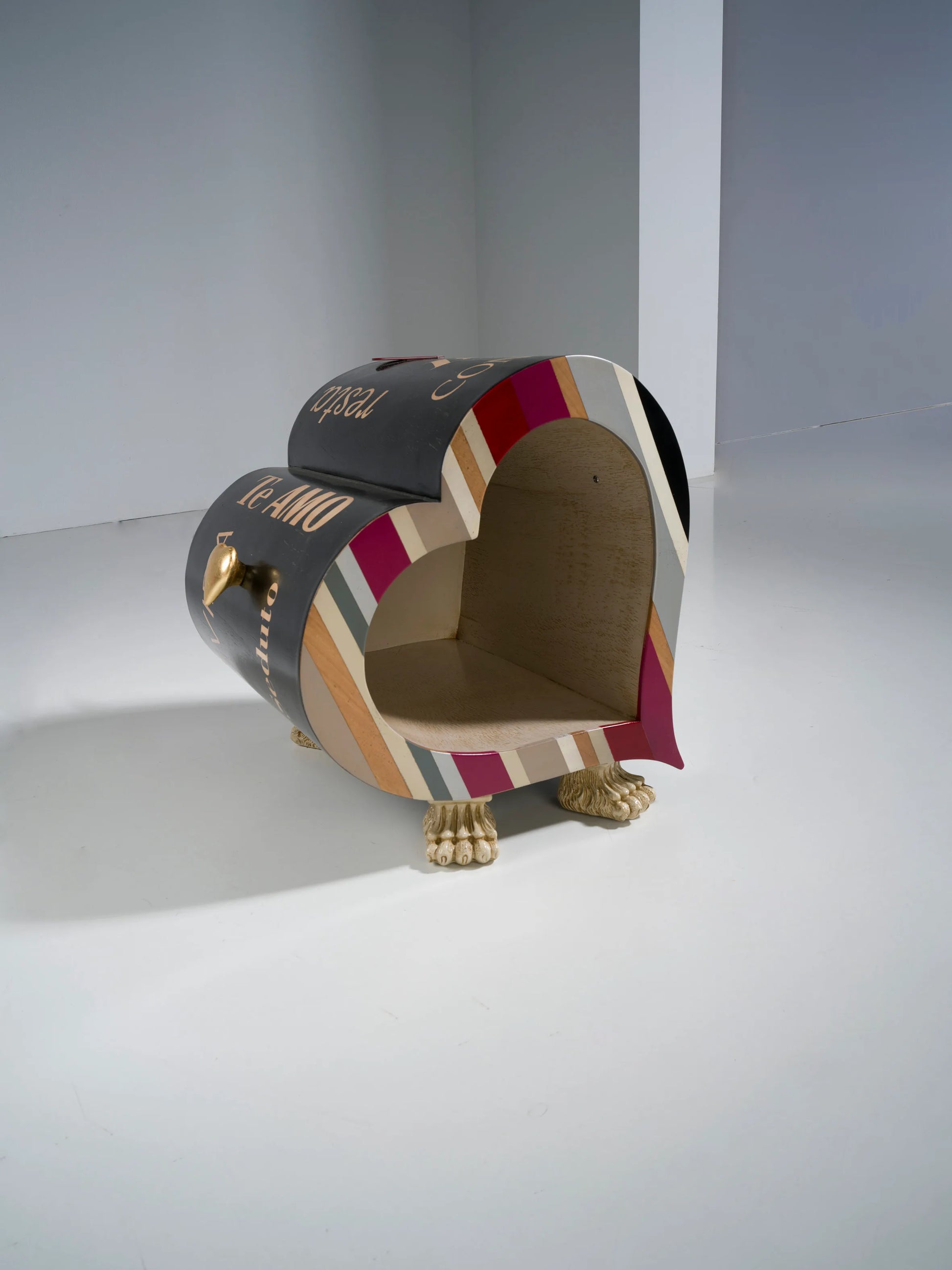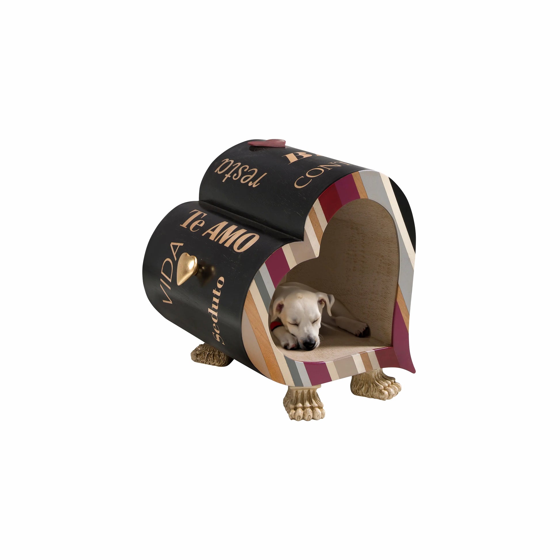 La metáfora se hace palpable al contemplar esta caseta; el perro reposa en el corazón, el epicentro de nuestros sentimientos más profundos. Es más que un simple refugio: es un símbolo de la conexión íntima entre humano y mascota, donde el amor y la devoción se manifiestan en forma de un acogedor hogar en miniatura. Su exterior está adornado con madera cuidadosamente tallada y pintada de negro. Sobre esta superficie, palabras en italiano se entrelazan delicadamente, evocando sentimientos de amor, descanso y protección. Cada palabra parece susurrar un mensaje al perrito, invitándolo a sumergirse en el cálido refugio de este corazón. Personalizable en medida y acabado