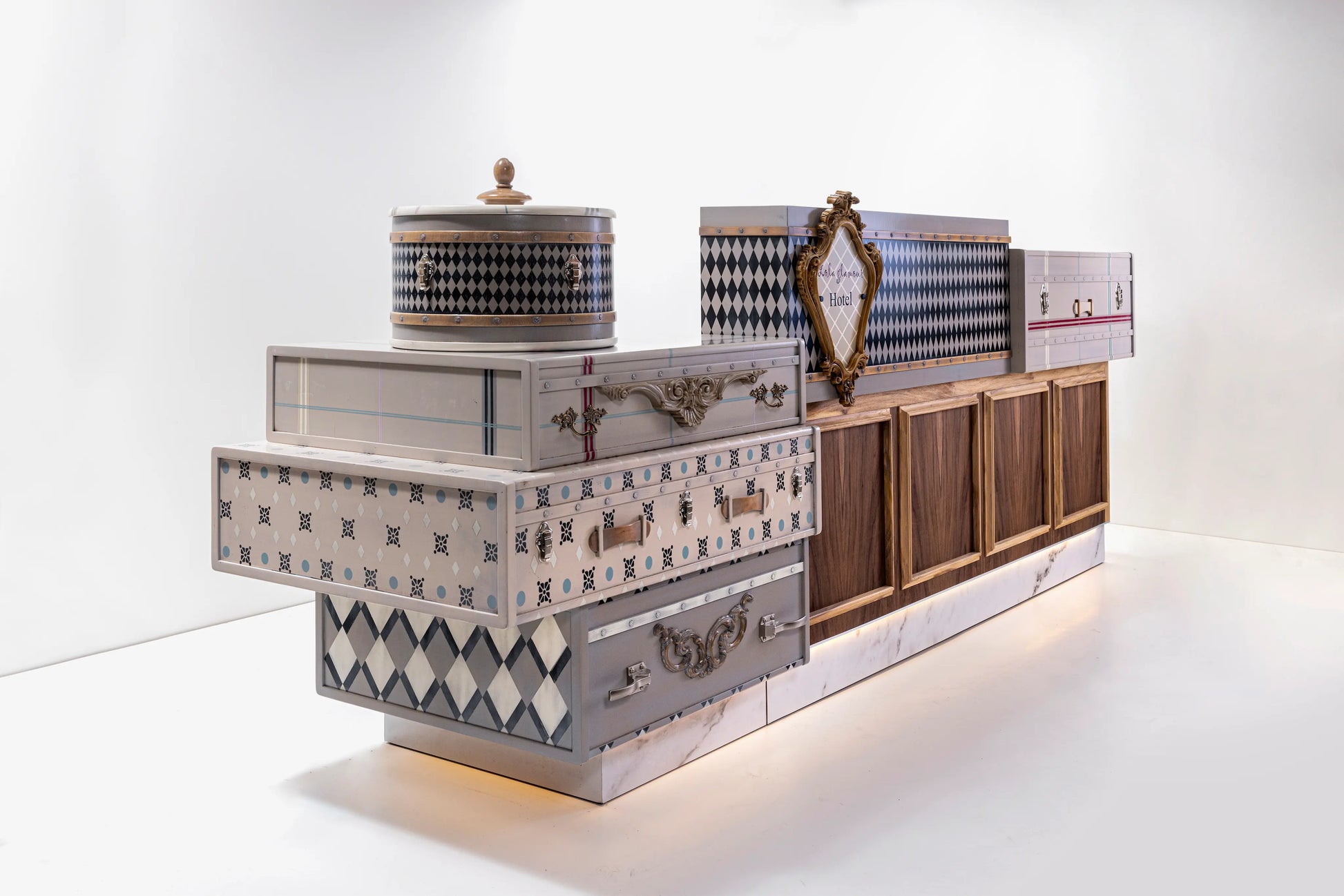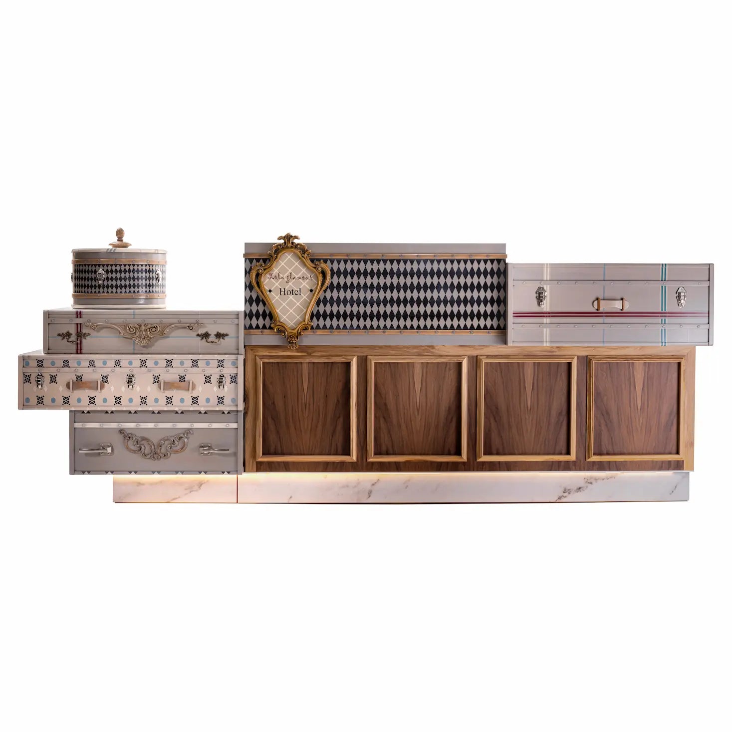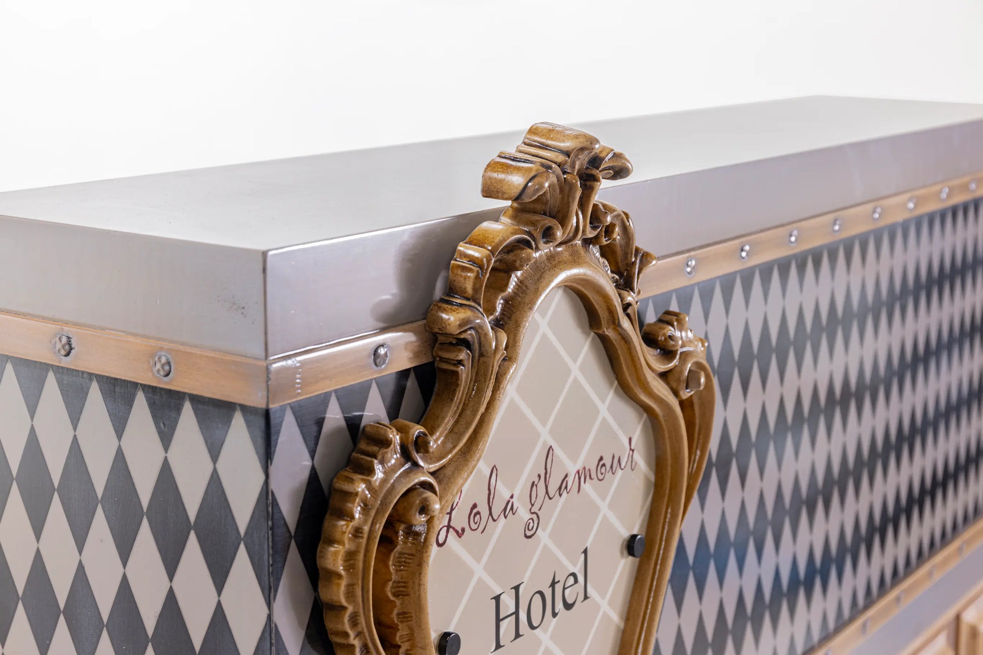 Dicen que el que llega primero no pregunta por la recepción, pregunta por el mueble. Entre molduras doradas, cajones que parecen baúles de viaje y patrones sacados de un escenario, este mostrador no da la bienvenida: la celebra. Tiene algo de teatro y algo de magia antigua, como si hubiera pertenecido a un hotel que solo existe en los sueños. Cada módulo es distinto, cada acabado cuenta una historia. Madera natural, mármol, relieves, espejos, contrastes que no temen al exceso. Un mueble de diseño artesanal hecho para recibir con carácter y dejar huella desde el primer vistazo. Personalizable en medida y acabado.