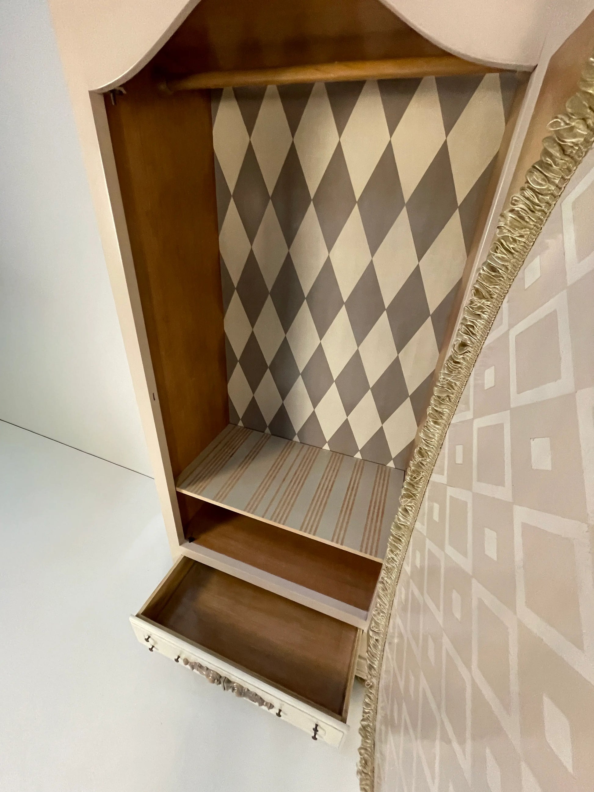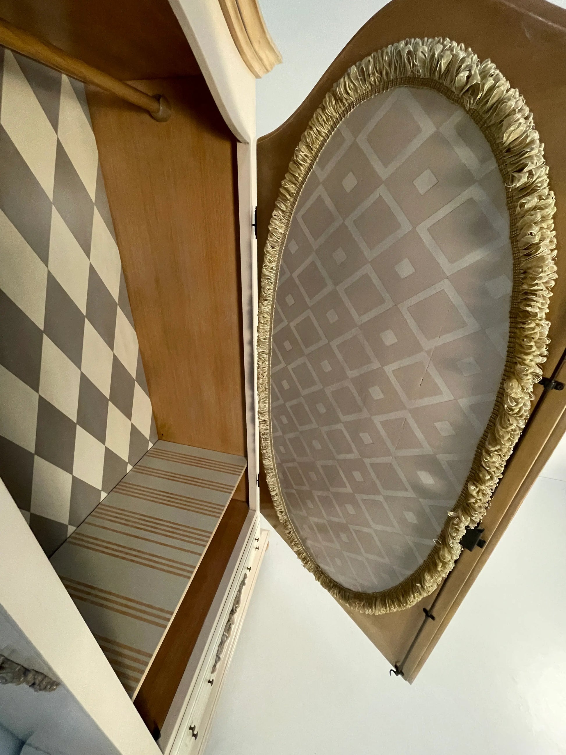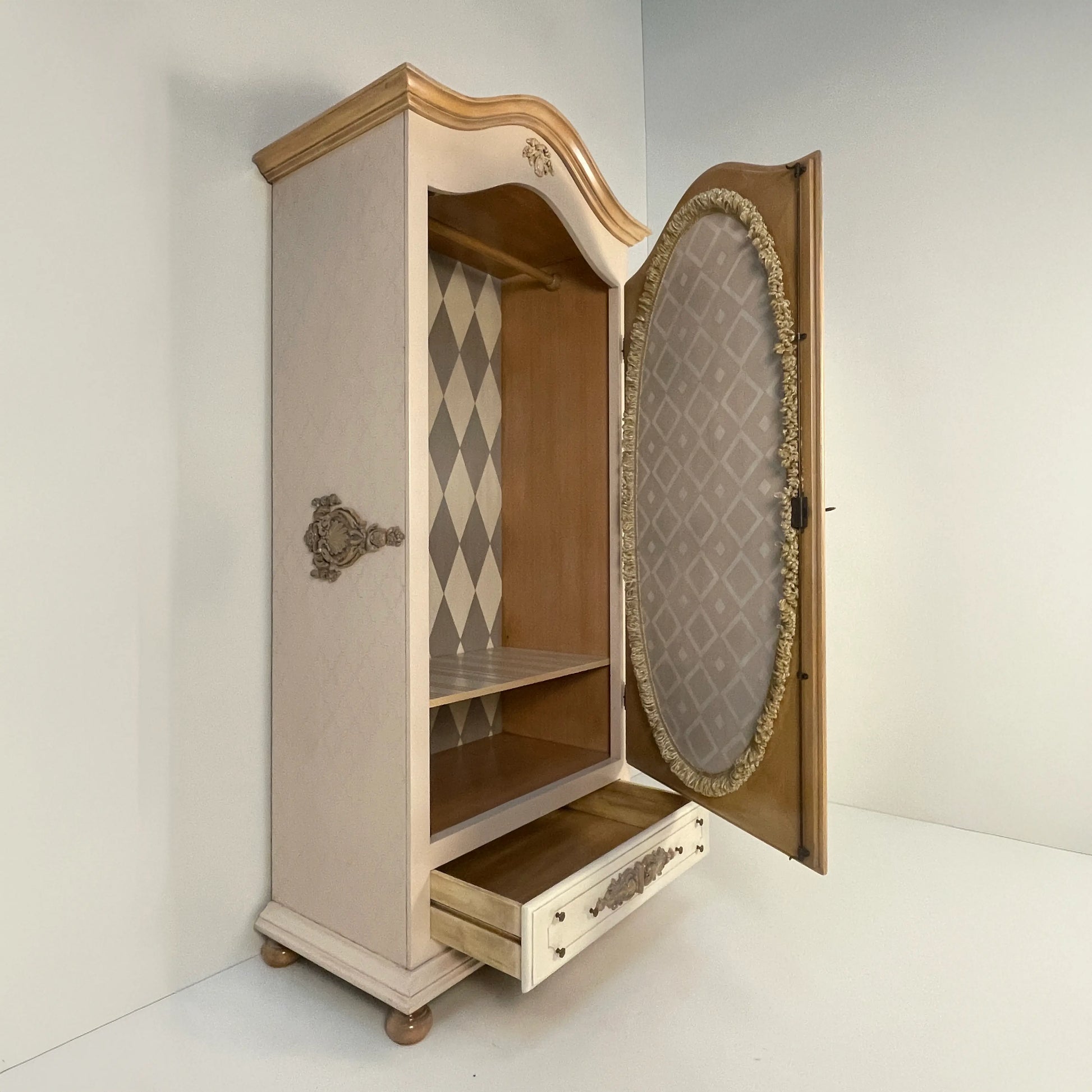 L' armadio Antonella ad anta singola è il pezzo perfetto per chi cerca un tocco di distinzione in spazi più piccoli. Con il suo iconico specchio ovale a figura intera e un design di ispirazione provenzale in tonalità crema, questo mobile non solo organizza i tuoi vestiti, ma amplia anche visivamente la tua camera da letto o l'ingresso. La sua struttura classica nasconde un segreto di design: un interno con motivo a rombi che trasuda lusso artigianale, completato da una funzionale barra appendiabiti e da un pratico cassetto inferiore in stile vintage. Che venga utilizzato come armadio ausiliario o come armadio principale in camere da letto romantiche, il modello Antonella fonde un'eleganza senza tempo con la versatilità di cui la tua casa ha bisogno oggi. Un tocco di luce e ordine con un carattere unico che non passa mai di moda.