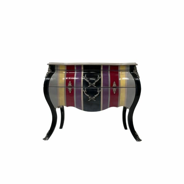 La silhouette bombata, simbolo del barocco francese, trova qui un linguaggio nuovo grazie alla composizione cromatica che attraversa il fronte e i lati del mobile. Le tonalità si susseguono con un ritmo verticale, creando una vibrazione visiva che contrasta con il nero intenso delle gambe curve e delle applicazioni ornamentali. Il risultato non è semplicemente un mobile: è una presenza scenica che trasforma l’ambiente in cui si colloca.