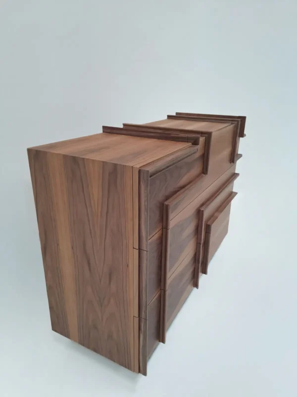 Nella sua struttura si riconosce il lavoro manuale di Lola Glamour, un processo in cui ogni superficie viene regolata con cura e ogni volume è definito con precisione. Questo design permette al pezzo di inserirsi in progetti in cui l’interior design richiede mobili con un’identità chiara e una produzione artigianale. La costruzione robusta in noce e la composizione di piani sfalsati offrono una lettura architettonica che funziona sia in ambienti ampi sia in stanze che necessitano di un mobile protagonista senza saturare lo spazio.