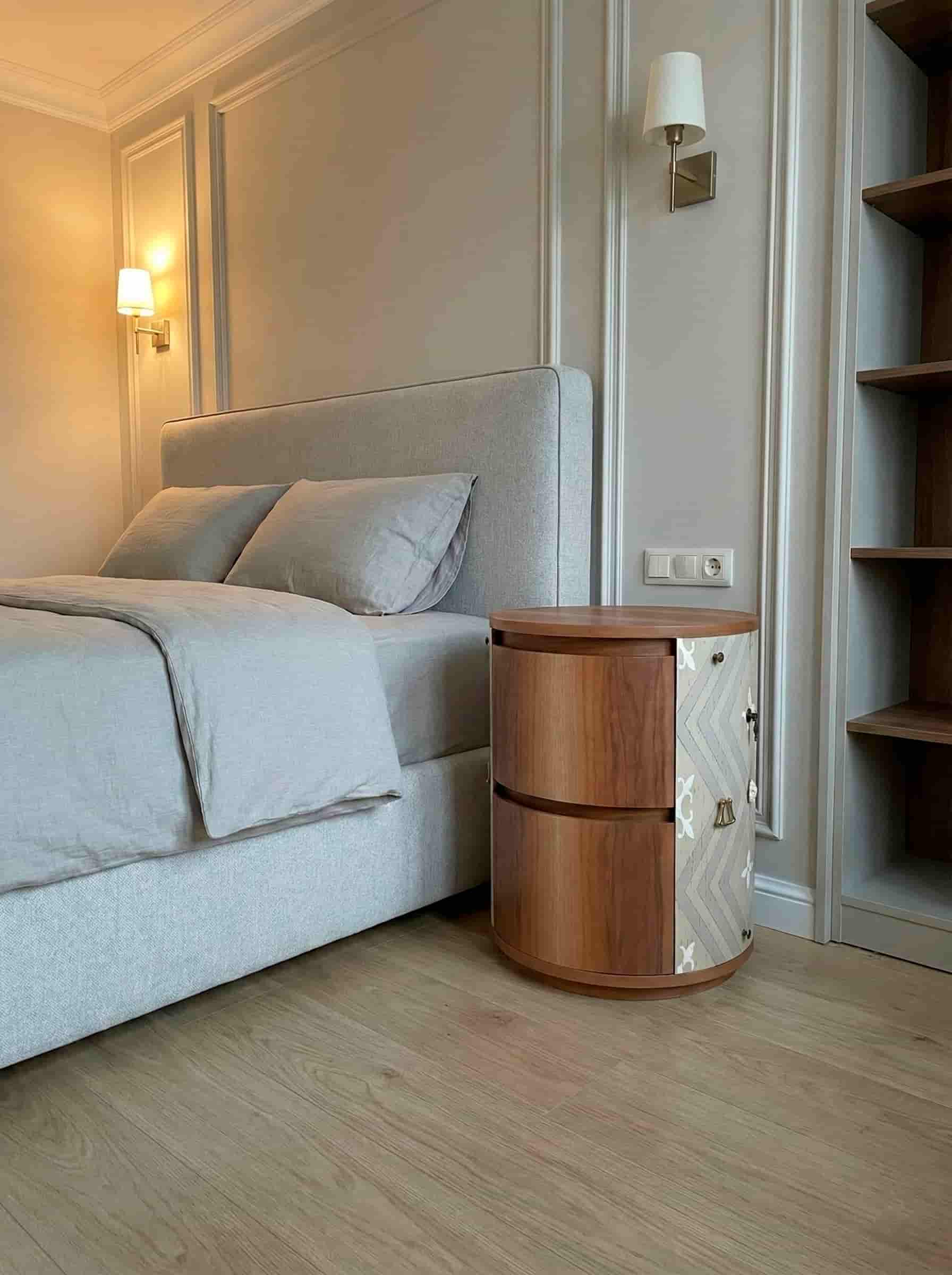 Comodino circolare in legno di noce che trasforma un elemento d’appoggio in una vera protagonista dell’ambiente. I cassetti curvi e il pannello laterale decorativo donano ritmo e profondità al design, mentre la ferramenta e le finiture artigianali ne rafforzano il carattere distintivo. Un comodino pensato per camere da letto in cui il design non è un complemento, ma parte essenziale dello spazio.