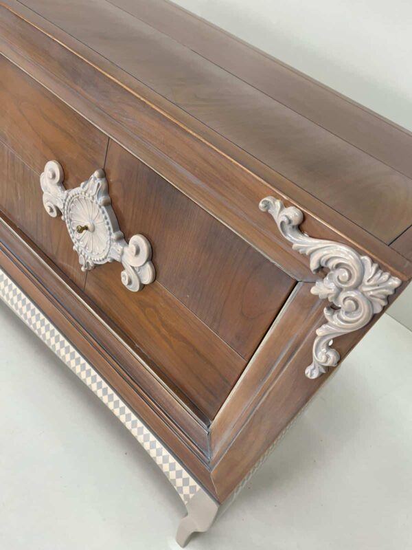 La base della Credenza Cibeles è realizzata in noce naturale. La finitura mette in risalto il disegno del legno e rafforza la sensazione di solidità. Le modanature e i dettagli metallici aggiungono contrasto. Le gambe curve e il frontale intagliato vengono lavorati pezzo per pezzo nel laboratorio. La produzione segue processi manuali che permettono di controllare ogni fase. La struttura interna comprende vani aperti e zone chiuse. La distribuzione è pensata per offrire ordine senza rinunciare al design.