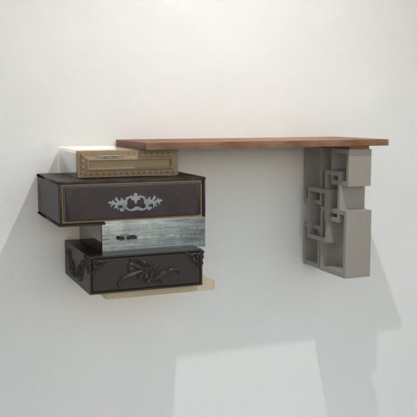 La scrivania Lux è raffinatezza e lusso, sia per il mix di materiali nobili come velluto, specchio, vetro, intagli, legni e lacche artigianali, sia per il suo design di scatole che sembrano in movimento sotto un piano in noce, perfetto per il tocco e pronto per ispirare momenti di lavoro e creatività. A sinistra ci sono 4 cassetti, a destra una gamba in legno a forma di catena che fornisce stabilità per rendere la scrivania un pezzo free standing da ammirare su tutti e quattro i lati.
