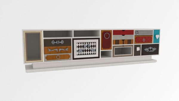 Una solución de espacio ideal gracias a sus cinco puertas, seis cajones y tres huecos. Personalizable en medida y acabado.