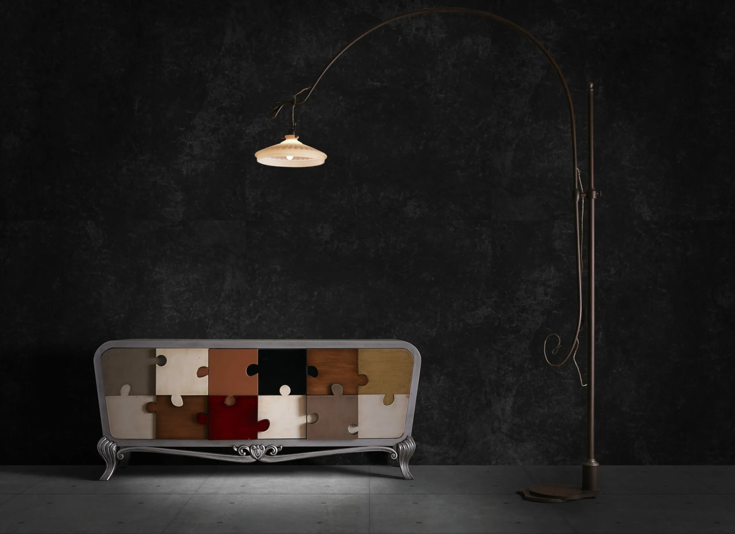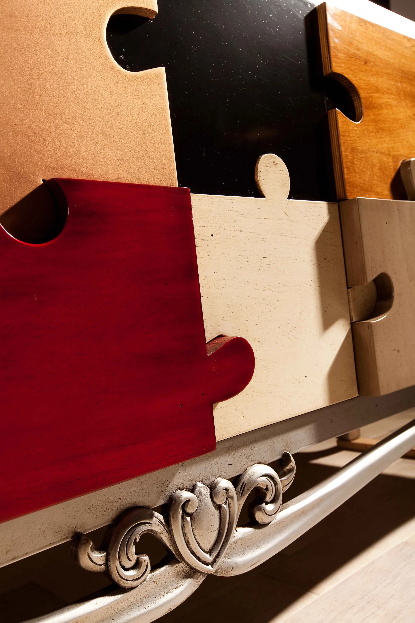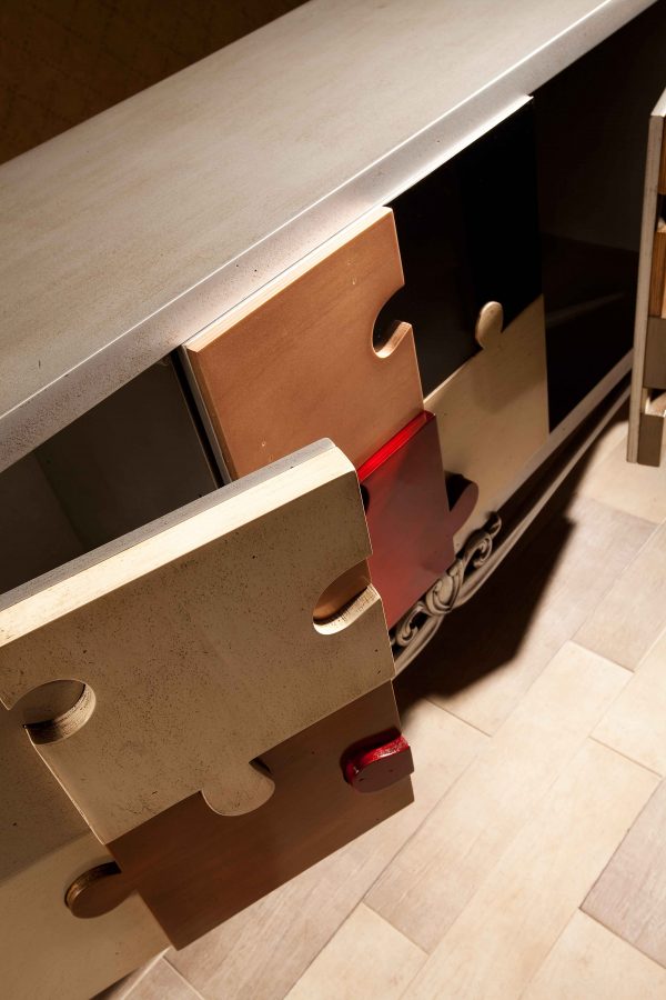 Altezza: 75 cmArmazón de madera de cerezo con esquinas redondeadas y patas talladas de inspiración decimonónica en contraste inesperado con las piezas de color de un puzzle. Unión de dos contrarios, lo elegante y lo lúdico, lo suave y lo llamativo para dar con una pieza que es arte y artesanía. Tres puertas con tres estantes interiores se mimetizan a la perfección entre las piezas.
