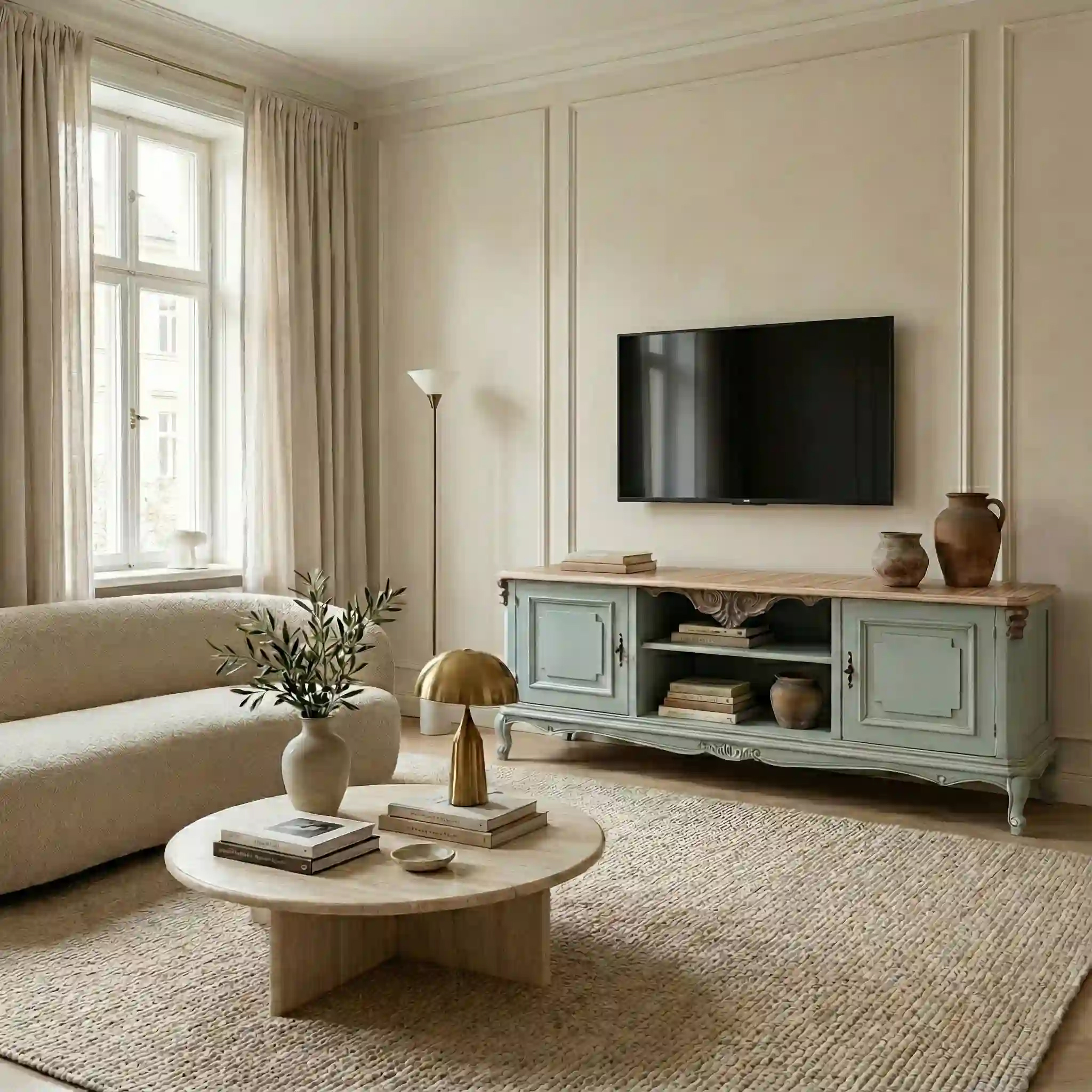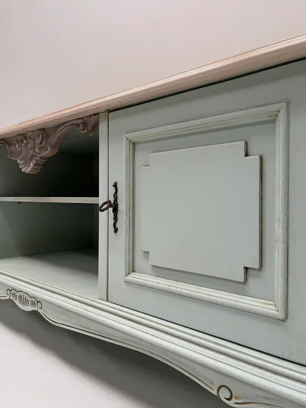Mobile TV Jade Marfil con finitura verde polvere e piano in legno naturale decorato con linee geometriche. Un pezzo dal carattere classico reinterpretato, con ante laterali, vani centrali a giorno e dettagli intagliati che riflettono il savoir-faire artigianale di Lola Glamour.