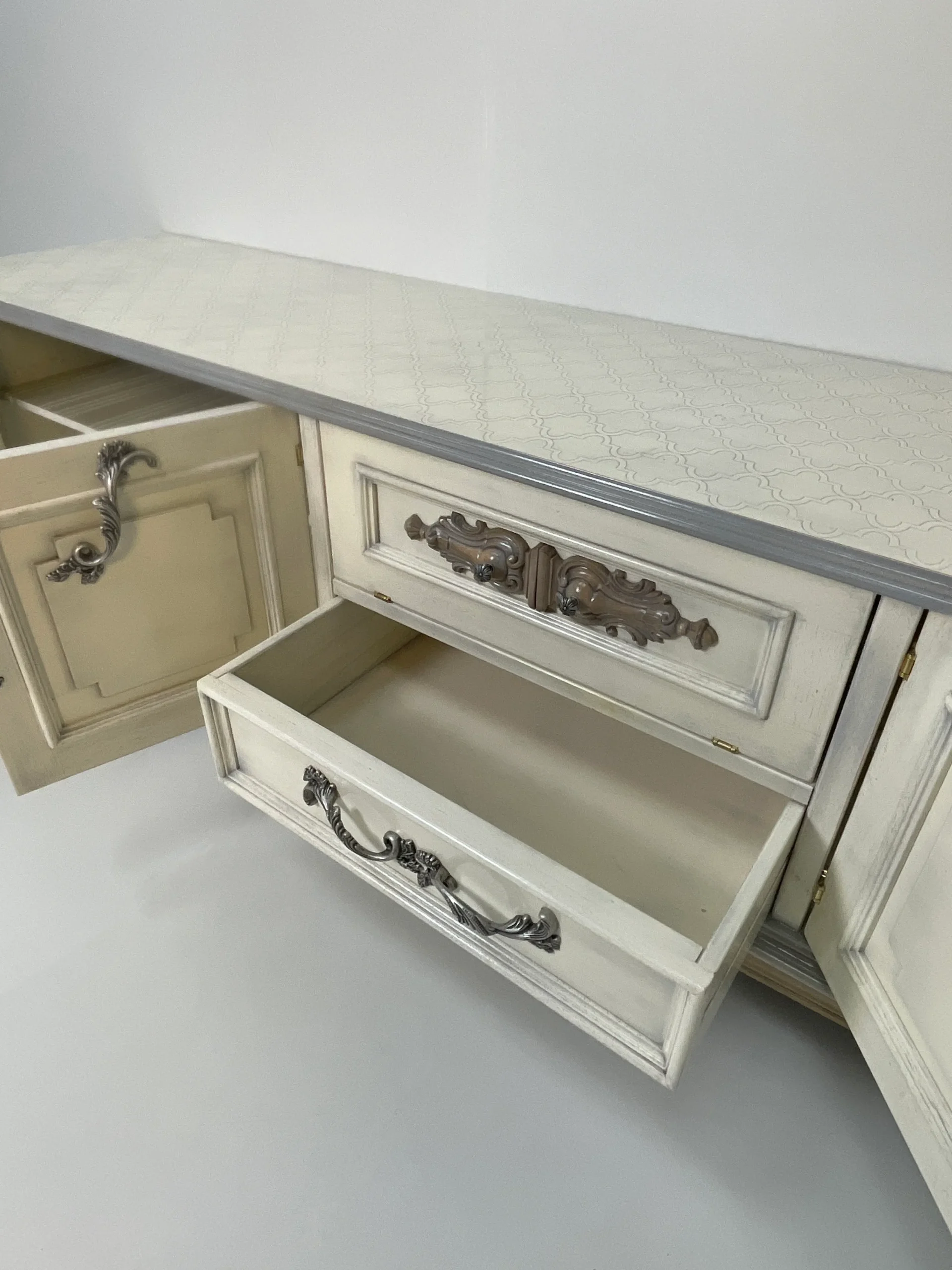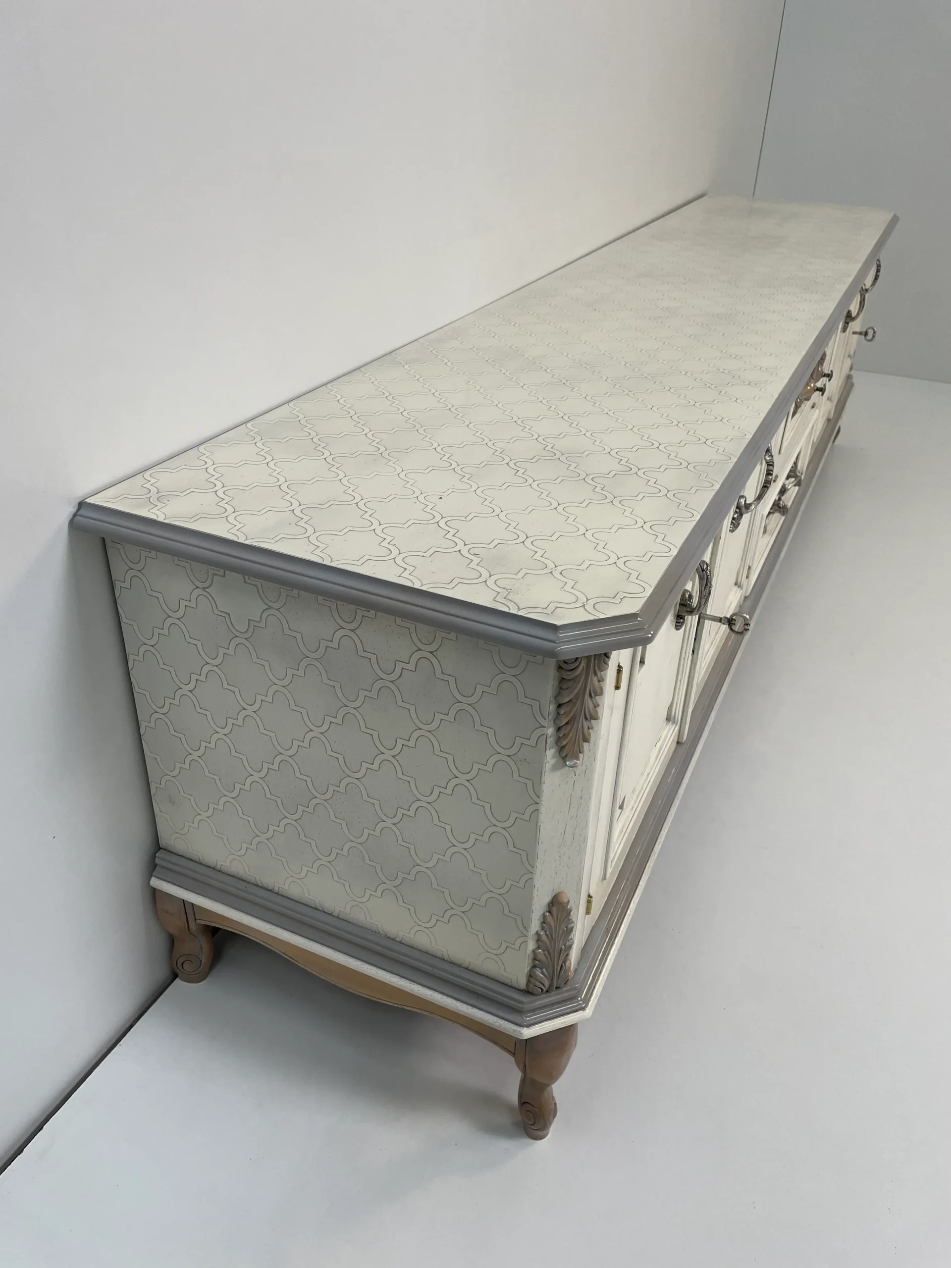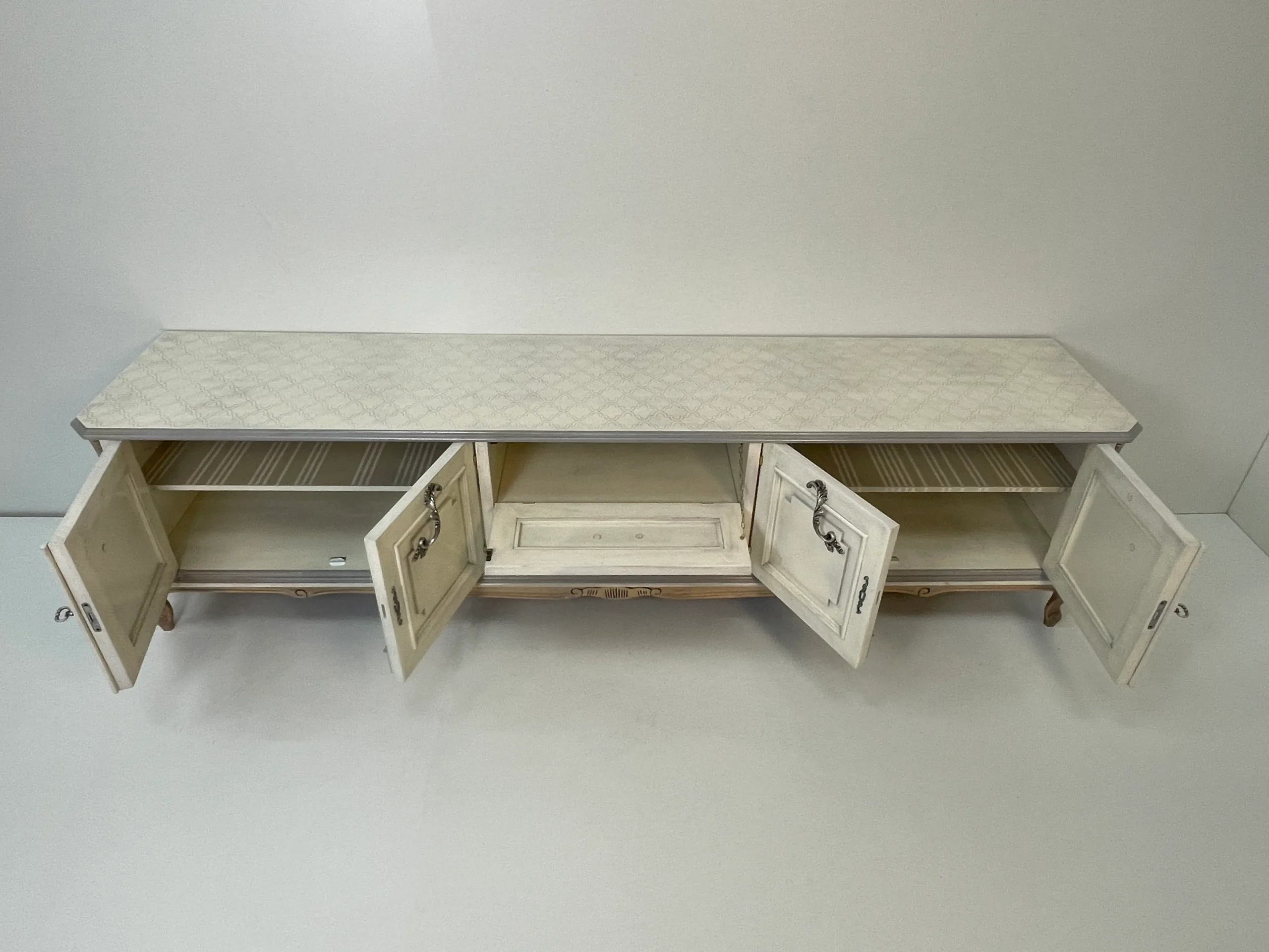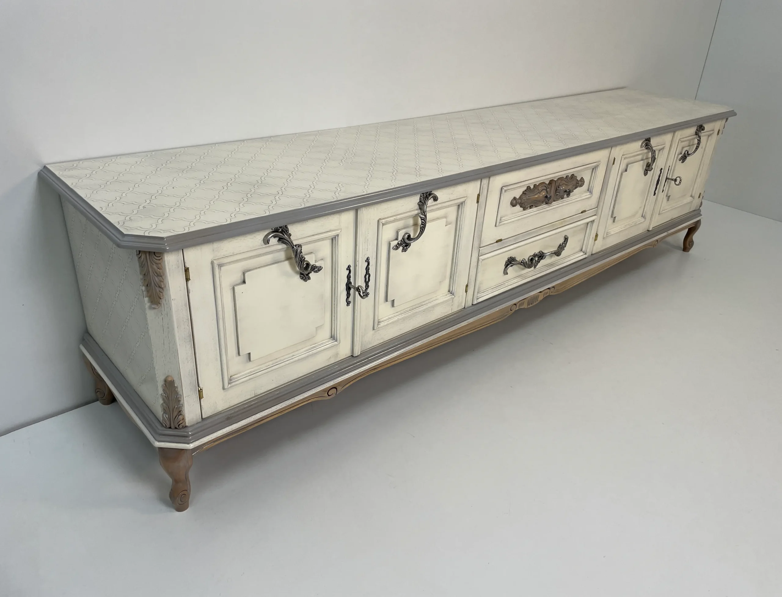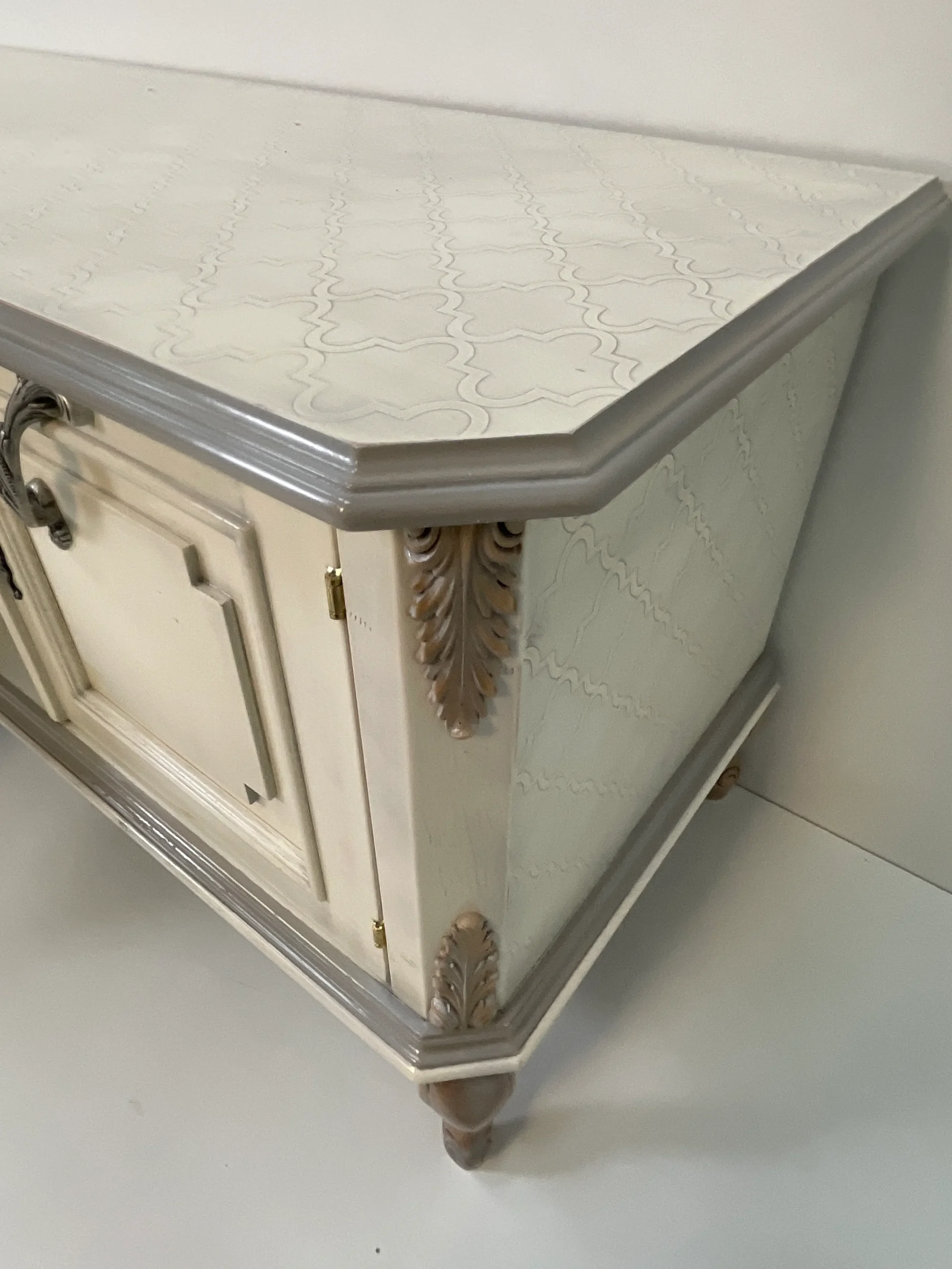 Il Mueble TV Jade se planta en el salón con la autoridad tranquila de las cosas bien hechas. Su diseño de largo recorrido dibuja un horizonte visual que ordena el espacio, vistiendo la estancia con una elegancia que podríamos llamar «clásica», si no fuera por su secreto. Y es que, bajo su apariencia señorial y sus molduras tradicionales, la madera ha sido trabajada con una piel geométrica sutil, un patrón moderno en relieve que solo se revela en las distancias cortas. Es el equilibrio perfecto entre la nostalgia y la vanguardia; una pieza pensada no solo para sostener un televisor, sino para elevar la categoría estética de toda una pared.