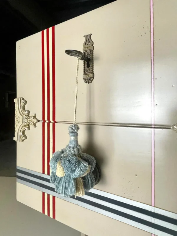 Le superfici chiare portano luminosità e permettono ai dettagli di risaltare senza creare un contrasto eccessivo. Le linee rosse, blu e gialle introducono un tocco grafico che richiama l’universo del make-up, dove il colore ha un ruolo essenziale. Il piano scuro stabilizza visivamente l’insieme e definisce una superficie di lavoro precisa. La sensibilità artigianale si percepisce nelle incisioni e nella disposizione accurata degli elementi metallici. Per chi desidera adattare le misure o esplorare progetti simili, la sezione mobili su misura mostra esempi rilevanti.