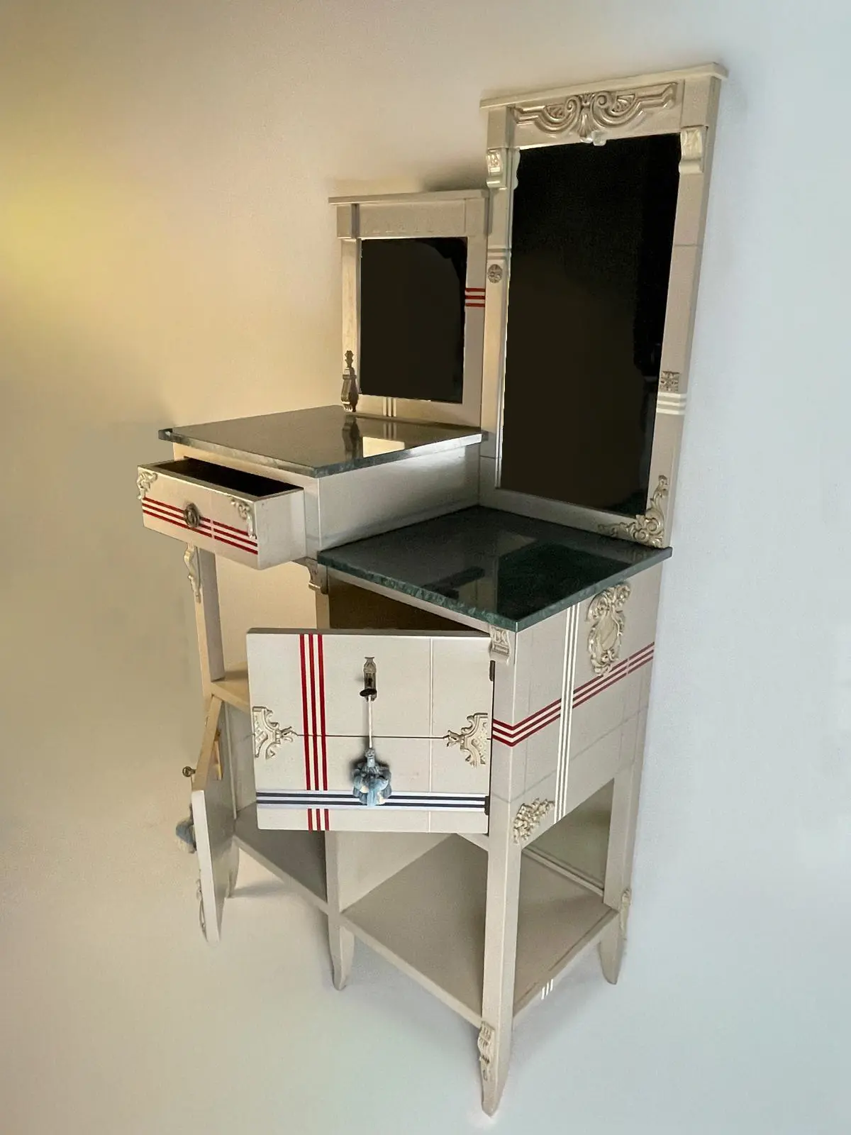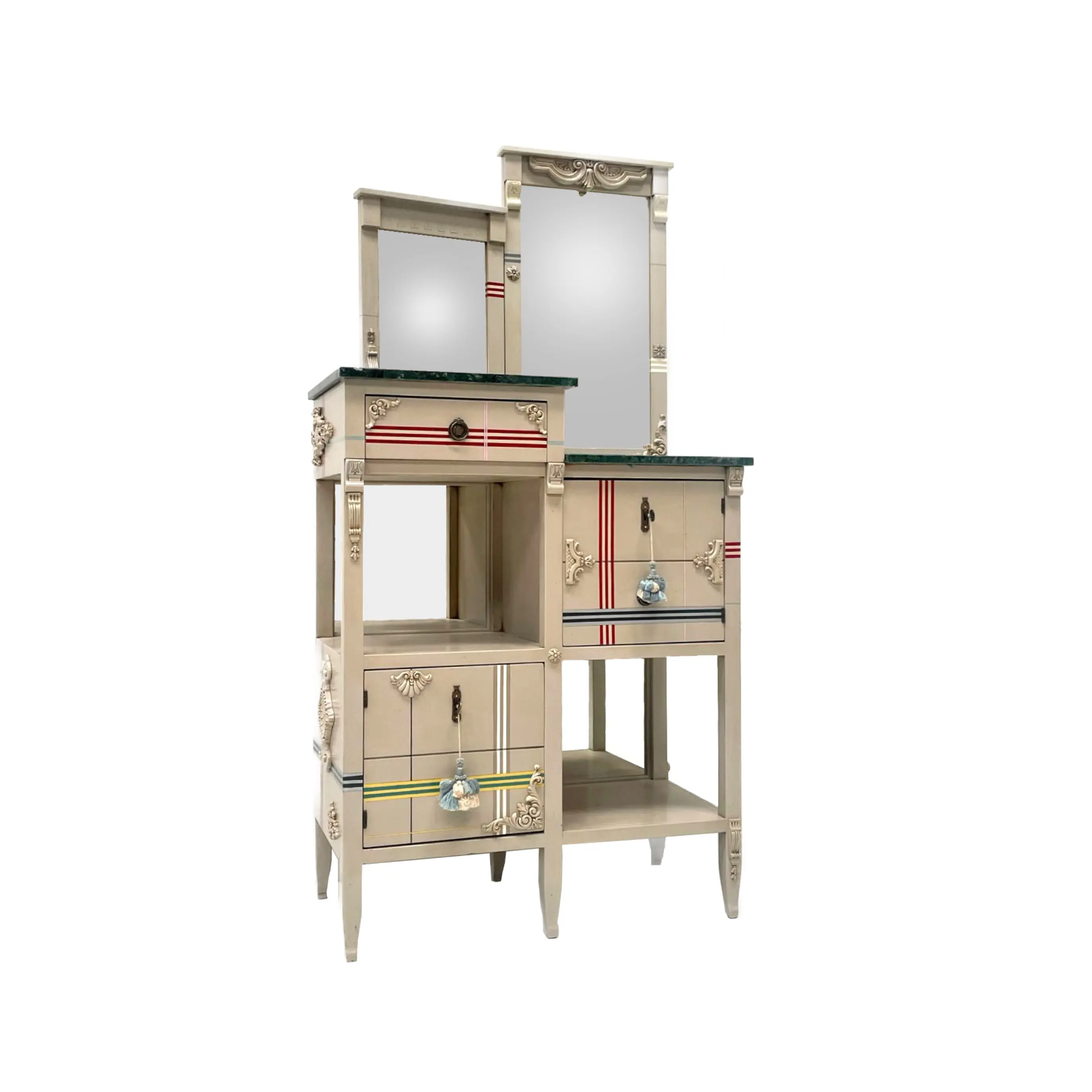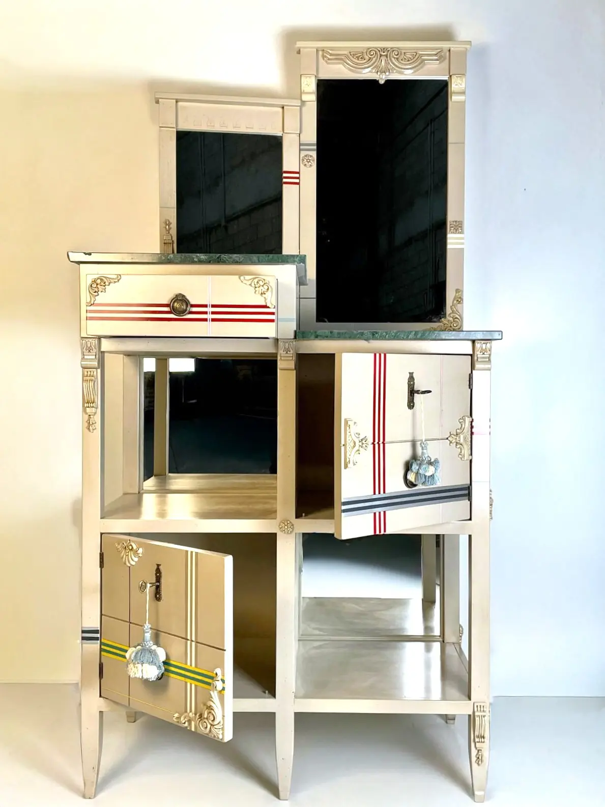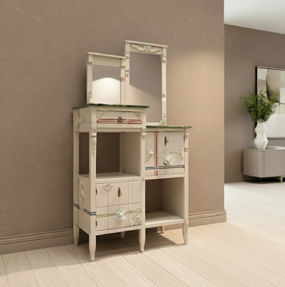 La estructura está formada por varios niveles que permiten colocar accesorios, iluminación o pequeños elementos de uso diario. Los paneles decorados con franjas de color dialogan con las molduras ornamentales, creando un equilibrio entre lo tradicional y lo actual. El espejo alto ayuda a definir una zona cómoda para arreglarse, mientras que los compartimentos inferiores ofrecen espacio de almacenaje accesible. La composición vertical hace que el tocador Guillermo Tell funcione bien incluso en espacios estrechos.