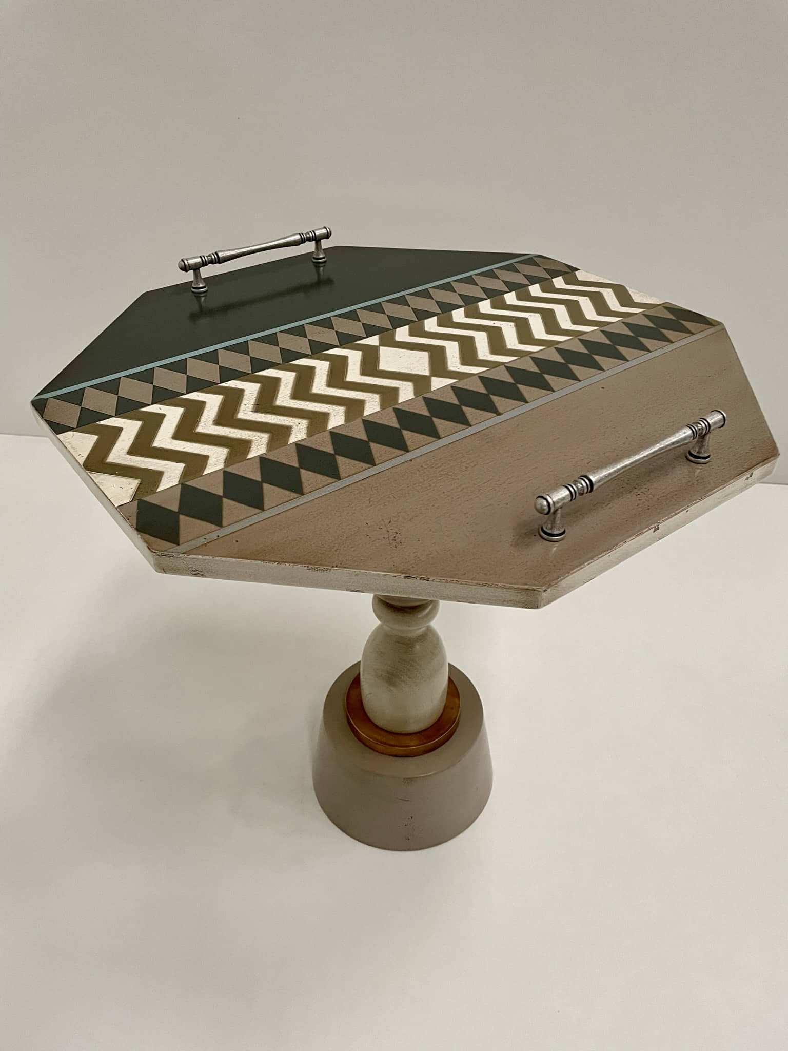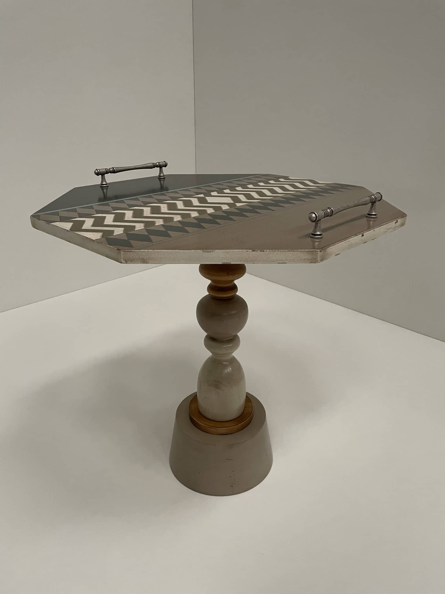 Altezza: 53 cmTavoli civettuoli, adatti ad essere collocati in ogni ambiente e per ogni immaginabile utilizzo. Sono composte da un piano ottagonale, con finitura completamente personalizzabile, e da un piede tornito, dall'aria di un vaso distratto.
