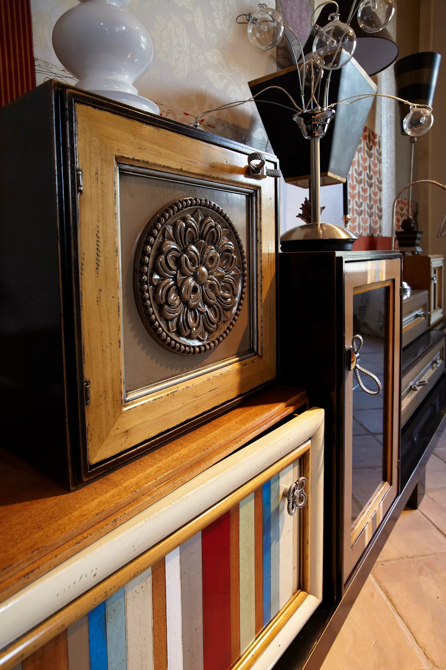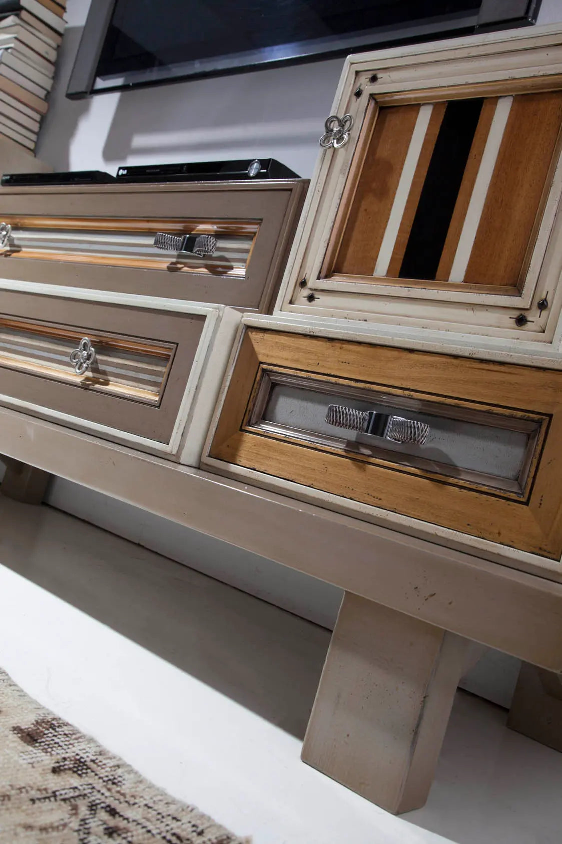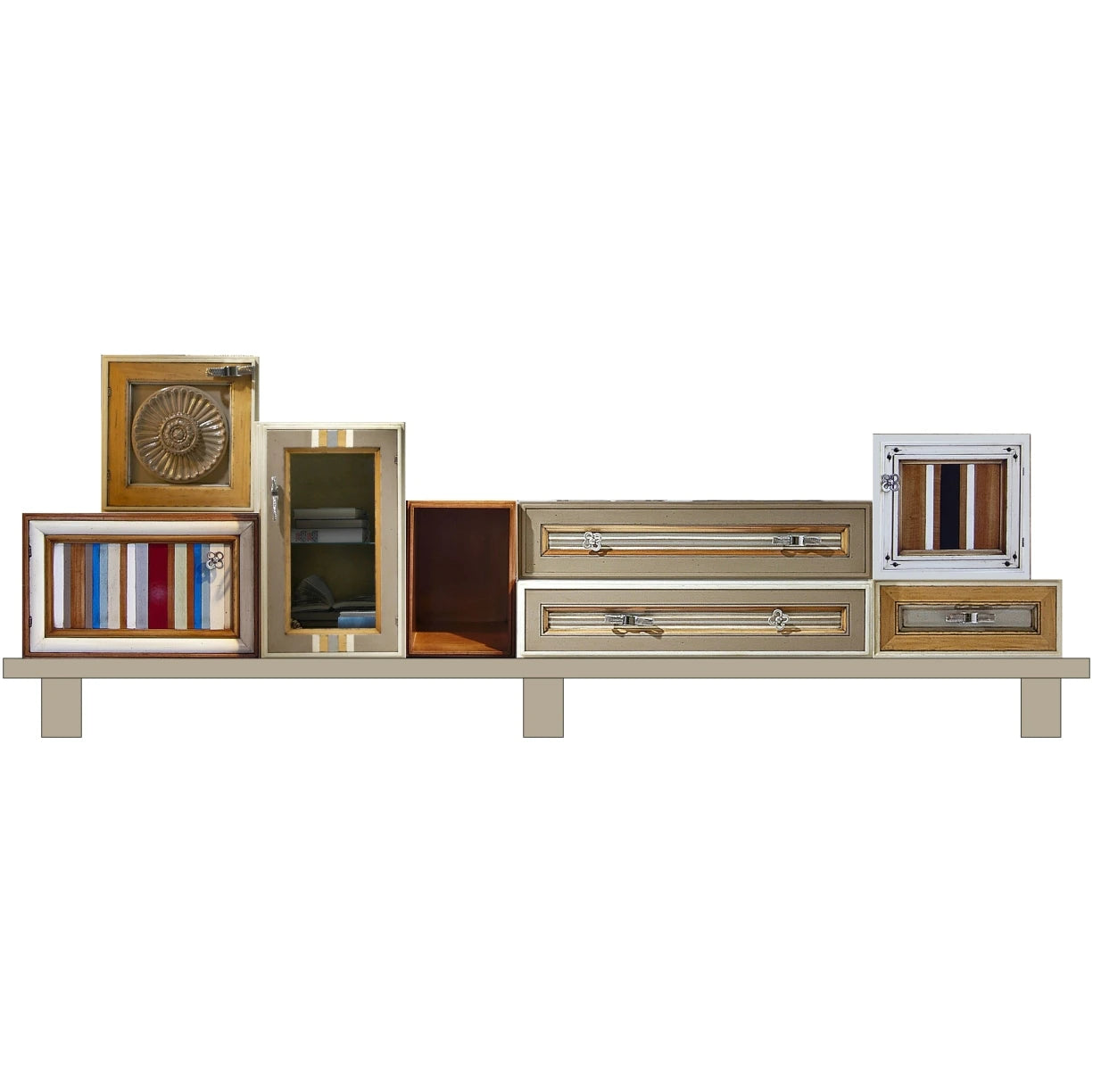 Arte Uno2 Lunghezza: 275 cm Profondità: 45 cm Altezza: 97 cm Un altro esempio di questa magnifica serie One, che mette in mostra le numerose opzioni disponibili. Questo mobile è composto da otto moduli indipendenti, montati su un semplice zoccolo con gambe che mettono in risalto la meticolosa lavorazione artigianale e la cura dei dettagli dei componenti. È dotato di quattro ante, tre cassetti e un ripiano aperto, disponibili in due finiture. Una è prevalentemente nera con vivaci colori a contrasto, mentre l'altra è più sobria, perfetta per spazi più rilassati. Quale preferisci?
