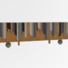 Alto: 67 cmAparador de cuatro puertas con apertura en simetría y brillantes patas delanteras cuasi esféricas. El acabado de madera natural contrasta con el impacto de los listones superpuestos, que caen como goterones de pintura, en una absurda carrera por alcanzar el abismo. Las baldas interiores no se conforman con su inherente funcionalidad, sino que ansían convertirse en una extensión privada de su belleza exterior.
