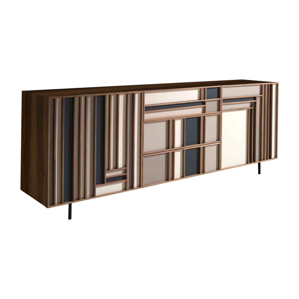 Alto: 75 cmLa última incorporación de la familia Phoenix destaca por su combinación de diseño y color. El patrón de sus líneas horizontales y verticales se entrelazan con maestría para crear cautivantes formas geométricas rectangulares, ahora acentuadas con colores en azules y tonos cafés que aportan un toque de armonía y vitalidad. La madera de nogal utilizada en su construcción sigue siendo exquisita, con vetas ricas que le otorgan una profundidad visual diferente. Este nuevo diseño es algo menos largo que su predecesor, ofreciendo un equilibrio perfecto entre estilo y funcionalidad. Sus ligeras patas de hierro le dotan de un estilo contemporáneo único y con personalidad. En su interior se esconden dos baldas que optimizan el espacio de almacenamiento, además de tres cajones que brindan una solución práctica y elegante para mantener el orden.