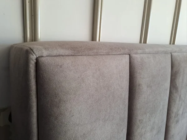 El diseño del cabecero se combina bien con mesillas de líneas rectas o con piezas más clásicas. La verticalidad del tapizado aporta orden visual. El acabado neutro ayuda a mantener una estética equilibrada. La pieza funciona en ambientes claros, en composiciones más cálidas o en dormitorios que buscan un elemento central discreto pero con presencia.