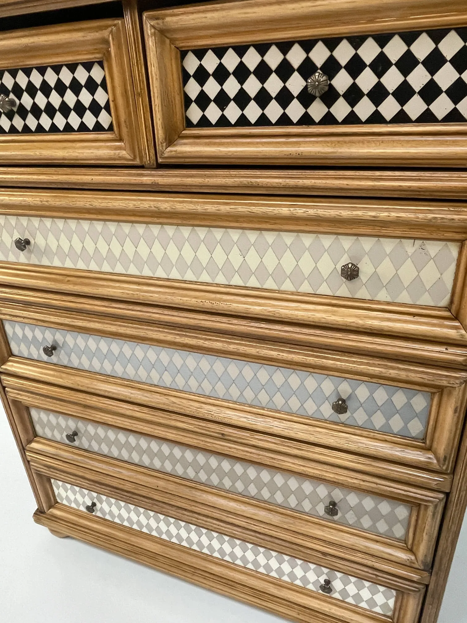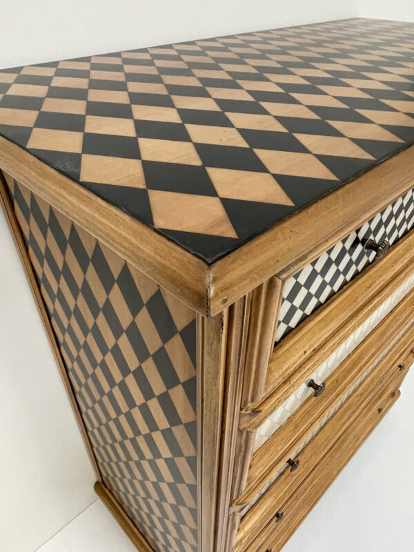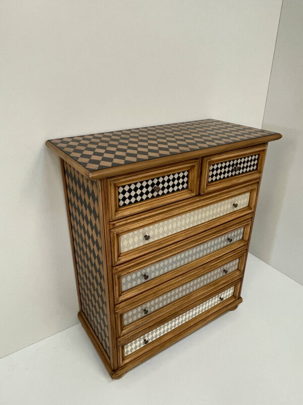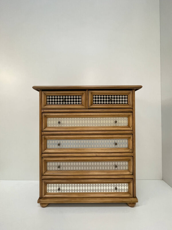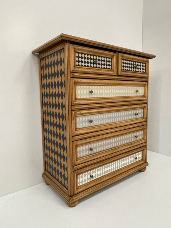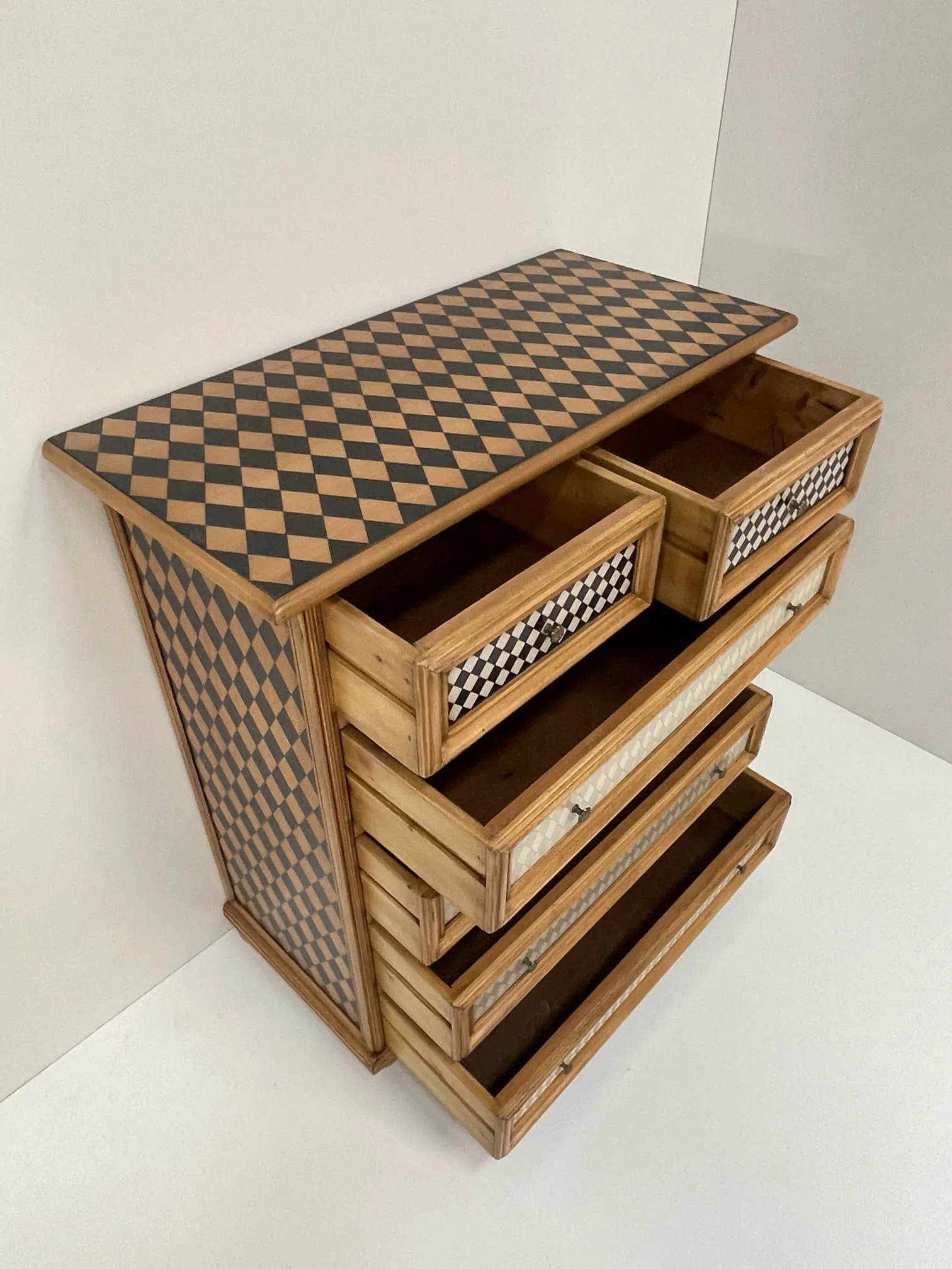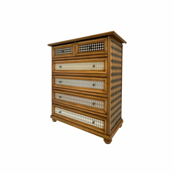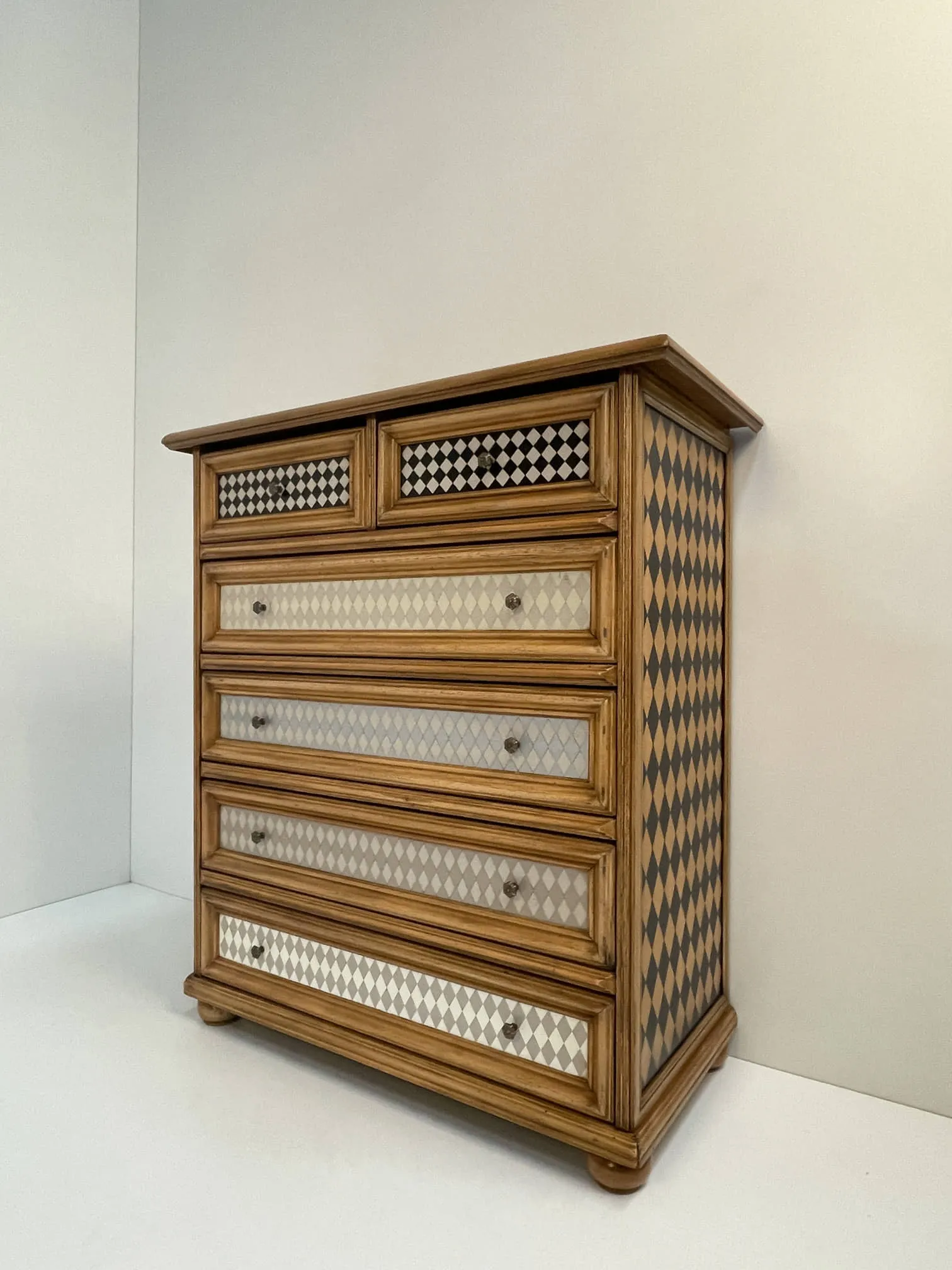 Cómoda pequeña de madera de nogal con 6 cajones, acabada en arena pero con detalles de rombos en los frentes de los cajones y laterales lacados en negro, café, plata patina, rosa fumee y marfil.