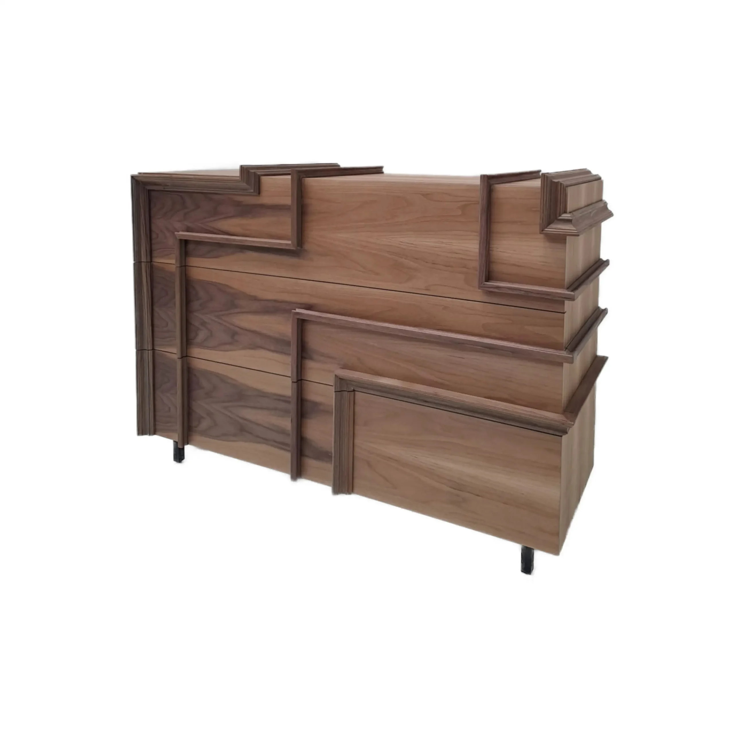 En su estructura se reconoce el trabajo manual de Lola Glamour, un proceso donde cada superficie se ajusta a conciencia y cada volumen se define con precisión. Este diseño permite que la pieza encaje en proyectos donde el interiorismo exige muebles de identidad clara y fabricación artesana. La construcción robusta en nogal y la composición de planos escalonados aportan una lectura arquitectónica que funciona tanto en ambientes amplios como en habitaciones que necesitan un mueble protagonista sin saturar el espacio.