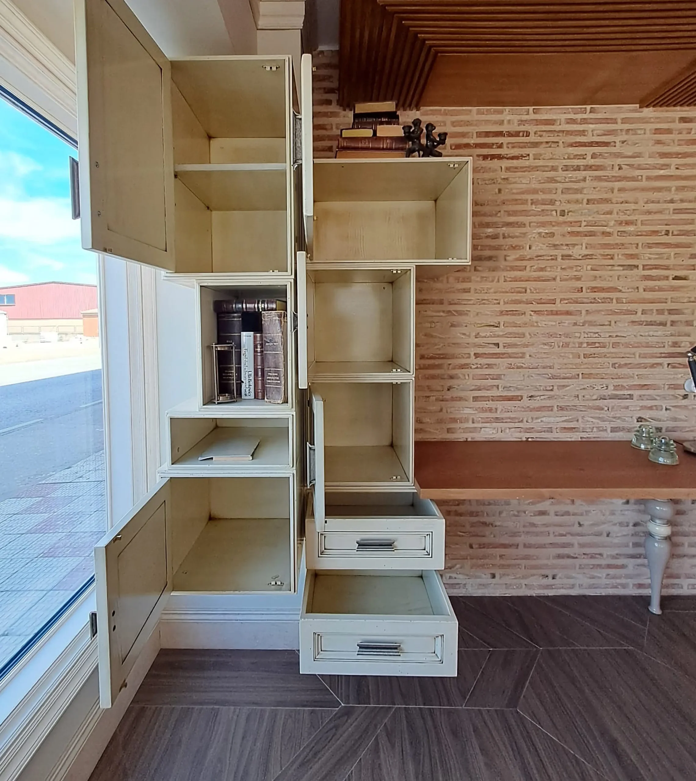 El escritorio Trama artesanal refleja el proceso manual que define a Lola Glamour. Cada módulo se ajusta a mano. Cada borde se revisa con atención. La composición escalonada no es solo un gesto estético. También mejora la organización y el almacenaje. Las puertas y cajones aprovechan bien el espacio y mantienen una estructura ligera.
