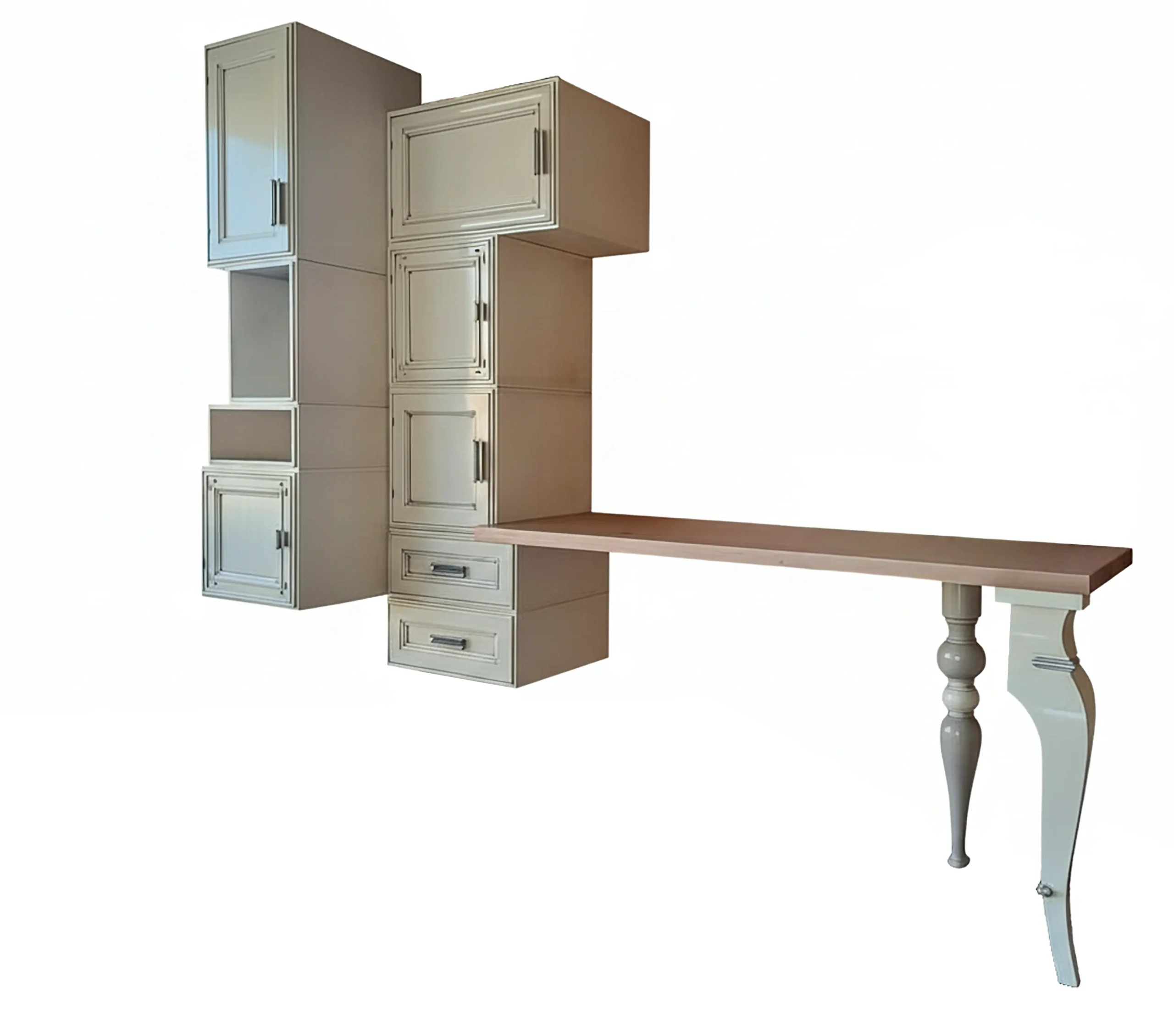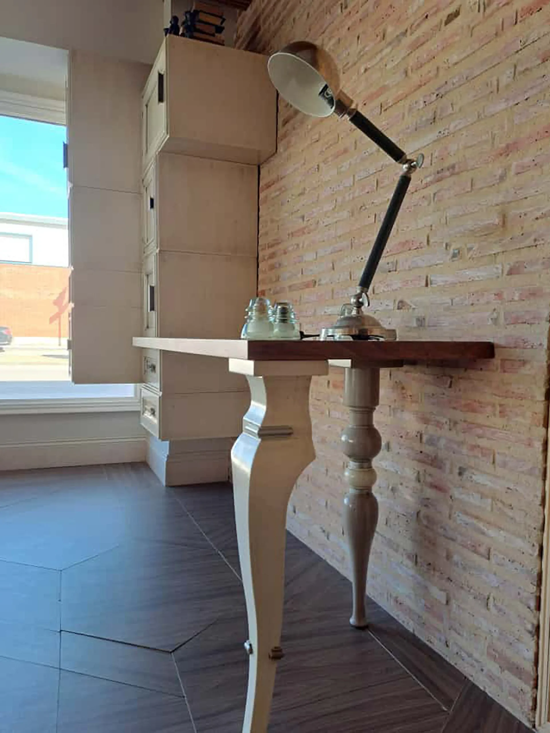 El escritorio Trama artesanal nace de un juego de volúmenes que se mueven con suavidad. Sus módulos parecen avanzar en pequeños pasos, creando un ritmo visual tranquilo. El tablero aporta ligereza y la pata torneada equilibra el diseño. La pieza combina un aire clásico con una lectura contemporánea. Su presencia es serena y transforma cualquier pared en un punto de interés.