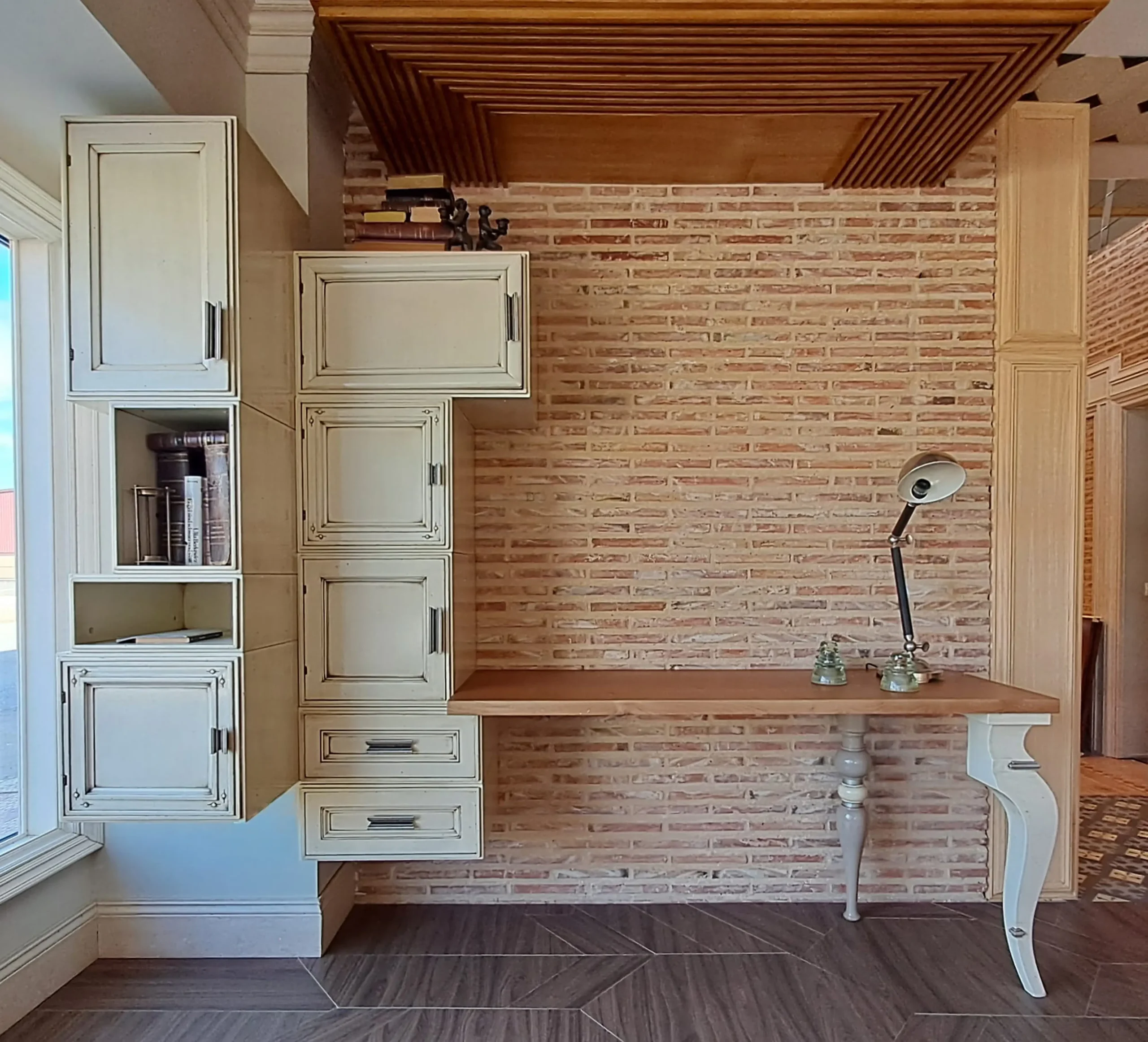 La parte suspendida ayuda a liberar el suelo y a dar amplitud visual. El escritorio funciona en estudios pequeños, zonas de trabajo o rincones donde se quiere añadir orden sin perder carácter.