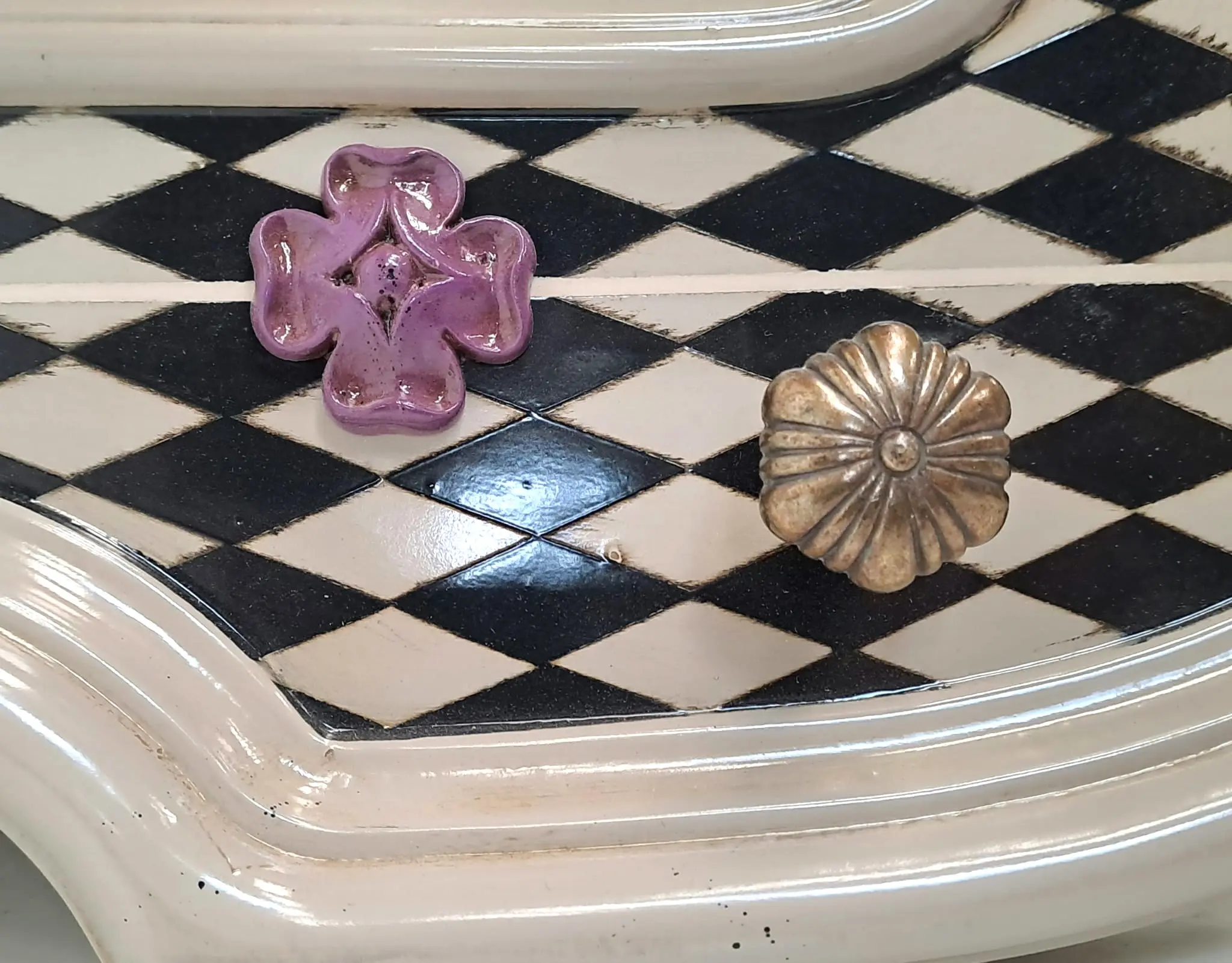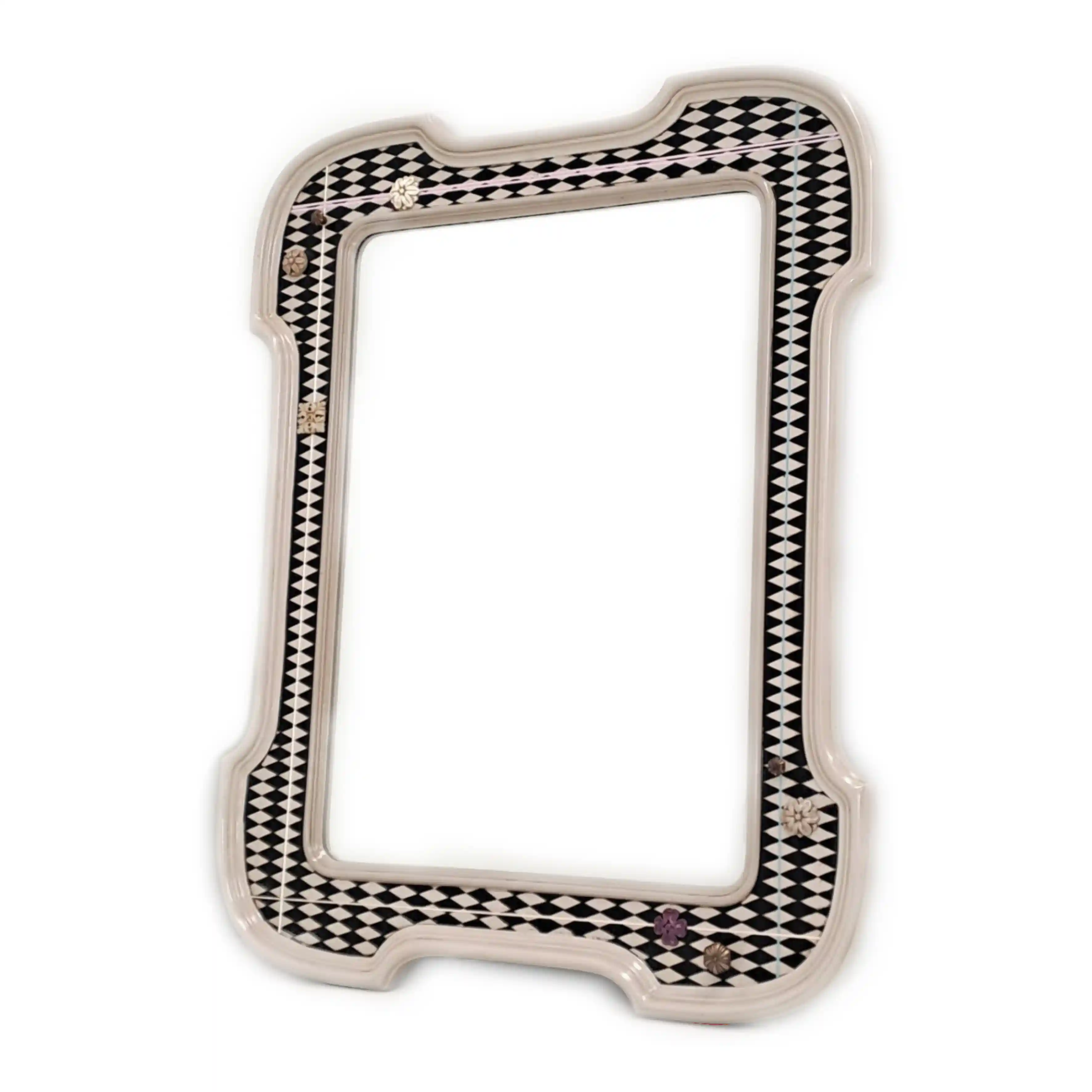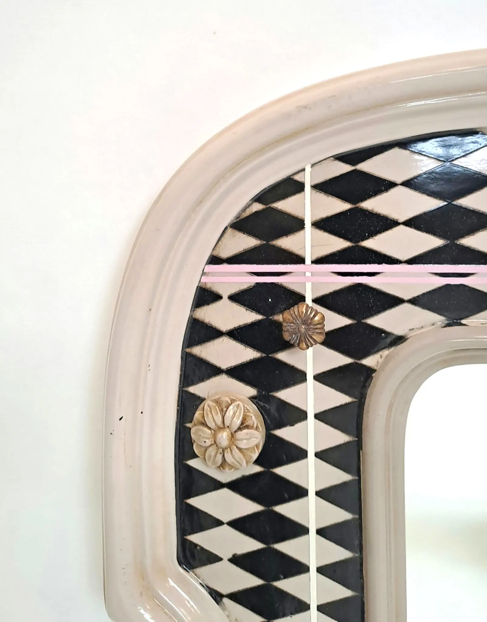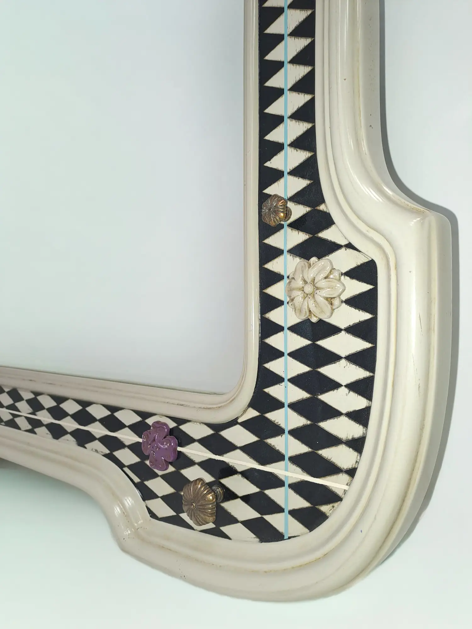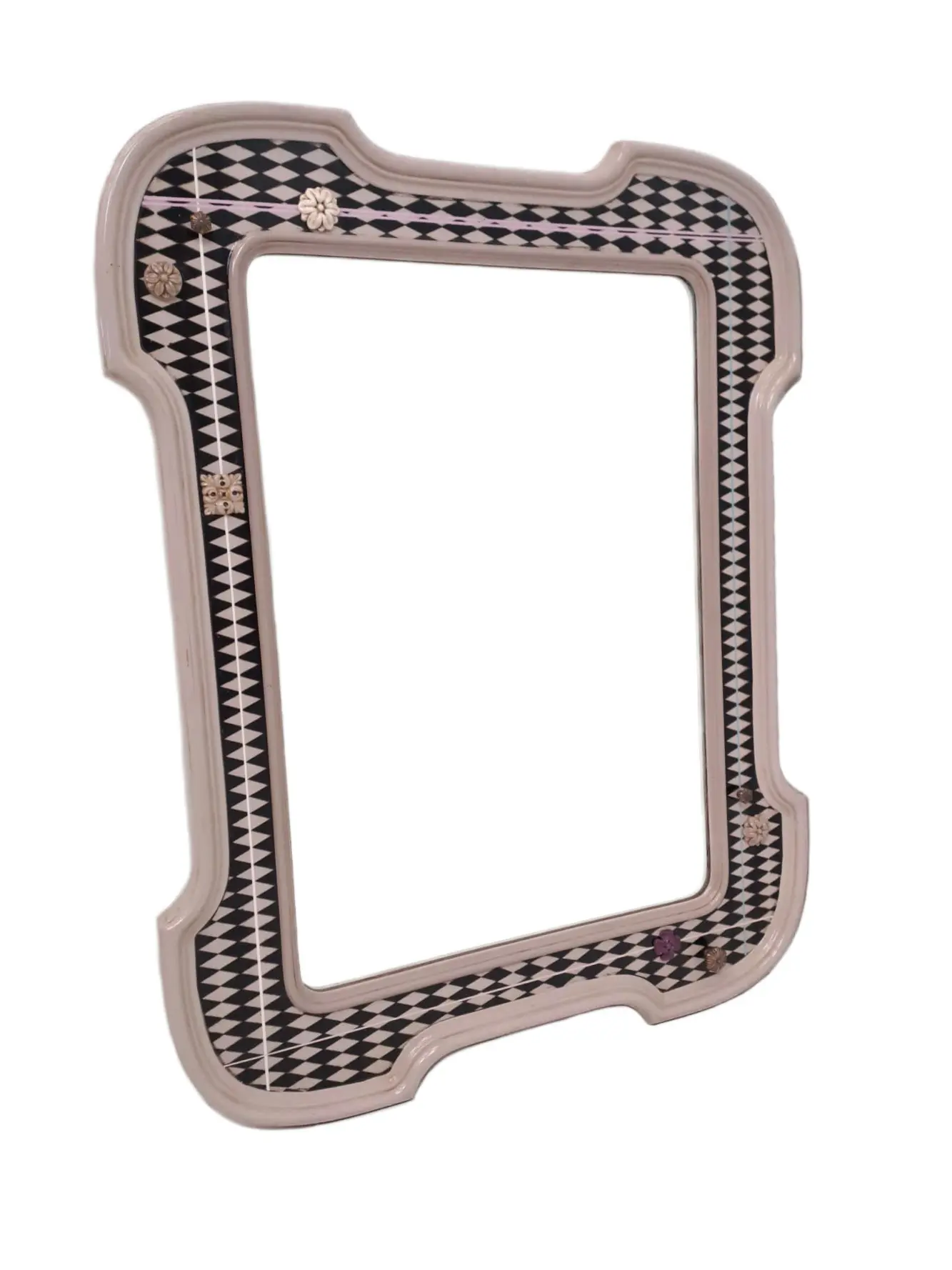 El Espejo Fábula presenta un diseño singular donde se mezcla un patrón geométrico en rombos con un marco artesanal de curvas suaves y relieves decorativos. Su estética combina lo gráfico con lo ornamental, creando una pieza con personalidad propia dentro del universo creativo de Lola Glamour.