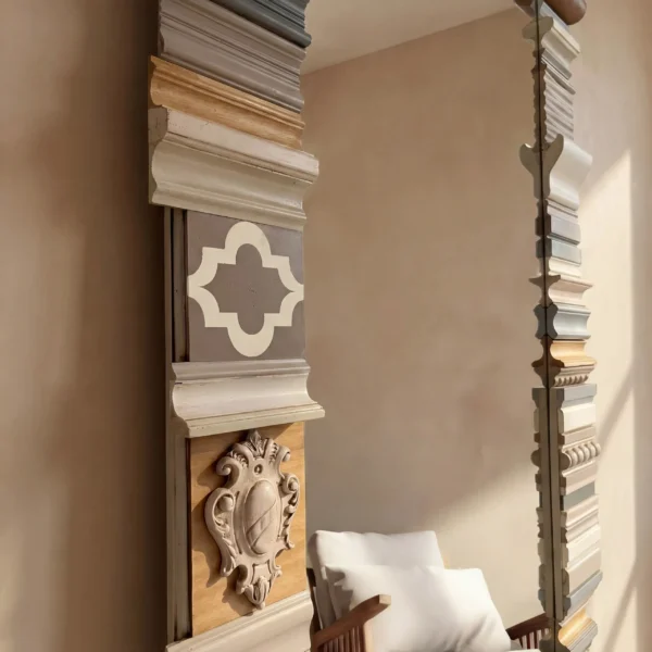 El alma de este espejo reside en su marco extraordinario. Haciendo honor a su nombre, Cornice presenta una curaduría de fragmentos arquitectónicos: una superposición estudiada de molduras, frisos antiguos y elementos clásicos que parecen rescatados de diferentes épocas. Esta fusión ecléctica, unificada por una paleta de tonos neutros, grises y maderas, crea una textura visual rica y sofisticada que funciona en perfecta armonía con interiores contemporáneos o de corte industrial-chic.