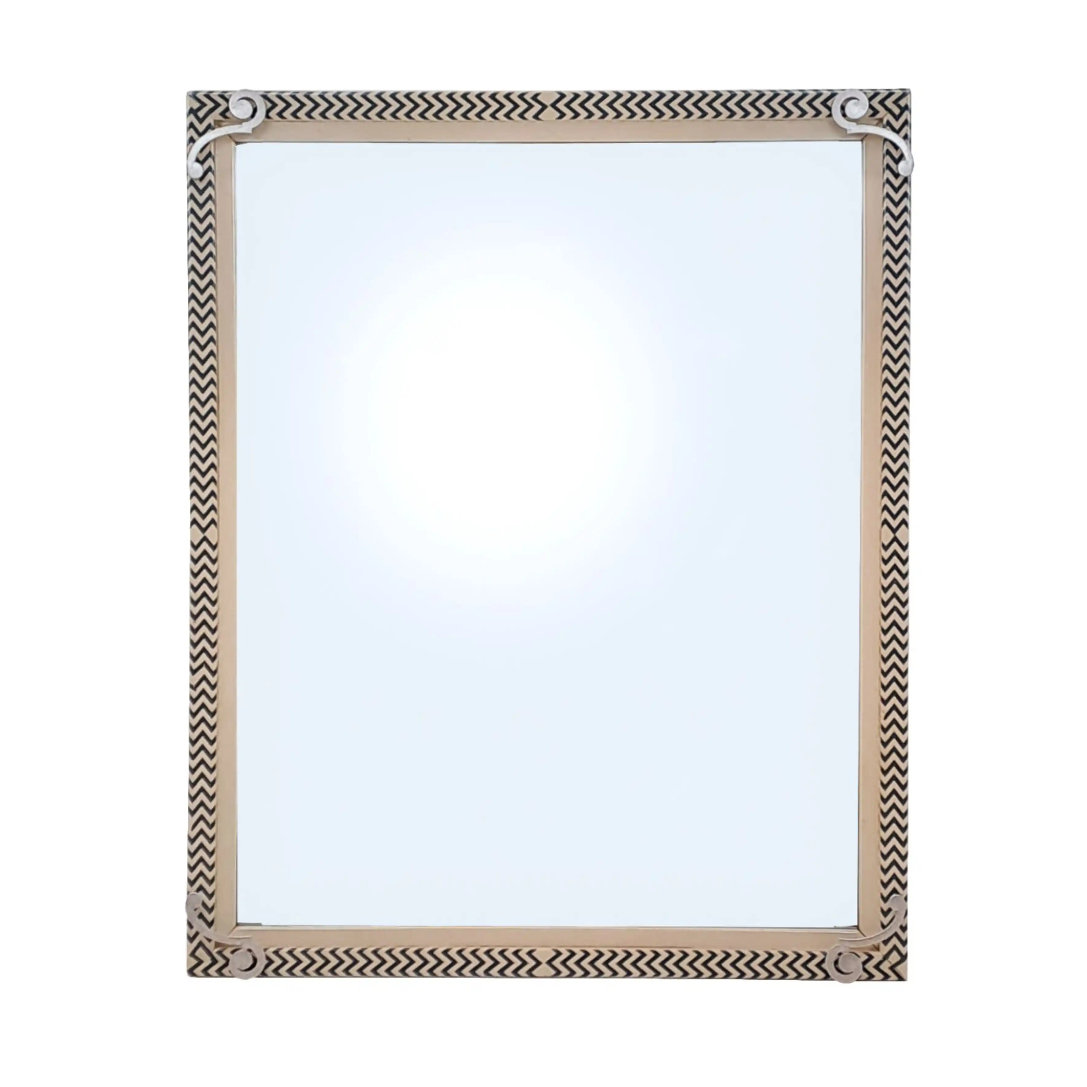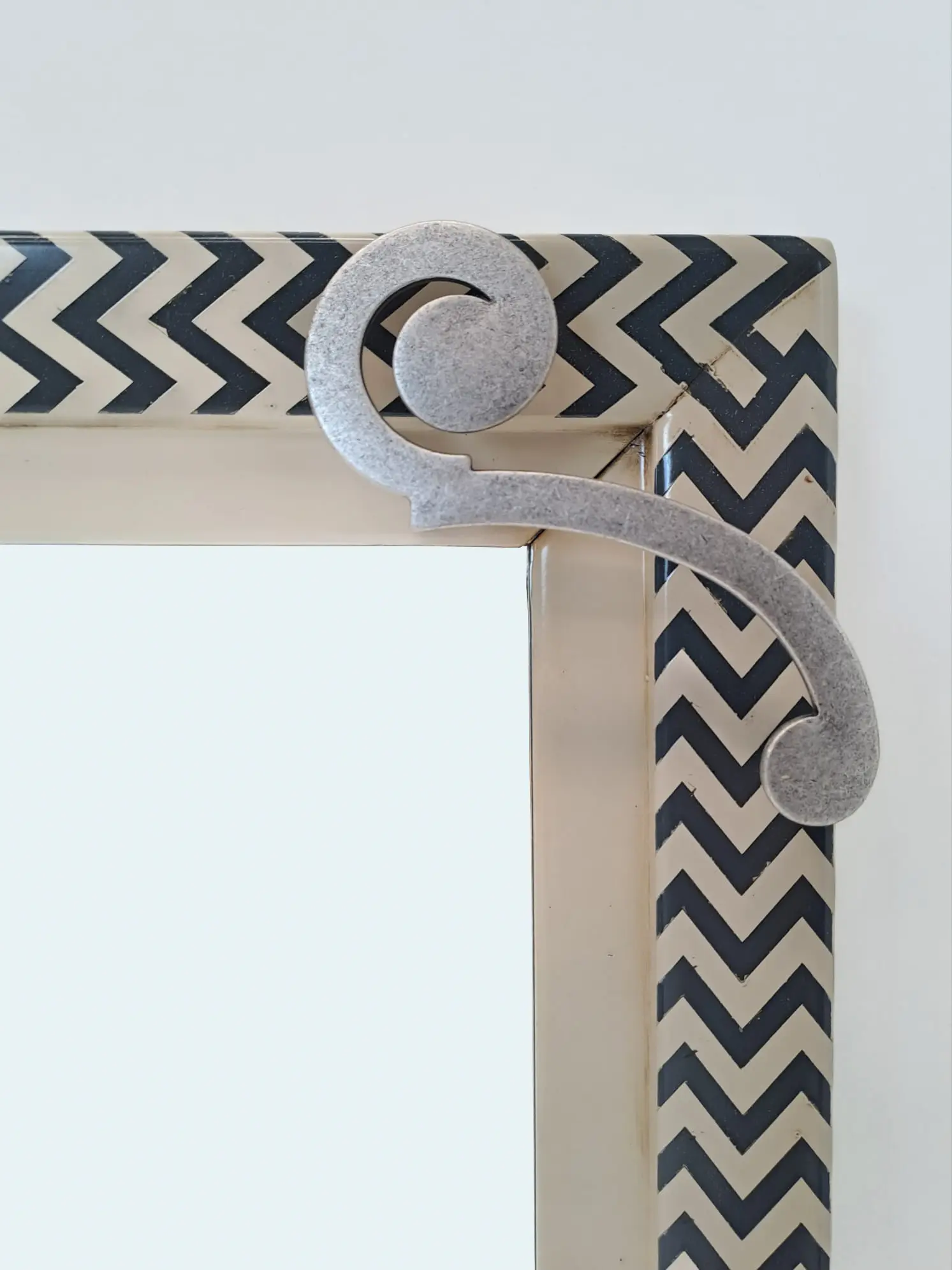 El marco recoge una secuencia de líneas en zigzag trabajadas de manera manual sobre madera. La combinación de tonos neutros genera una pieza versátil que funciona tanto en interiores sobrios como en espacios más atrevidos. Las piezas metálicas situadas en las esquinas aportan un punto escultórico que refuerza el lenguaje visual del diseño.
