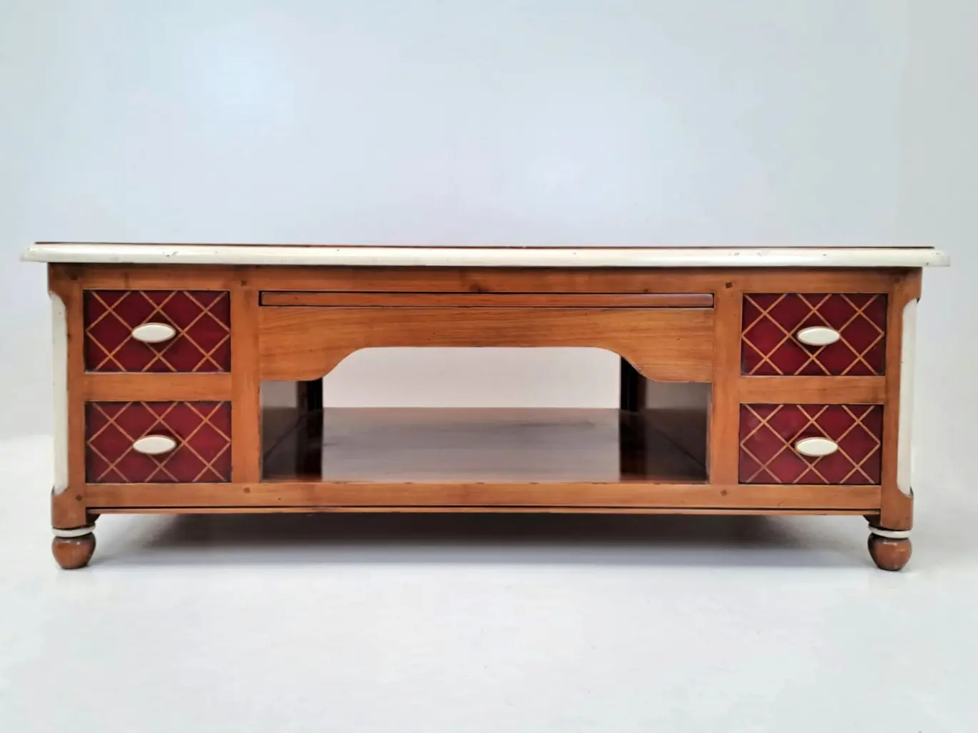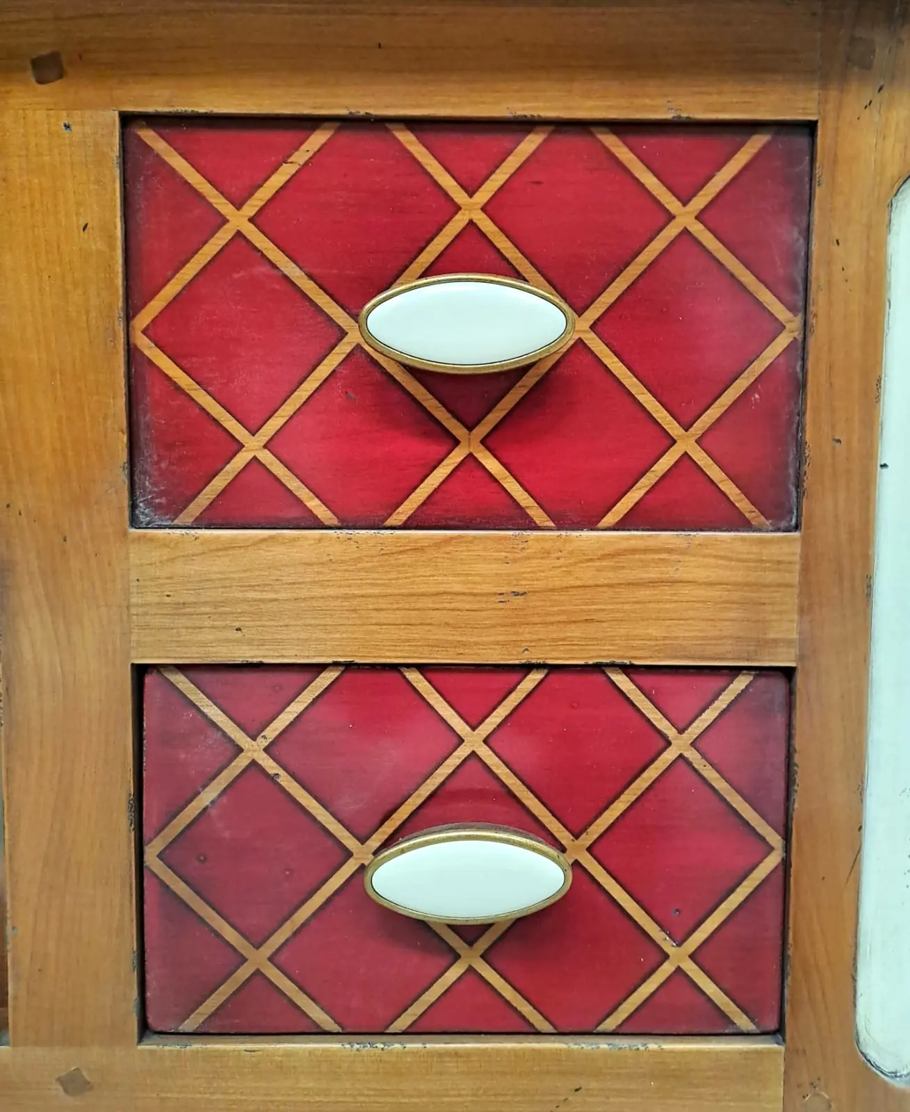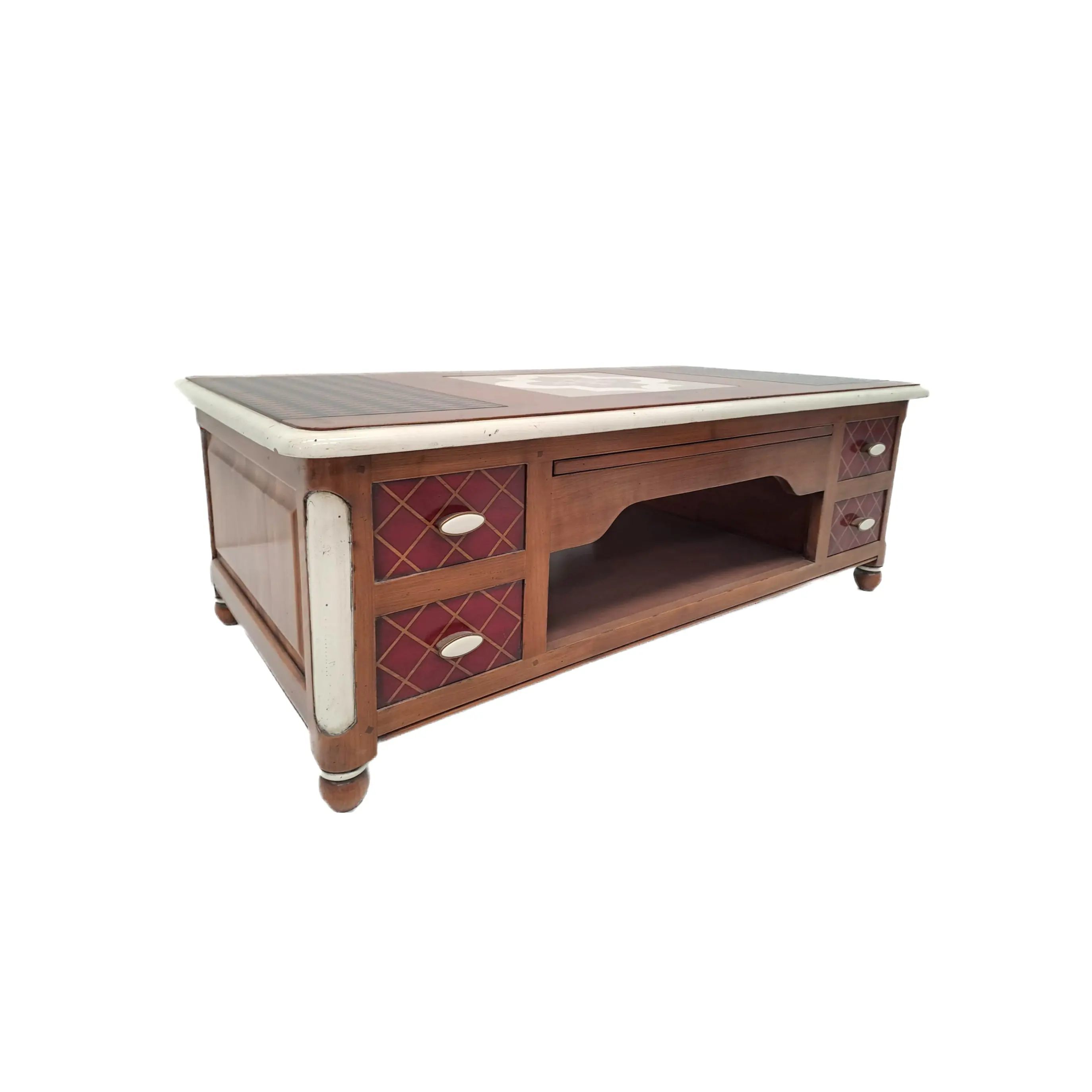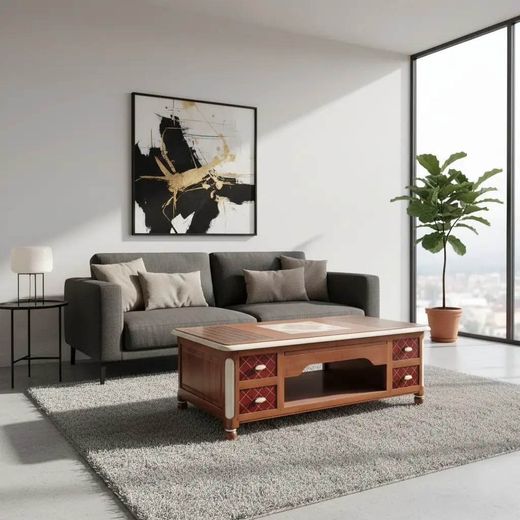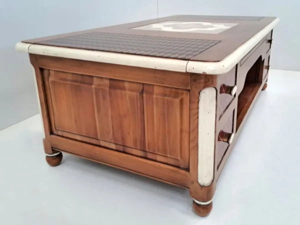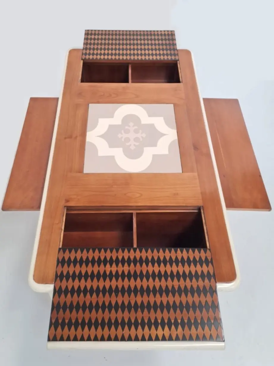 La mesa de centro Dualia combina madera maciza, diseño gráfico y una construcción cuidada que refuerza su carácter original. Esta mesa cuenta con un secreto, mas sus cajones laterales con acabado rojo en rombo no se abren, pero el diseño desemboca en dos trampillas decoradas en la parte superior dando paso al espacio de almacenaje, lo que convierte esta pieza en práctica y completamente única.