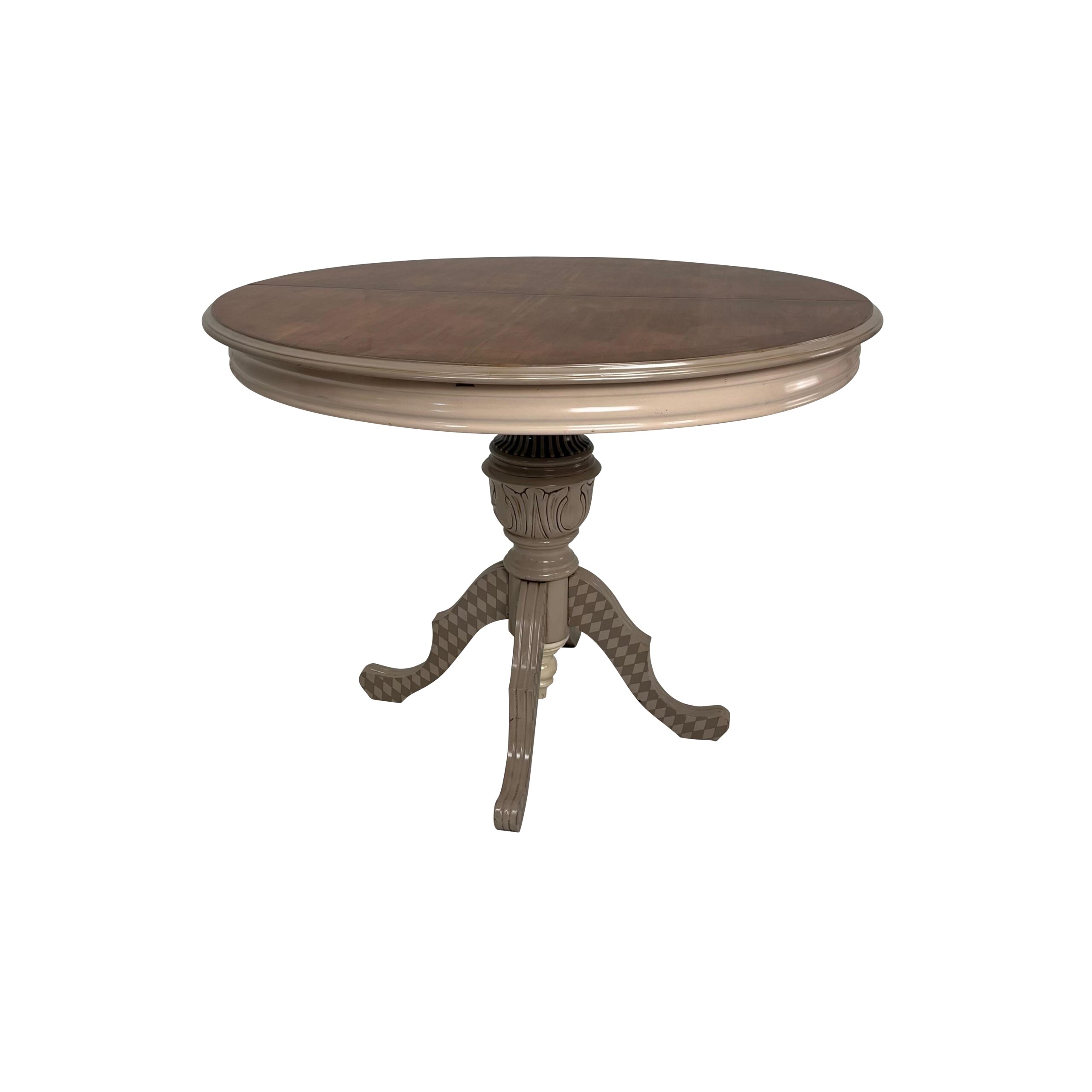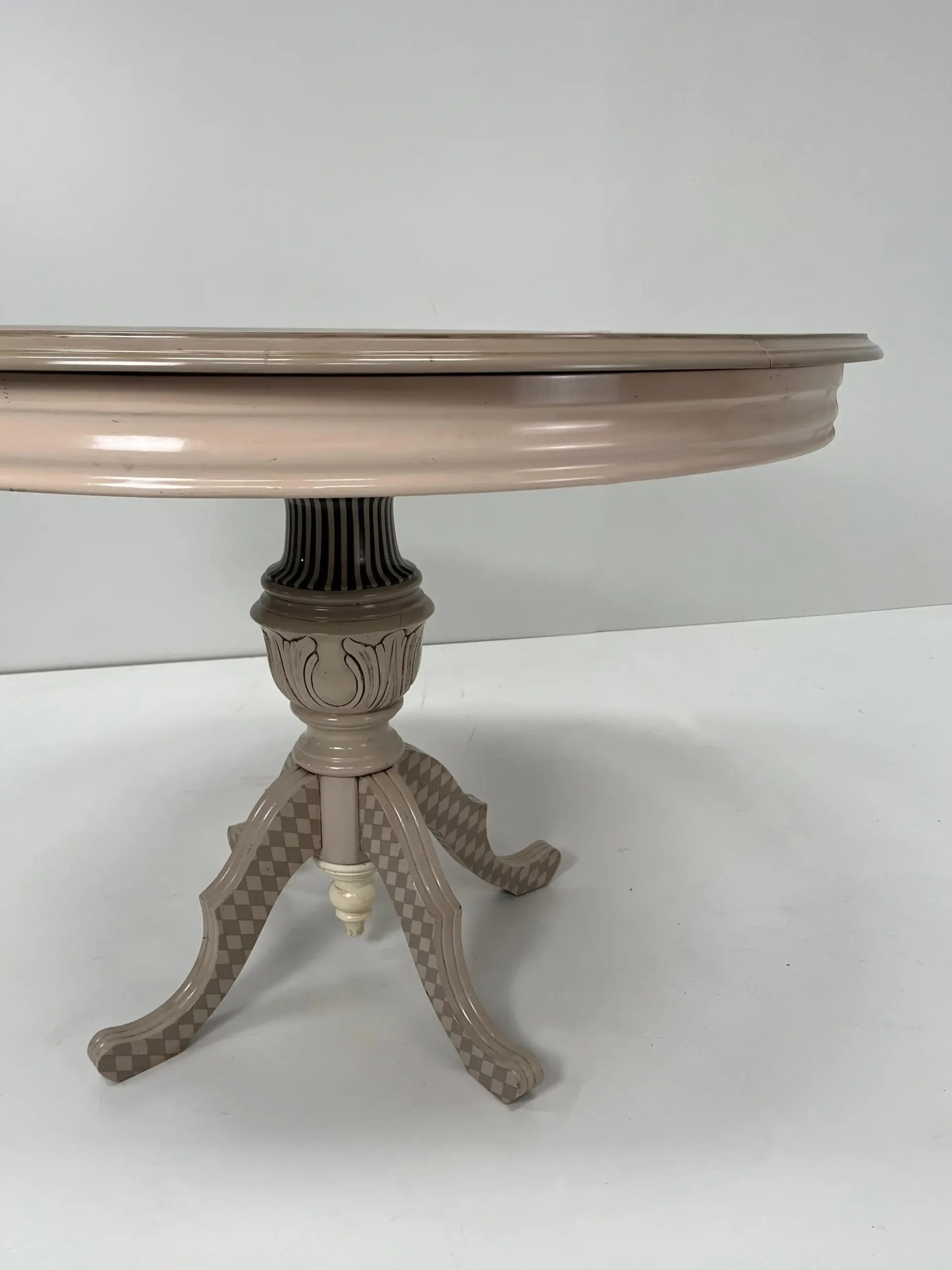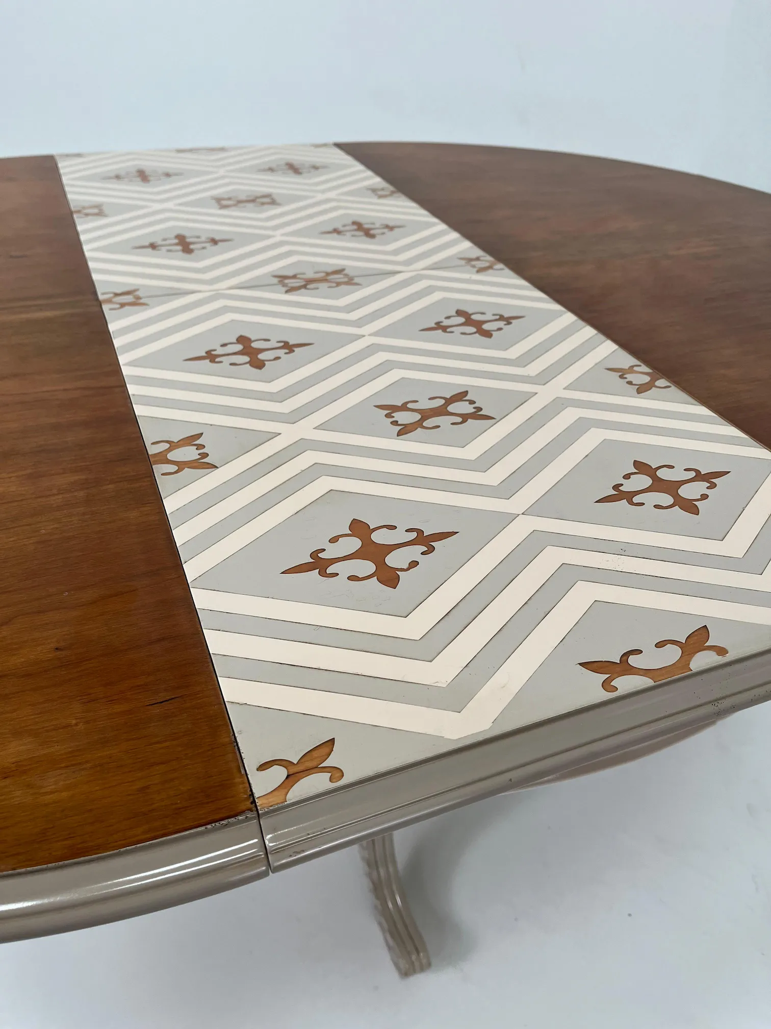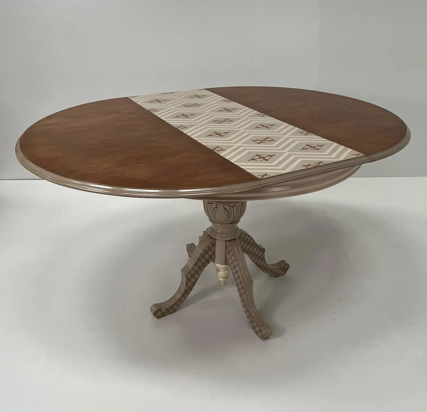 Mesa de comedor Mudea diseñada como una pieza desplegable, pensada para ampliar el espacio útil de forma rápida sin alterar la estética del conjunto. La estructura combina madera natural en la superficie con una banda geométrica en tonos crema y terracota y un pedestal central realizado en madera tallada con acabado artesanal. La mesa ofrece una presencia equilibrada que encaja en proyectos donde se buscan materiales cálidos y un diseño con identidad.