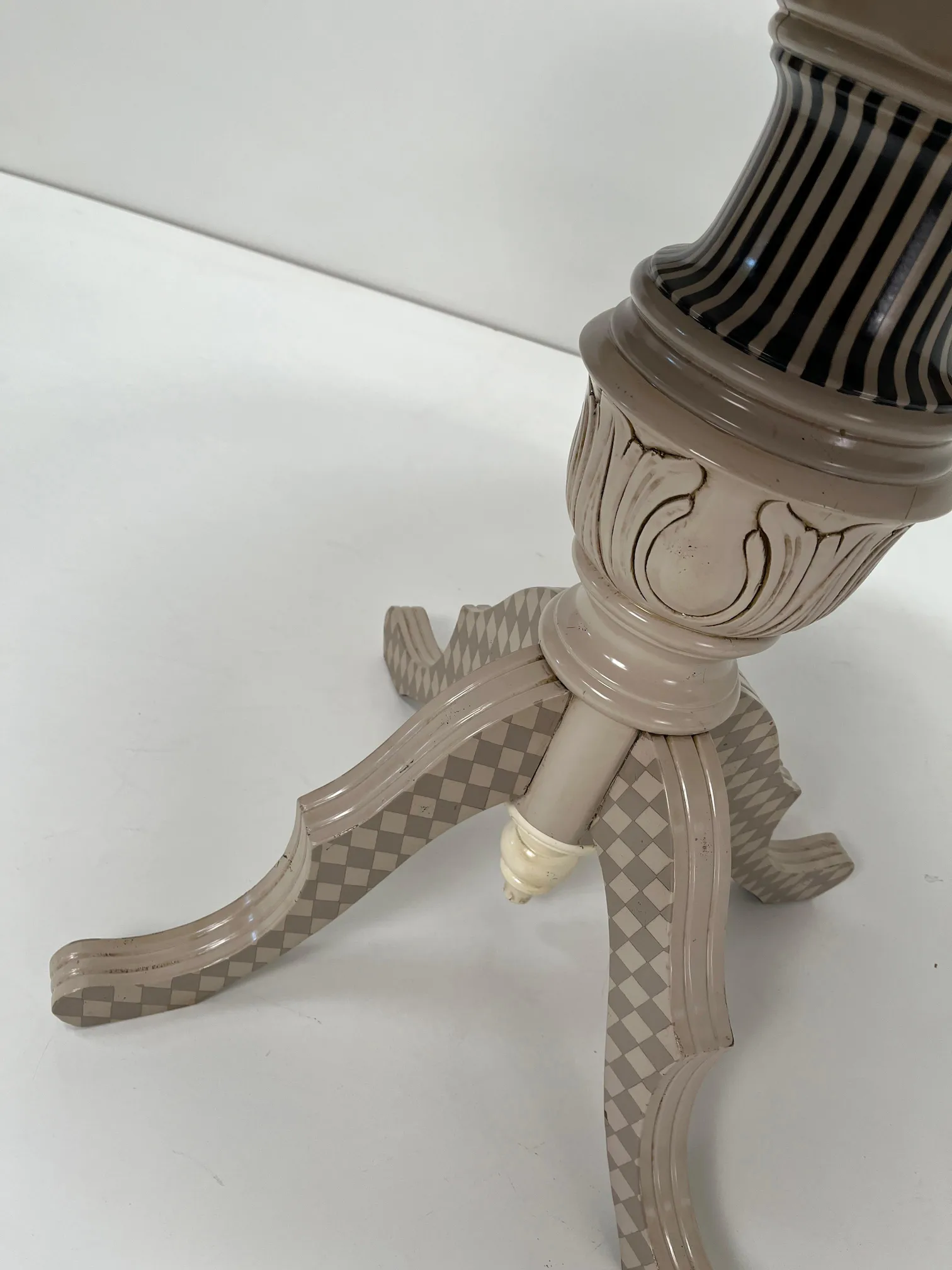 La mesa de comedor Mudea se fabrica de manera artesanal en el taller de Lola Glamour. La estructura combina madera cálida con una banda central decorada con un patrón geométrico en tonos crema y terracota. Cada pata del pedestal se trabaja a mano para mantener continuidad visual y estabilidad. La superficie de madera presenta un acabado uniforme que resalta el dibujo natural y facilita el uso cotidiano. El conjunto mantiene una estética sólida que se adapta a estilos mediterráneos, rústicos y clásicos actualizados.
