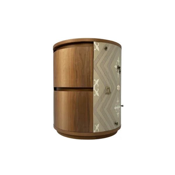 Mesilla de noche circular en madera de nogal que convierte un mueble auxiliar en una pieza protagonista. Sus cajones curvos y el lateral decorativo aportan ritmo y profundidad al diseño, mientras los herrajes y los acabados artesanales refuerzan su carácter singular. Una mesilla pensada para dormitorios donde el diseño no es un complemento, sino parte esencial del espacio.