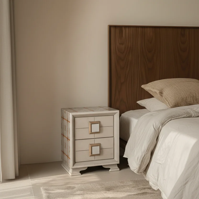 Pequeña pero con personalidad, esta mesilla de noche de dos cajones ofrece el equilibrio perfecto entre utilidad y diseño. Su estructura lacada con delicados detalles ornamentales convierte cada rincón en una expresión de estilo, mientras que los tiradores metálicos añaden un toque contemporáneo.