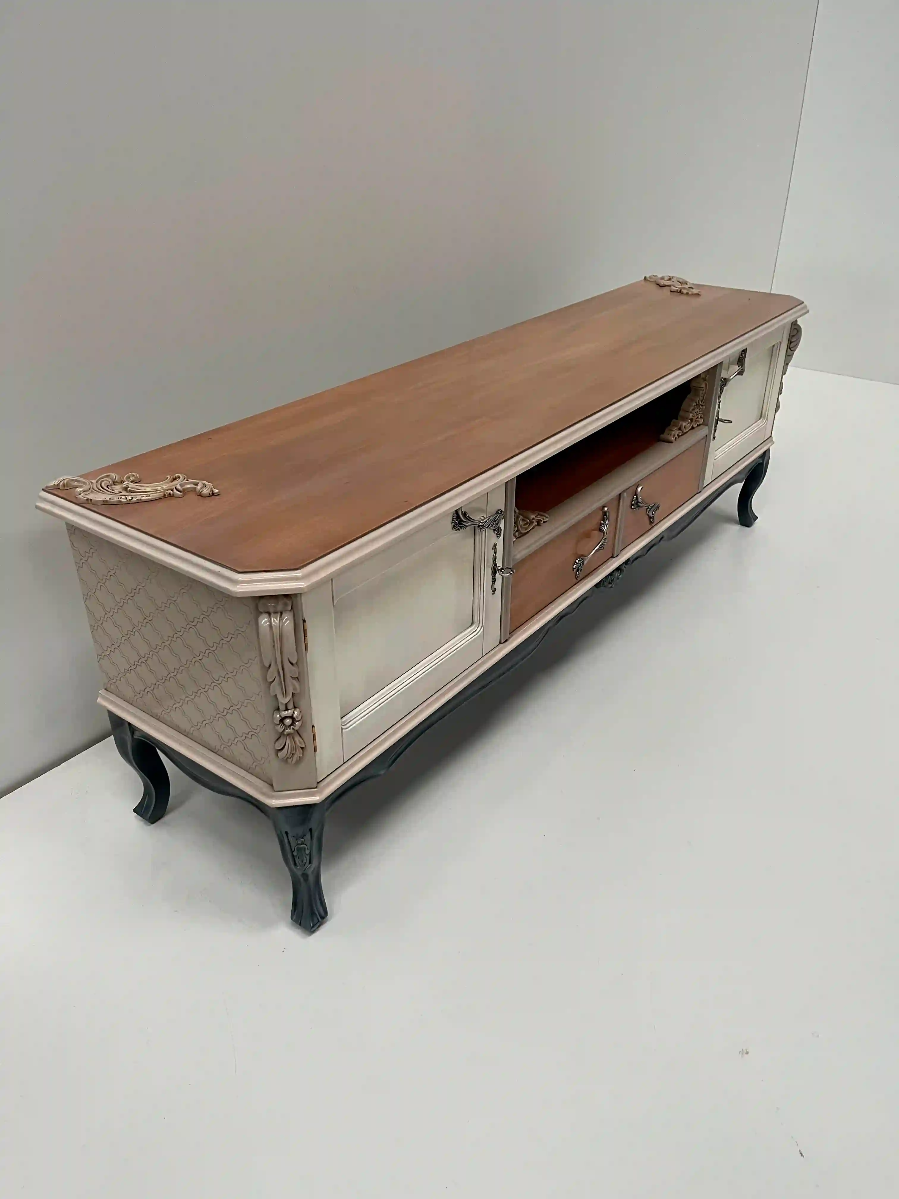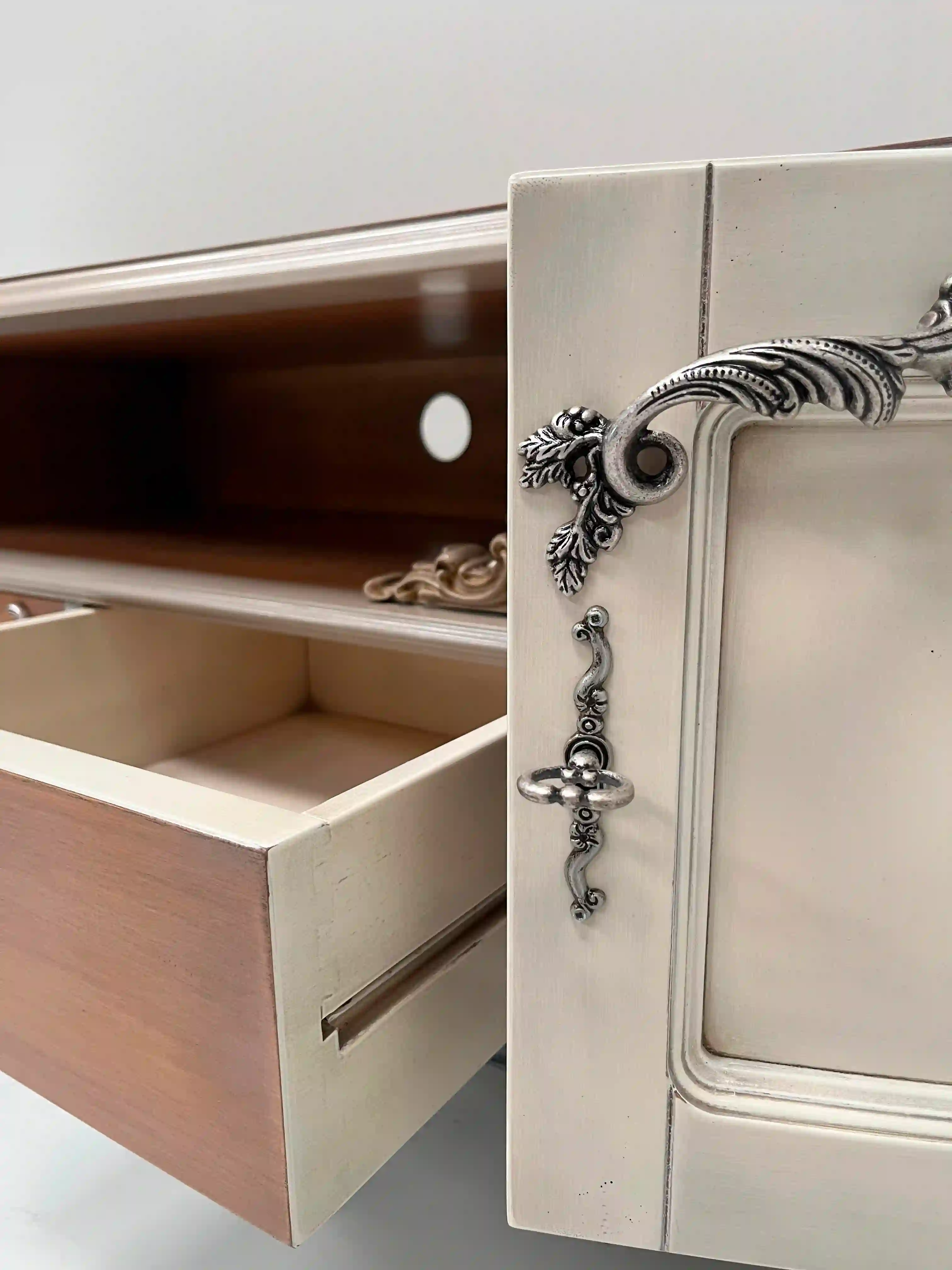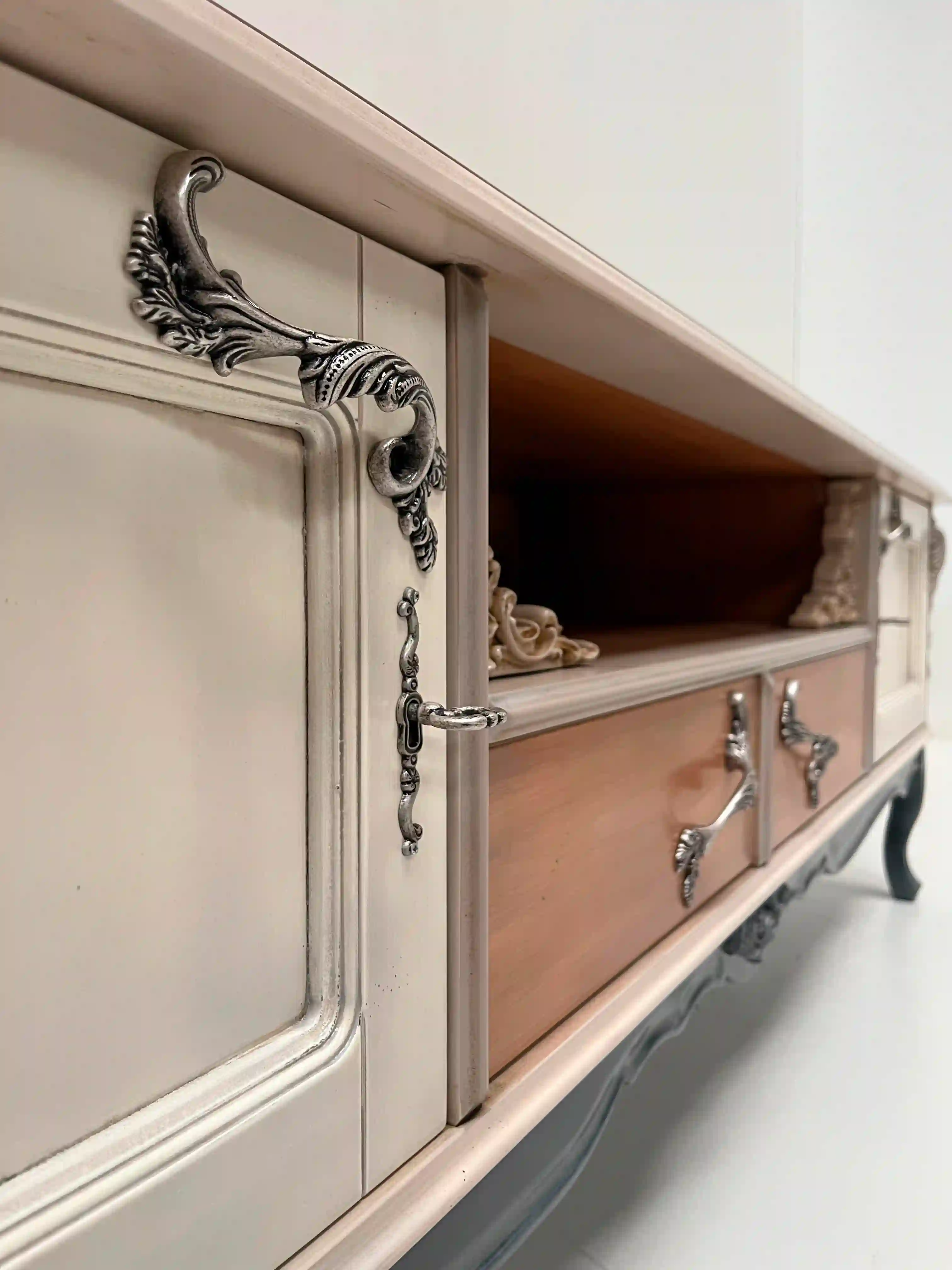 El Mueble TV Perle d’argent destaca por una elegancia tranquila que se percibe desde el primer vistazo. Sus tonos crema envuelven la superficie con una luz suave, mientras que las puertas muestran un acabado sedoso, ligeramente satinado, que revela pequeñas veladuras para aportar profundidad. A los laterales, los motivos geométricos grabados añaden textura y un movimiento discreto. La madera natural de los cajones centrales introduce un contraste cálido y amable frente a las zonas más claras. Además, las molduras talladas —hojas, flores y volutas— emergen con sutileza en los bordes, acompañadas por herrajes plateados envejecidos que evocan un antiguo taller de orfebrería. Las patas, en gris profundo y brillante, elevan el conjunto con ligereza. Cada detalle visible, desde la llave metálica hasta la veta interior, refuerza la sensación de una pieza construida con dedicación y luz.