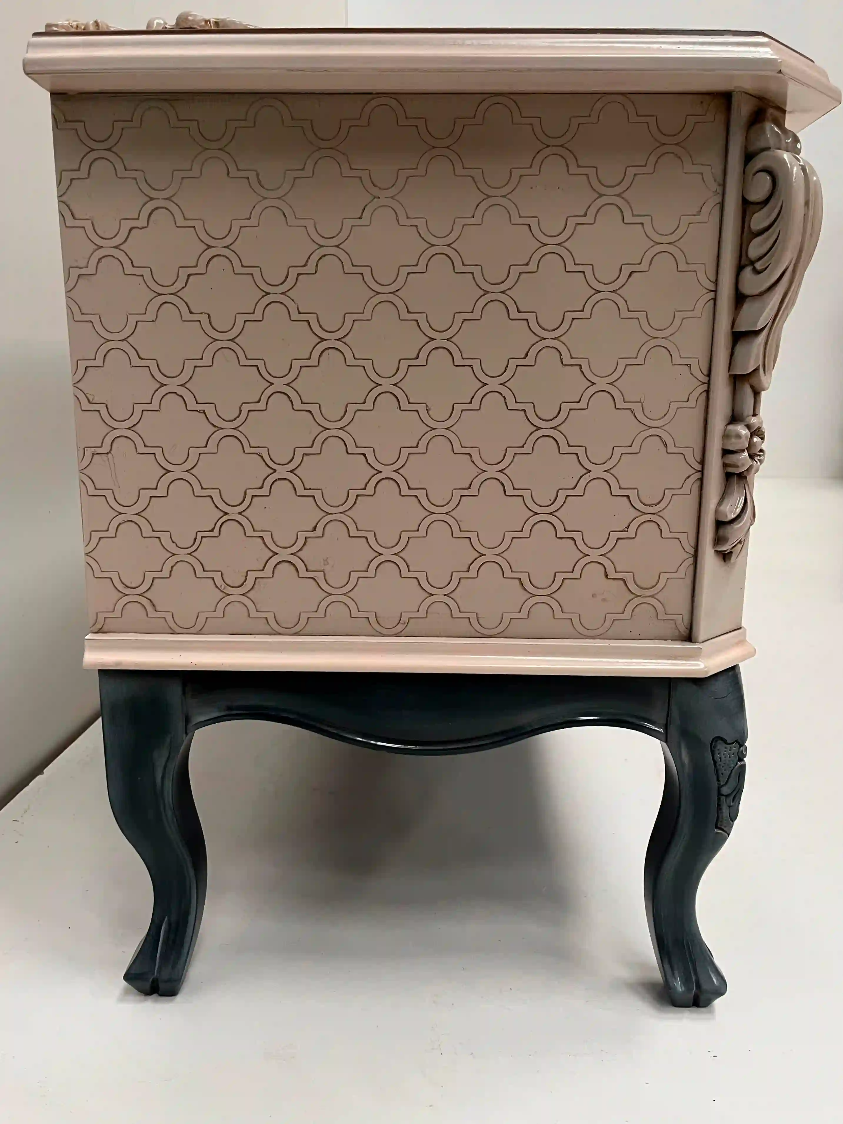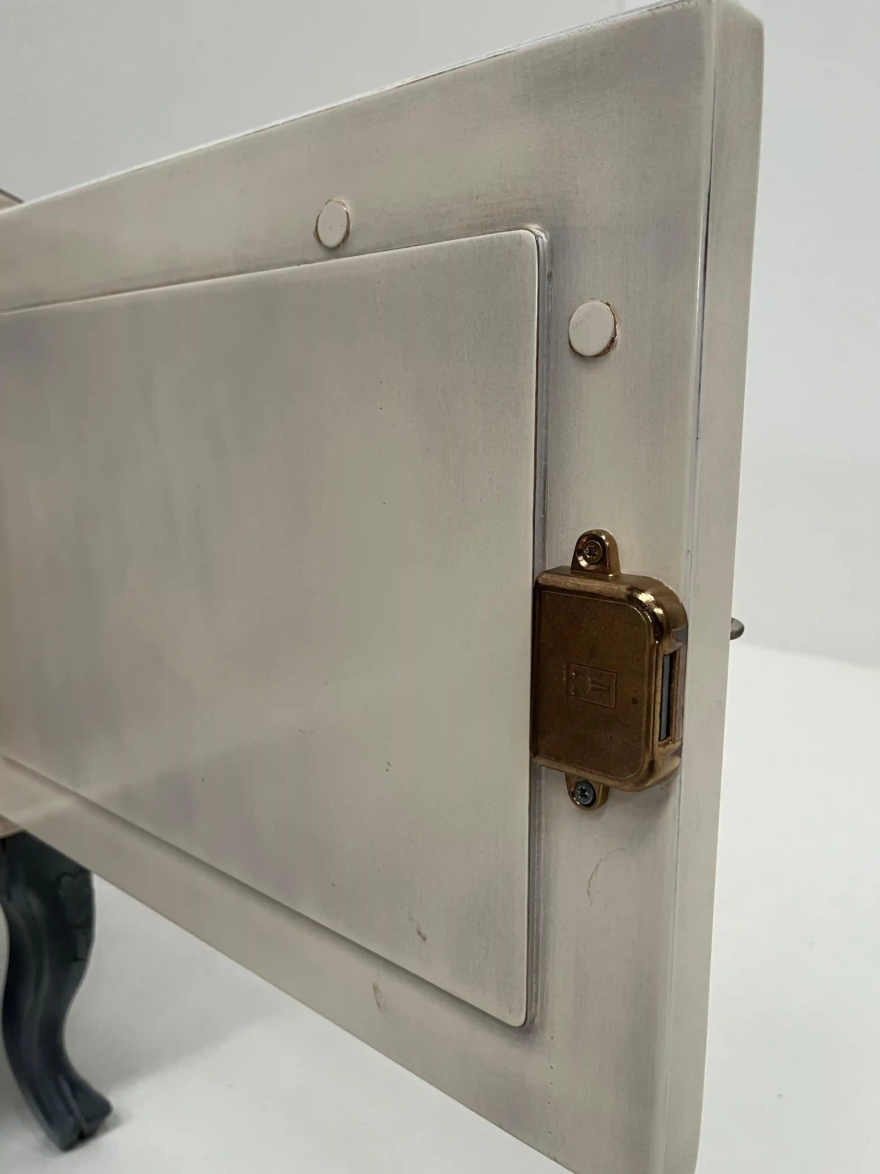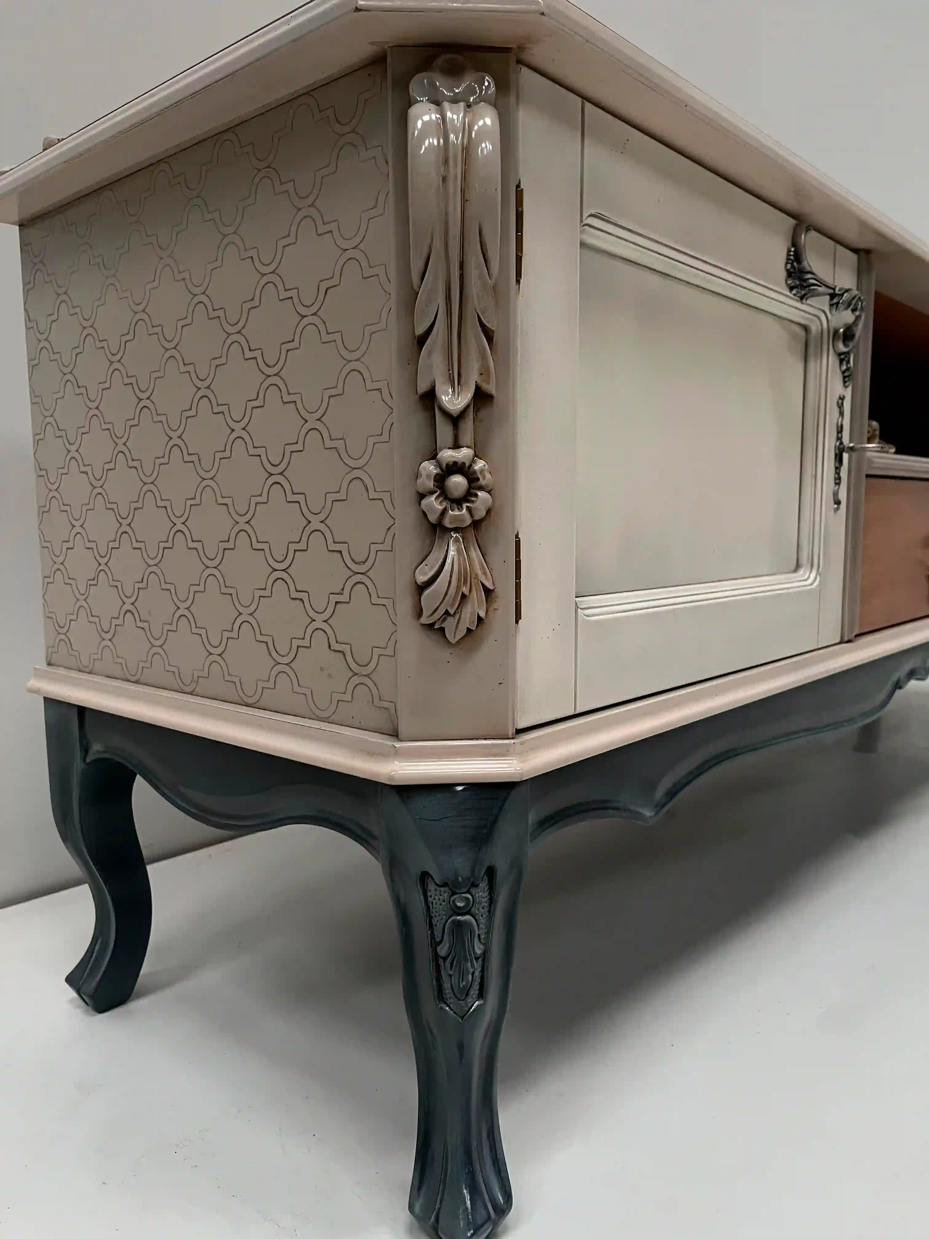 El Mueble TV Perle d’argent destaca por una elegancia tranquila que se percibe desde el primer vistazo. Sus tonos crema envuelven la superficie con una luz suave, mientras que las puertas muestran un acabado sedoso, ligeramente satinado, que revela pequeñas veladuras para aportar profundidad. A los laterales, los motivos geométricos grabados añaden textura y un movimiento discreto. La madera natural de los cajones centrales introduce un contraste cálido y amable frente a las zonas más claras. Además, las molduras talladas —hojas, flores y volutas— emergen con sutileza en los bordes, acompañadas por herrajes plateados envejecidos que evocan un antiguo taller de orfebrería. Las patas, en gris profundo y brillante, elevan el conjunto con ligereza. Cada detalle visible, desde la llave metálica hasta la veta interior, refuerza la sensación de una pieza construida con dedicación y luz.