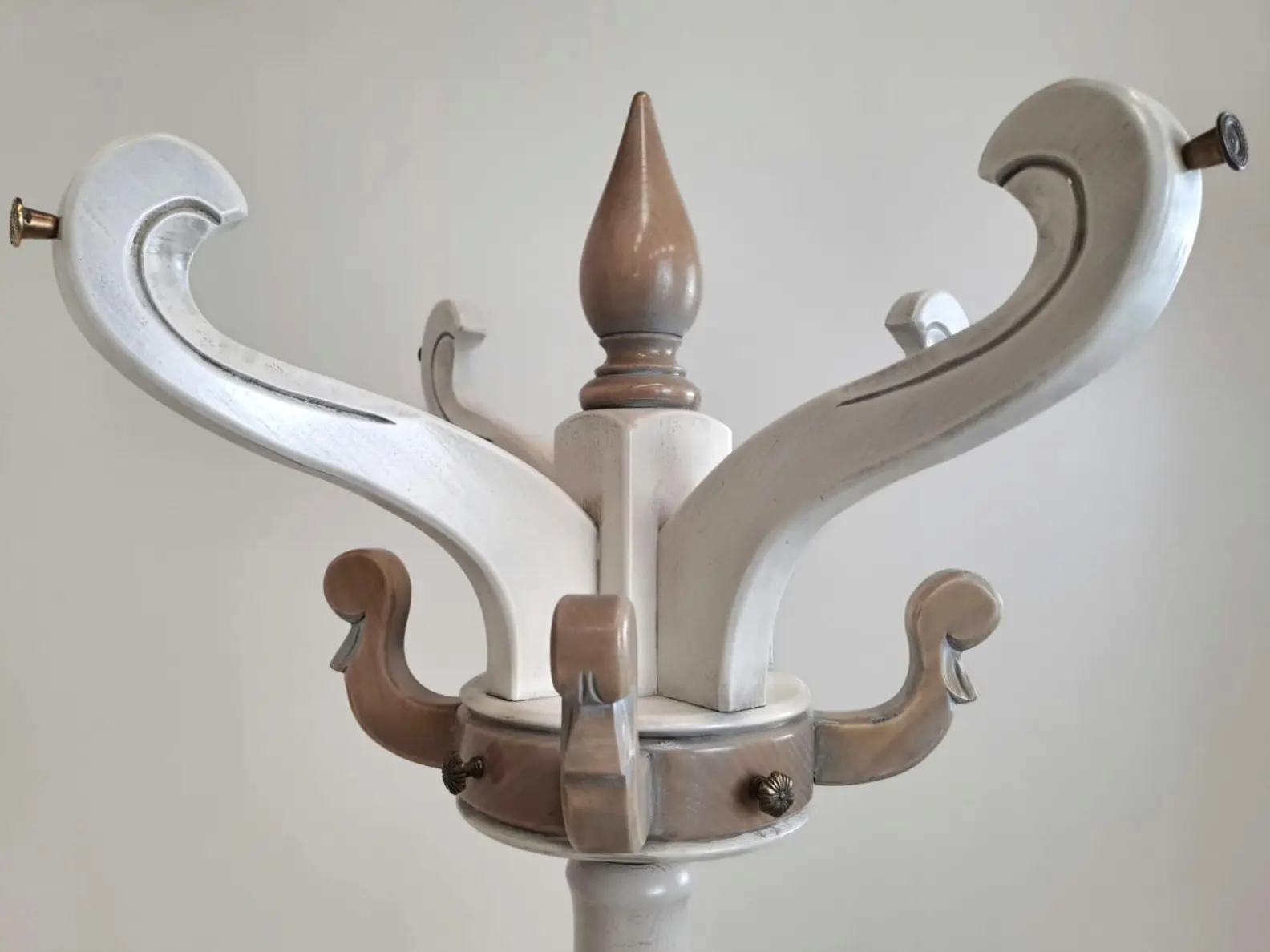 El perchero D’Avorio destaca por su silueta curvada, su equilibrio formal y su presencia discreta, adecuada para acompañar entradas y pasillos donde se busca elegancia sin recurrir a elementos voluminosos. Trabajado en madera maciza con un acabado claro, combina zonas lisas con detalles tallados que aportan textura y profundidad visual.