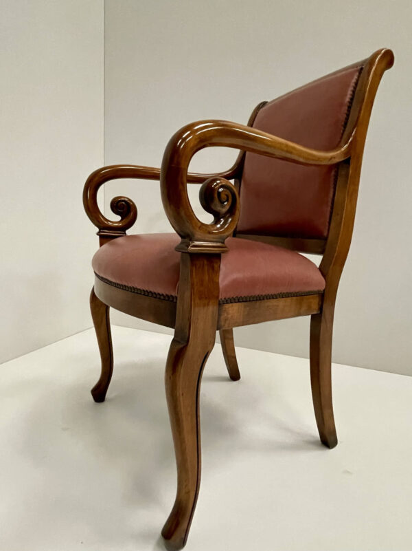 Silla de madera de haya acabada en pardo. Tapizado en un tono rojizo