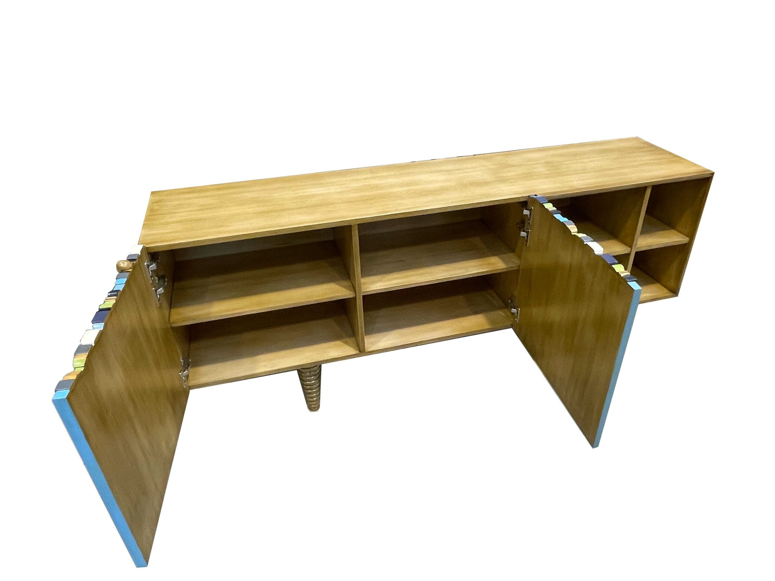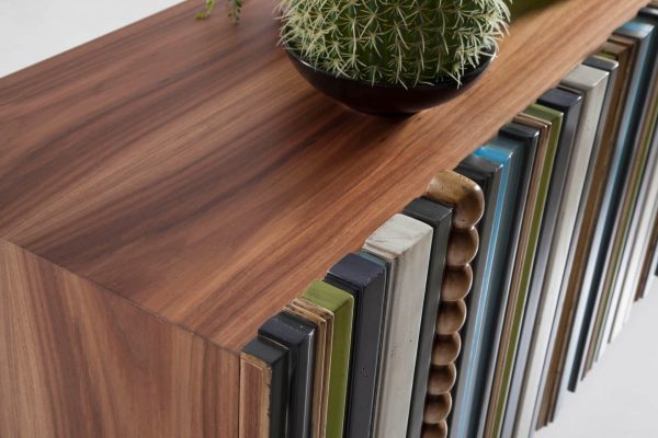 Alto: 78 cmCada una de las piezas de la serie Reina atrapa por su exclusiva combinación de colores y el trabajo artesanal que encierra su consecución final. En este caso, la hemos revisitado con otra gama de colores en la que destaca el Verde Oliva, el Índigo o el Carbón, en las dos puertas y la veteada madera de Australia en la caja, con patas sutilmente más estilizadas.
