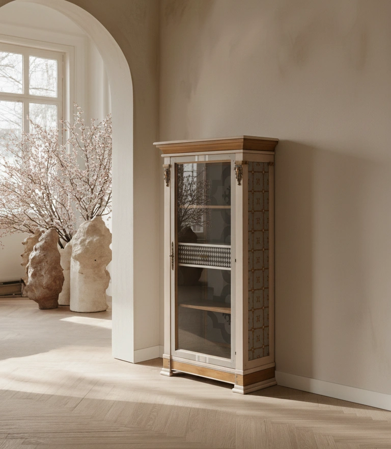 La vitrina San Juan redefine el concepto de almacenamiento con su diseño atrevido y sus acabados cuidadosamente trabajados. El cajón interior, con un llamativo patrón de rombos y tiradores dorados, aporta un carácter distintivo. La combinación de cristal y madera en los estantes interiores realza la elegancia mientras resguarda tus objetos más preciados.