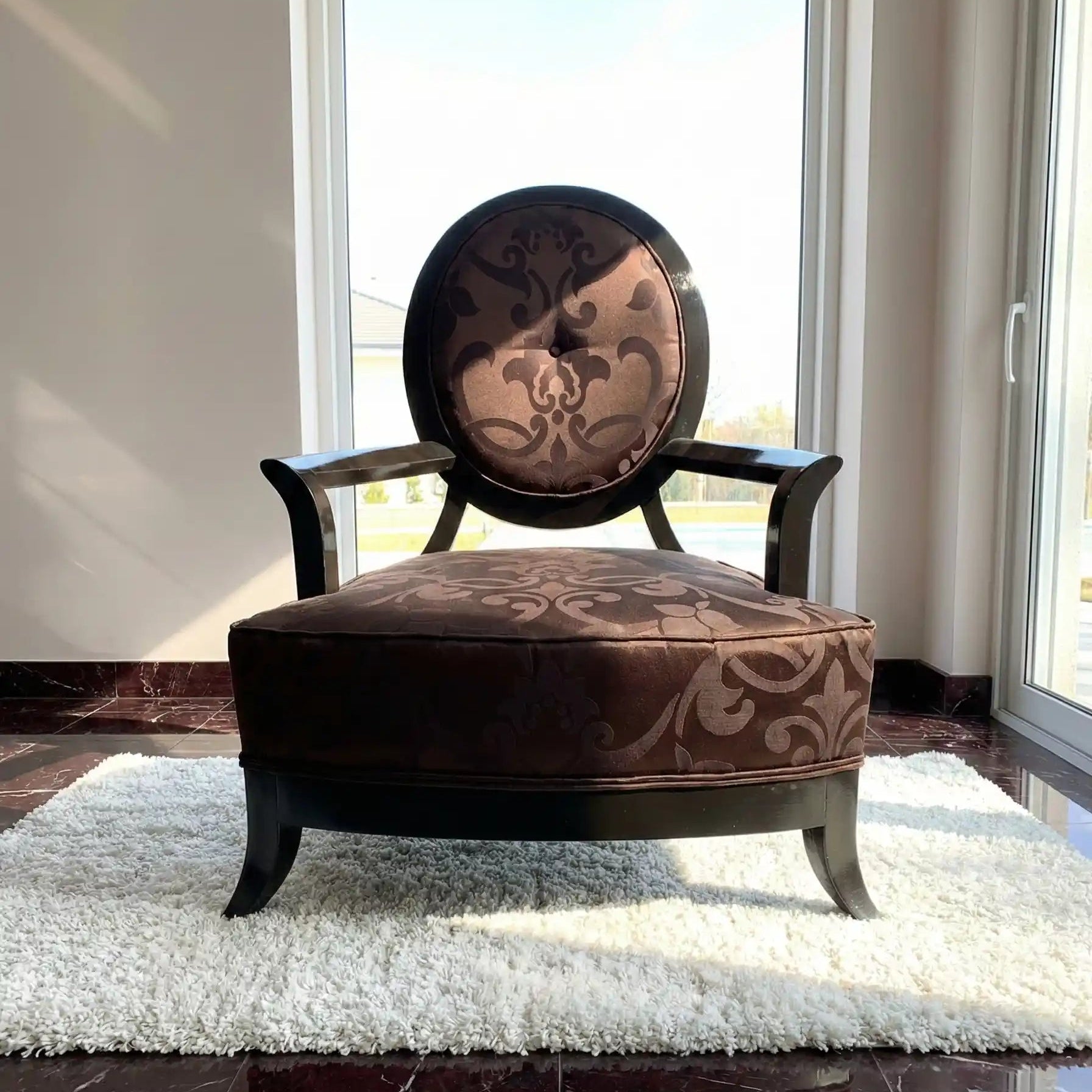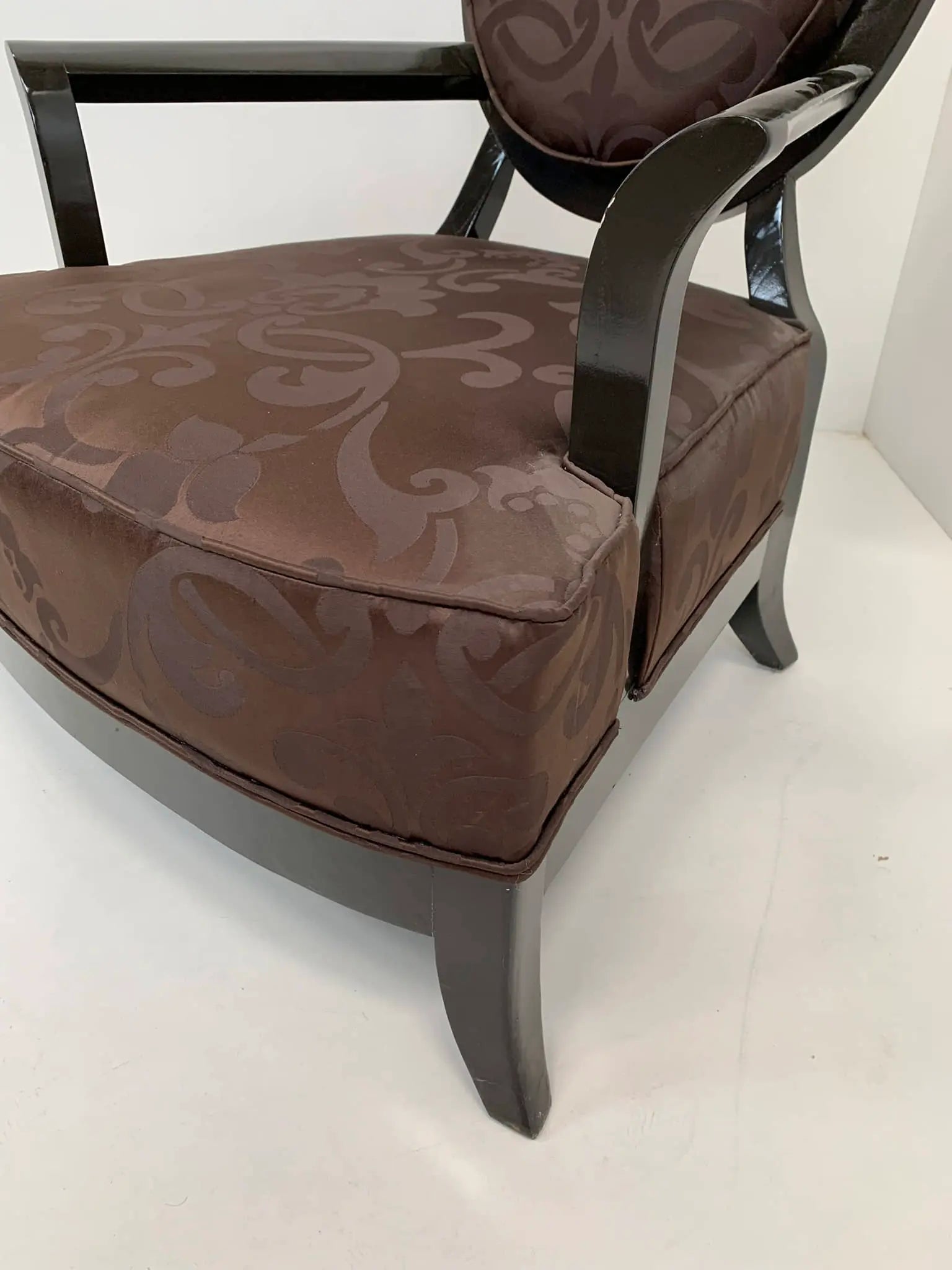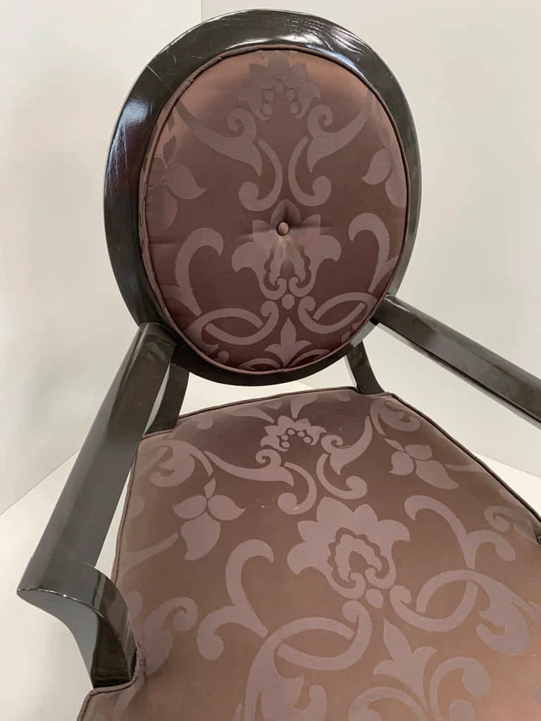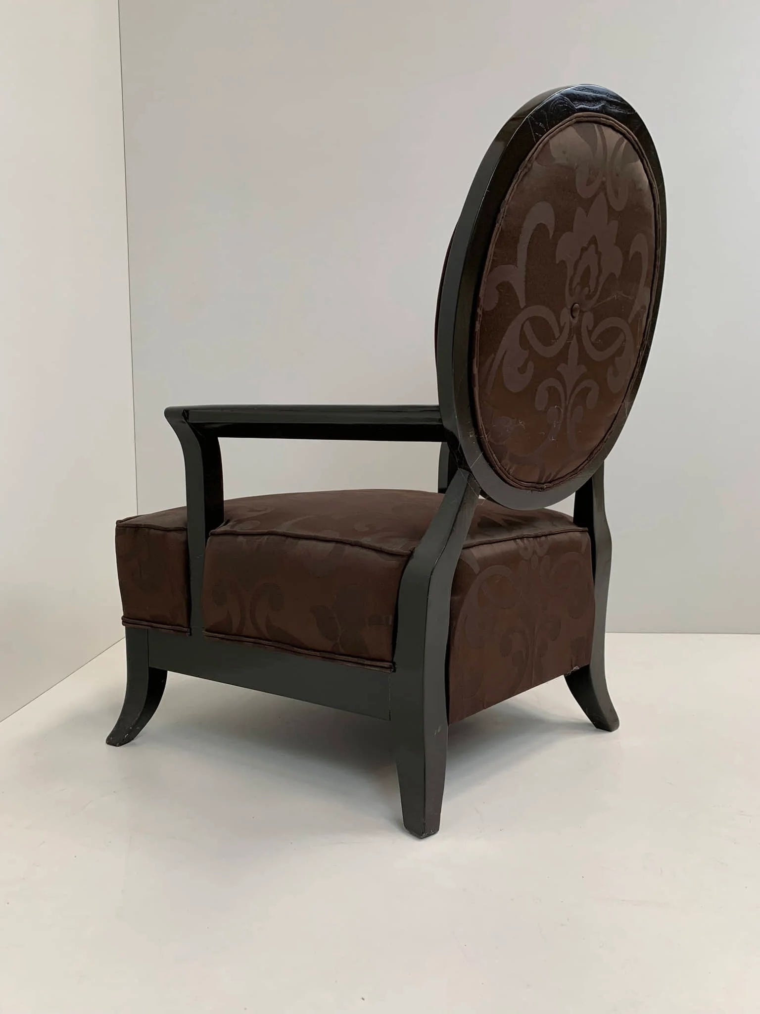 Sillón de madera de haya con la estructura lacada en negro. Tapizado en tono oscuro.
