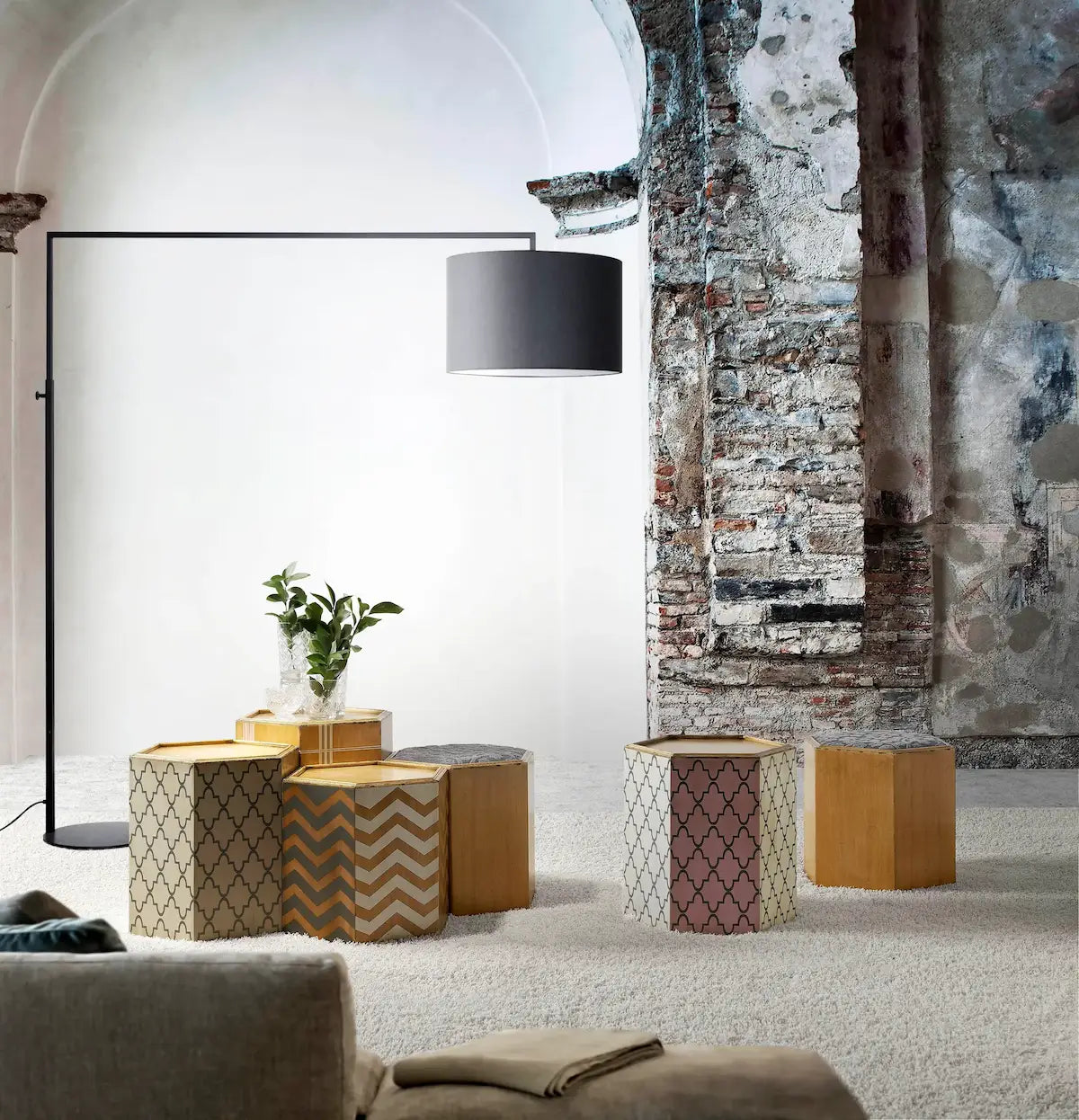 Son mesillas de noche, mesas auxiliares, taburetes ocasionales, son lo que tú quieras que sean. Tienen el don de la ubicuidad y la omnipresencia: se adaptan a todo tipo de espacios y son tan camaleónicas que funcionan igual de bien con un sinfín de acabados. Puedes elegir colores y patrones iguales para los seis lados, intercalarlos o hacer que cada uno tenga su propia cobertura. Incluye los tapizados a tu antojo como otro elemento de atención y exclusividad. Cada mesita Hex cuenta con un interior hueco perfecto para almacenaje al levantar su tapa superior. Personalizable en medida y acabado.