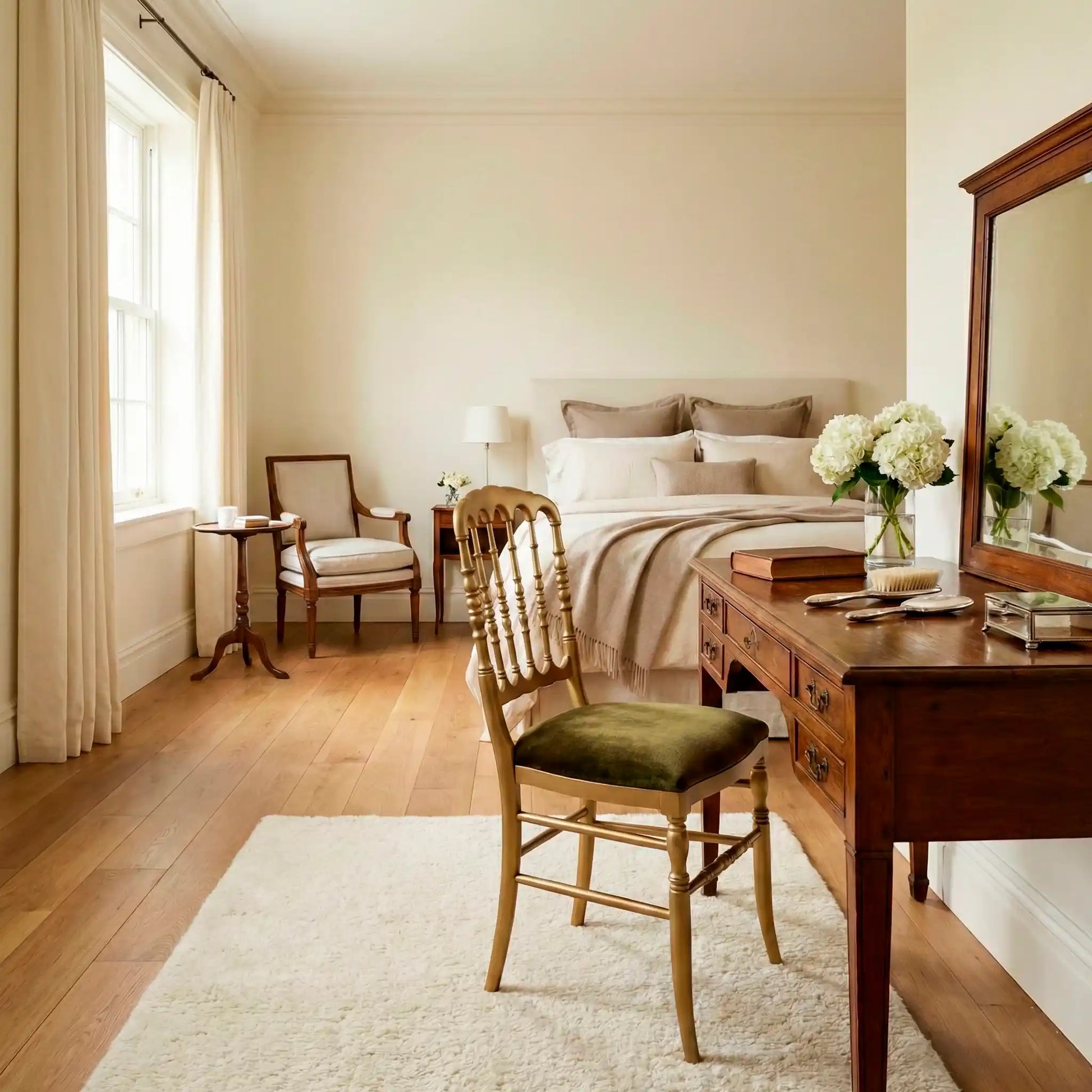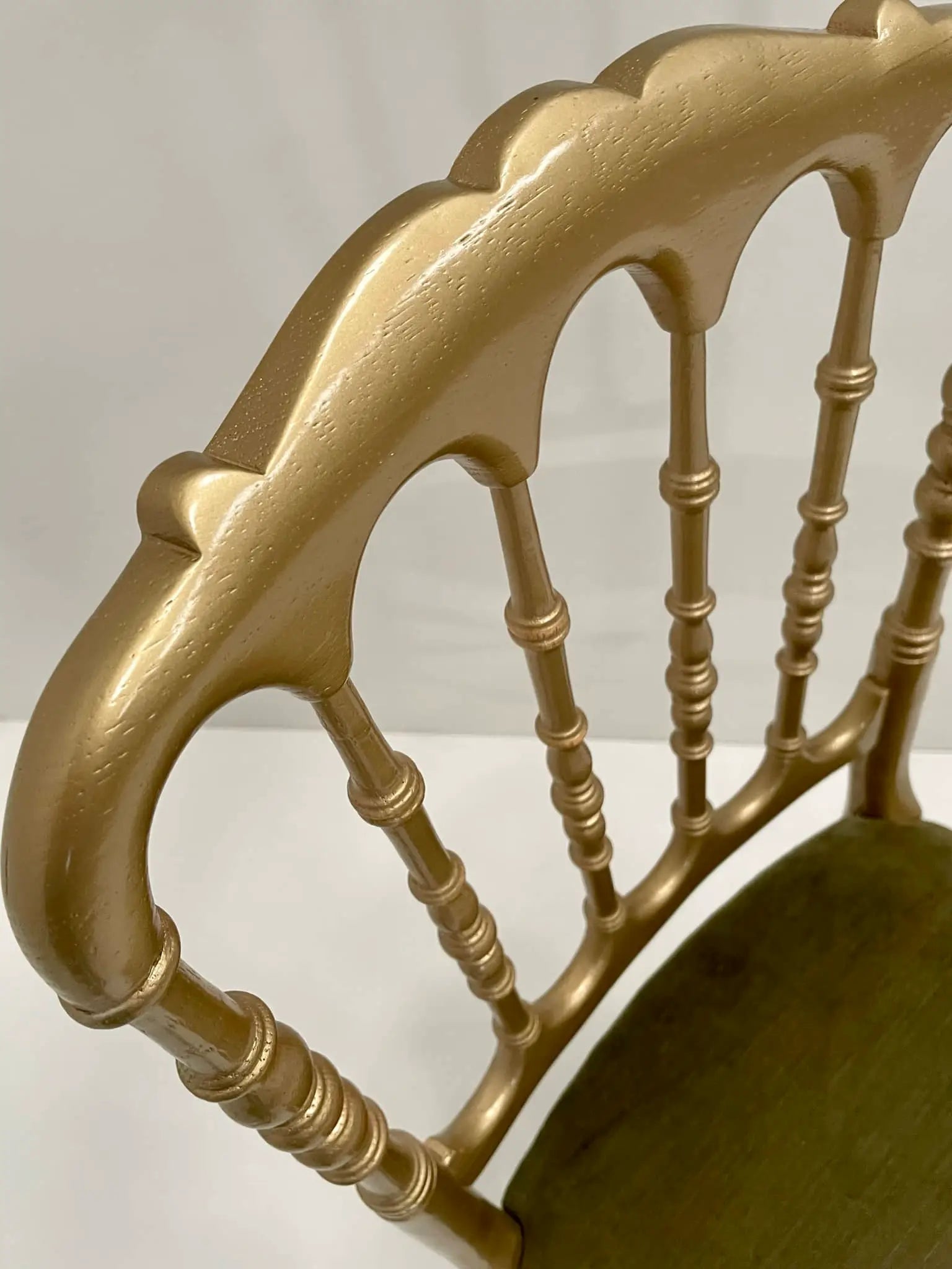 Silla de madera de haya acabada en oro y el tapizado en verde oscuro.